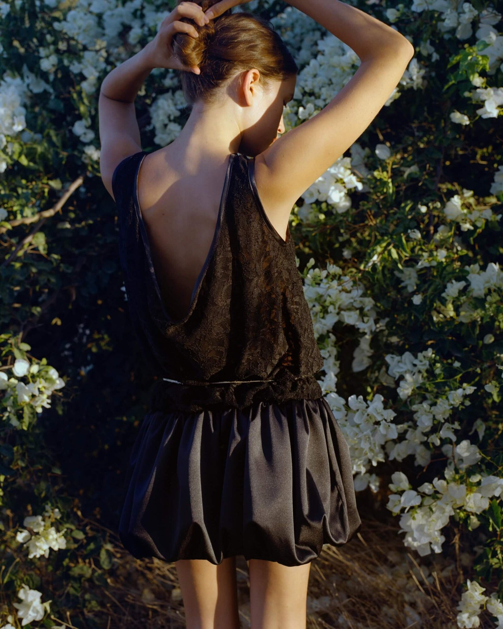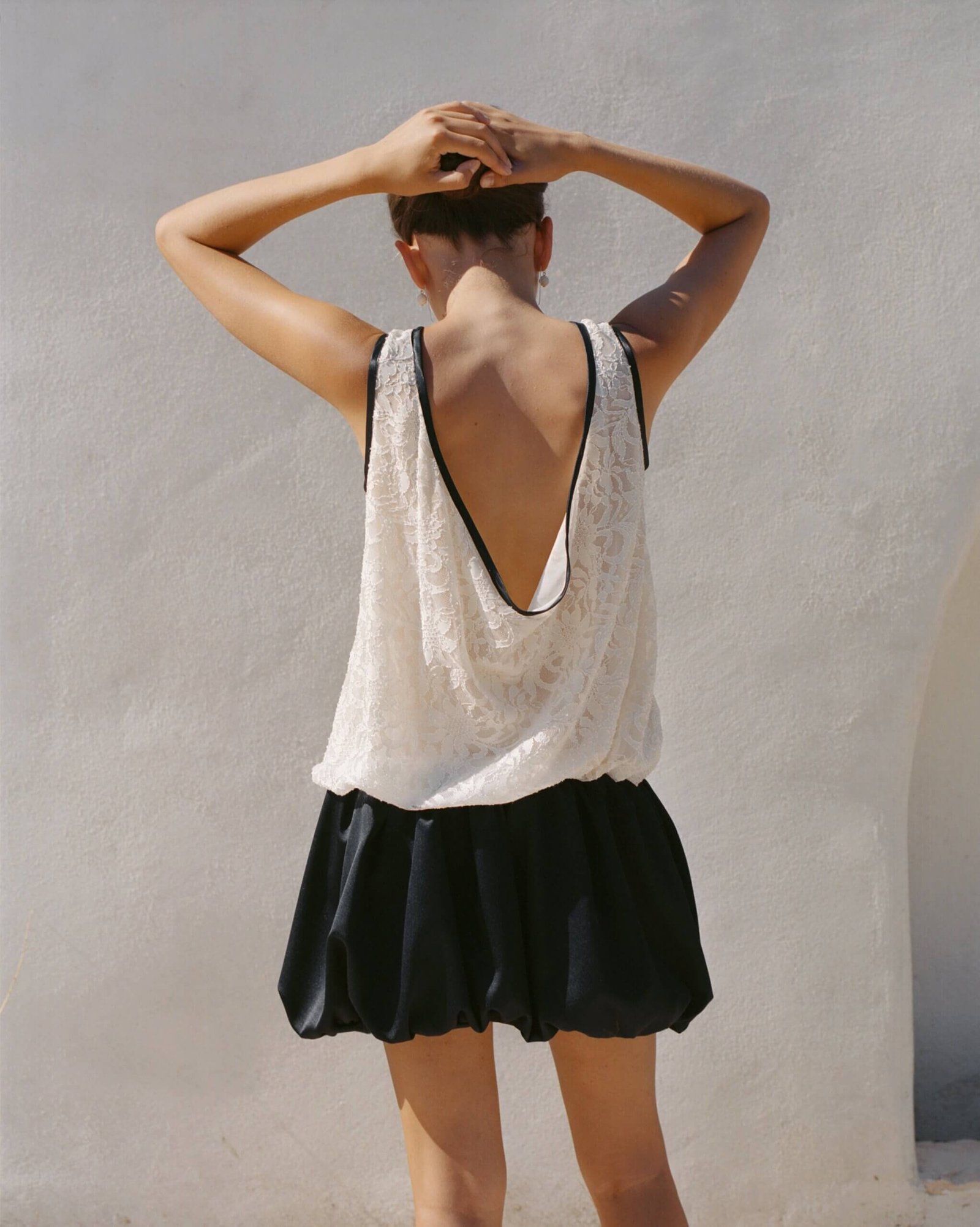 Short, soft, and structured – this sleeveless mini lace dress features a low waist and a softly draped open back.