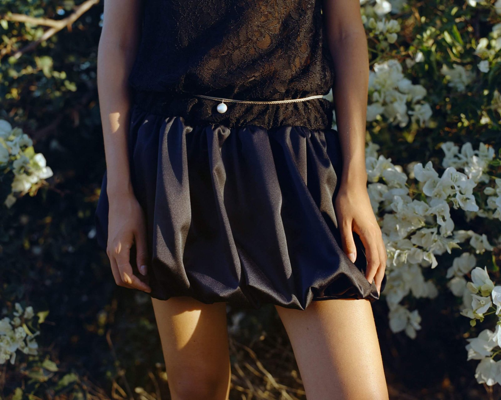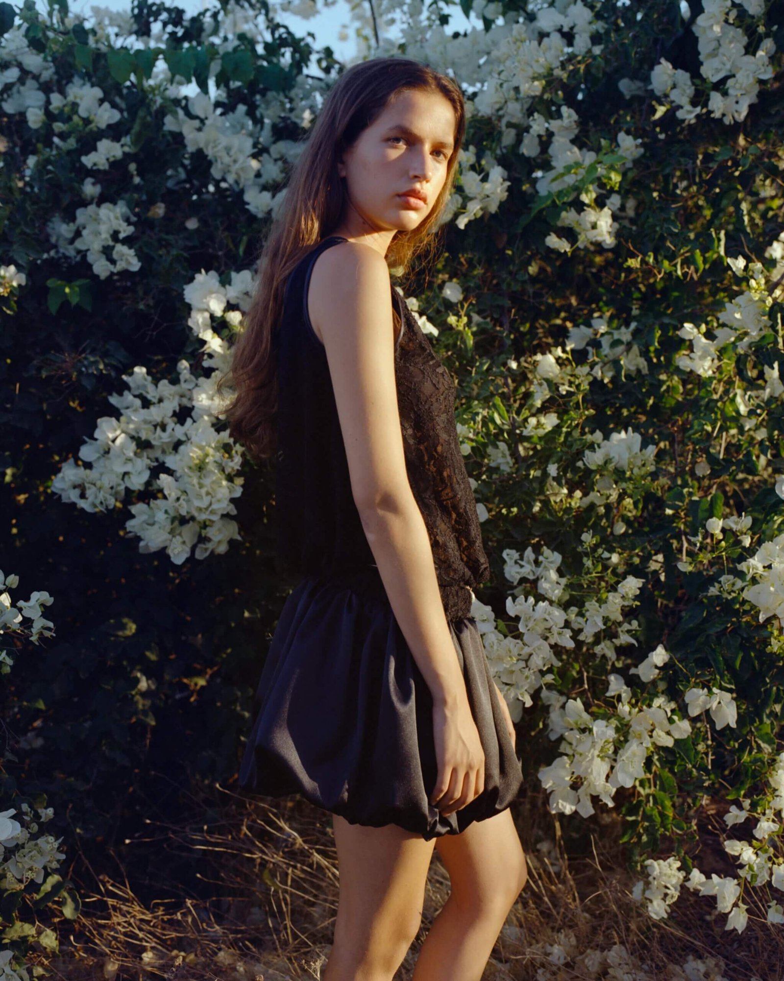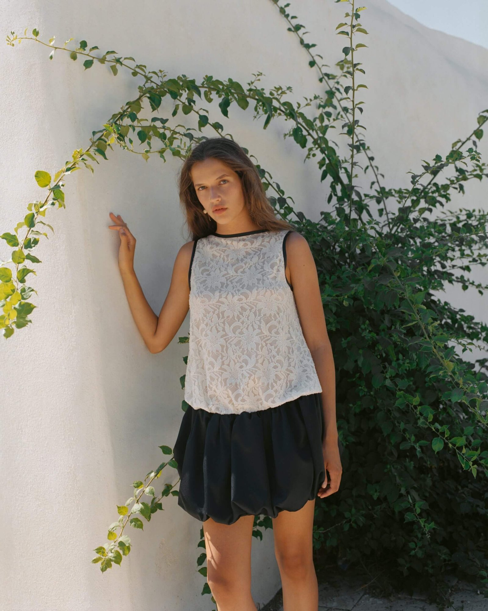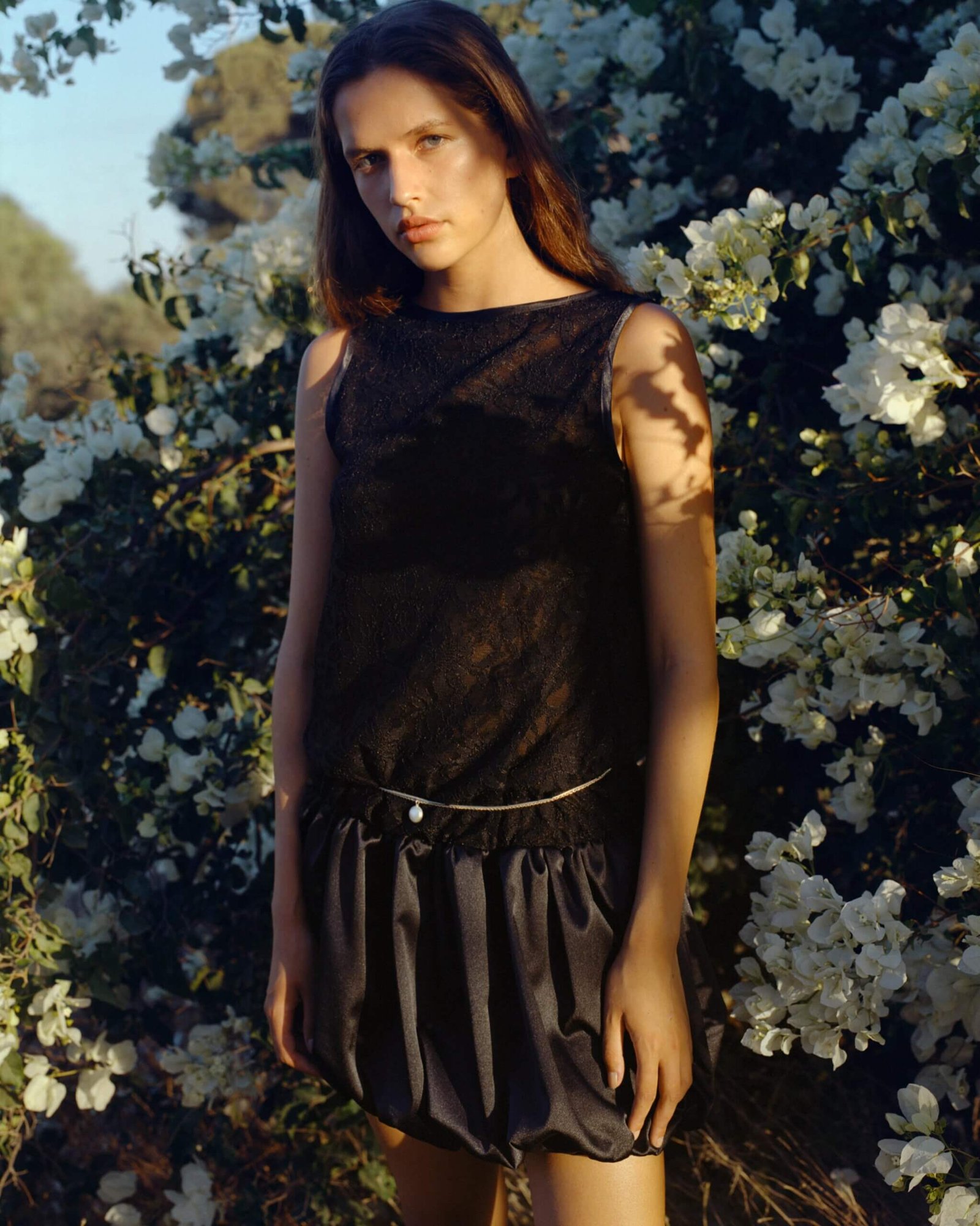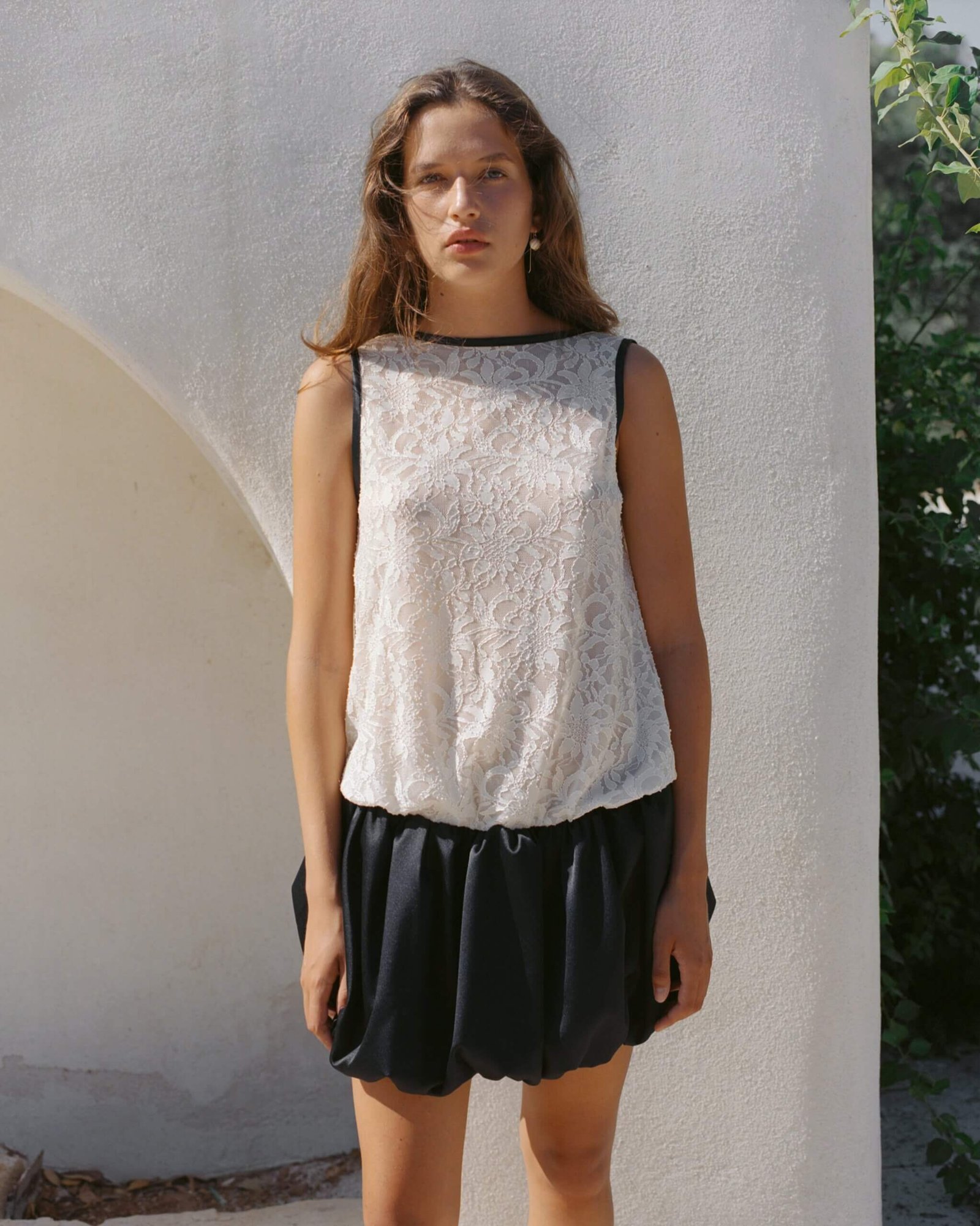 Available in all-black lace, or with a white lace bodice and a voluminous black satin skirt that blooms from the hips.