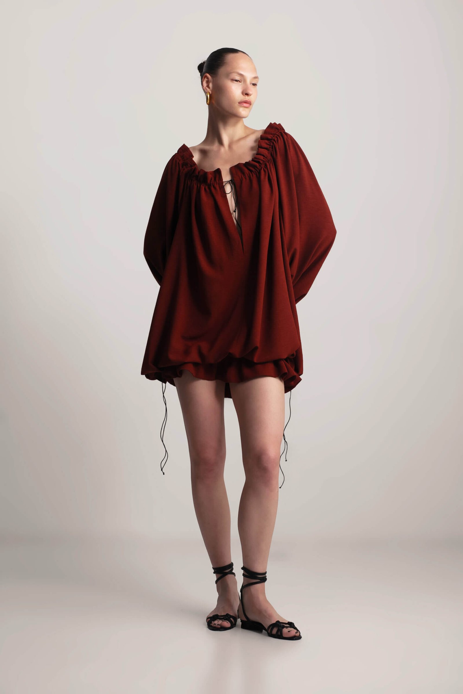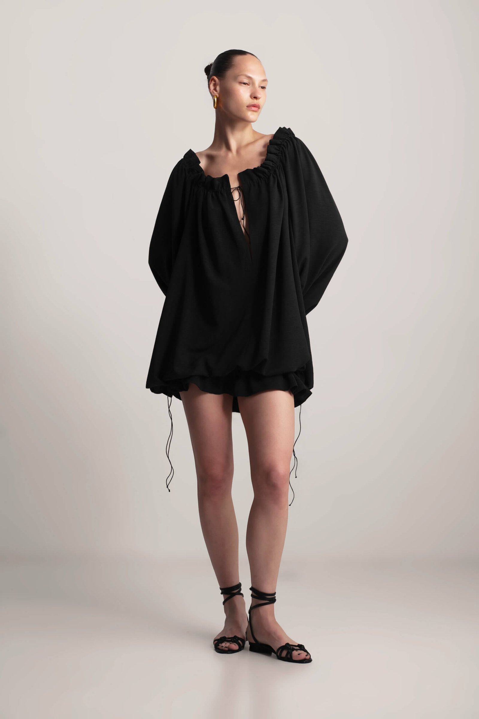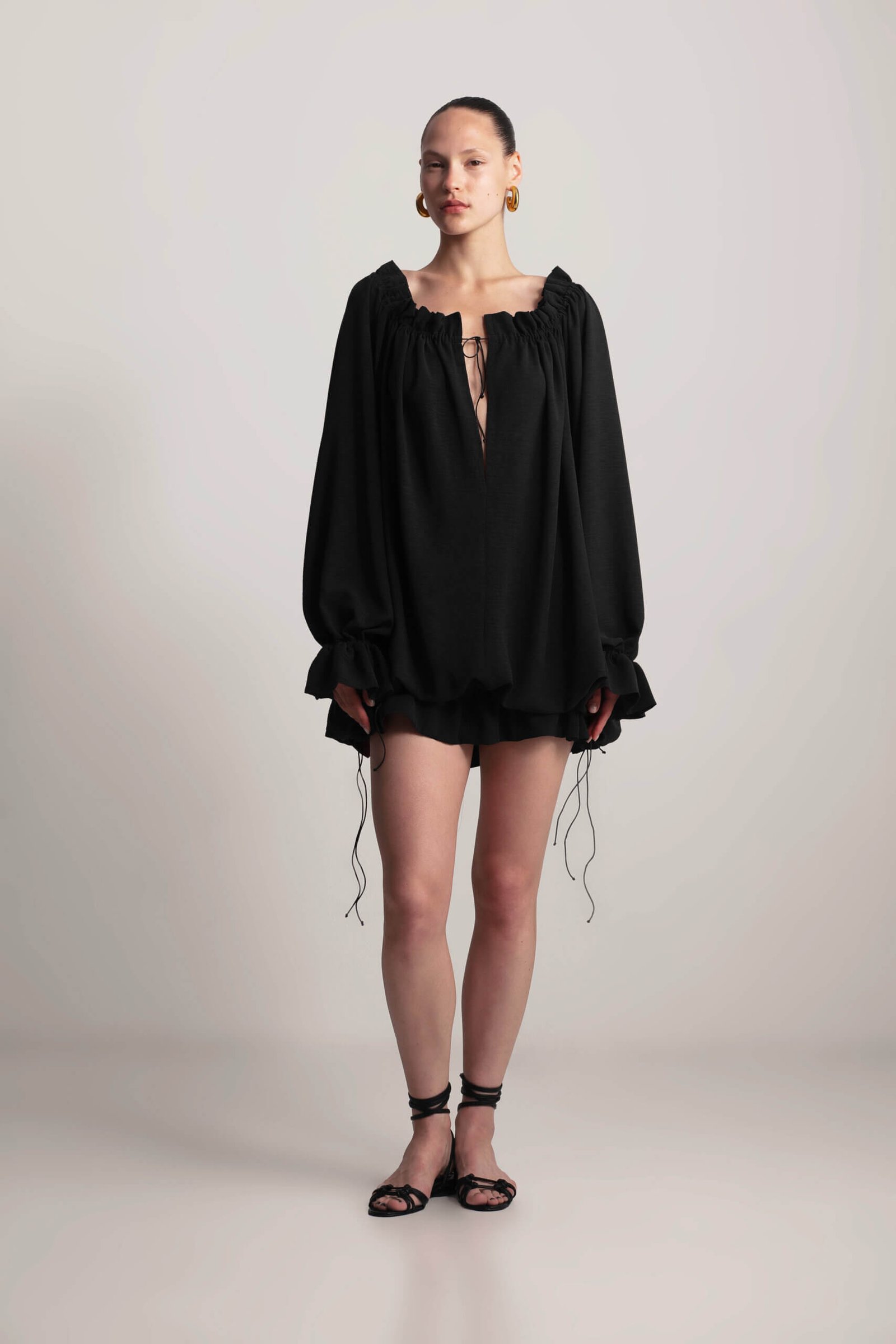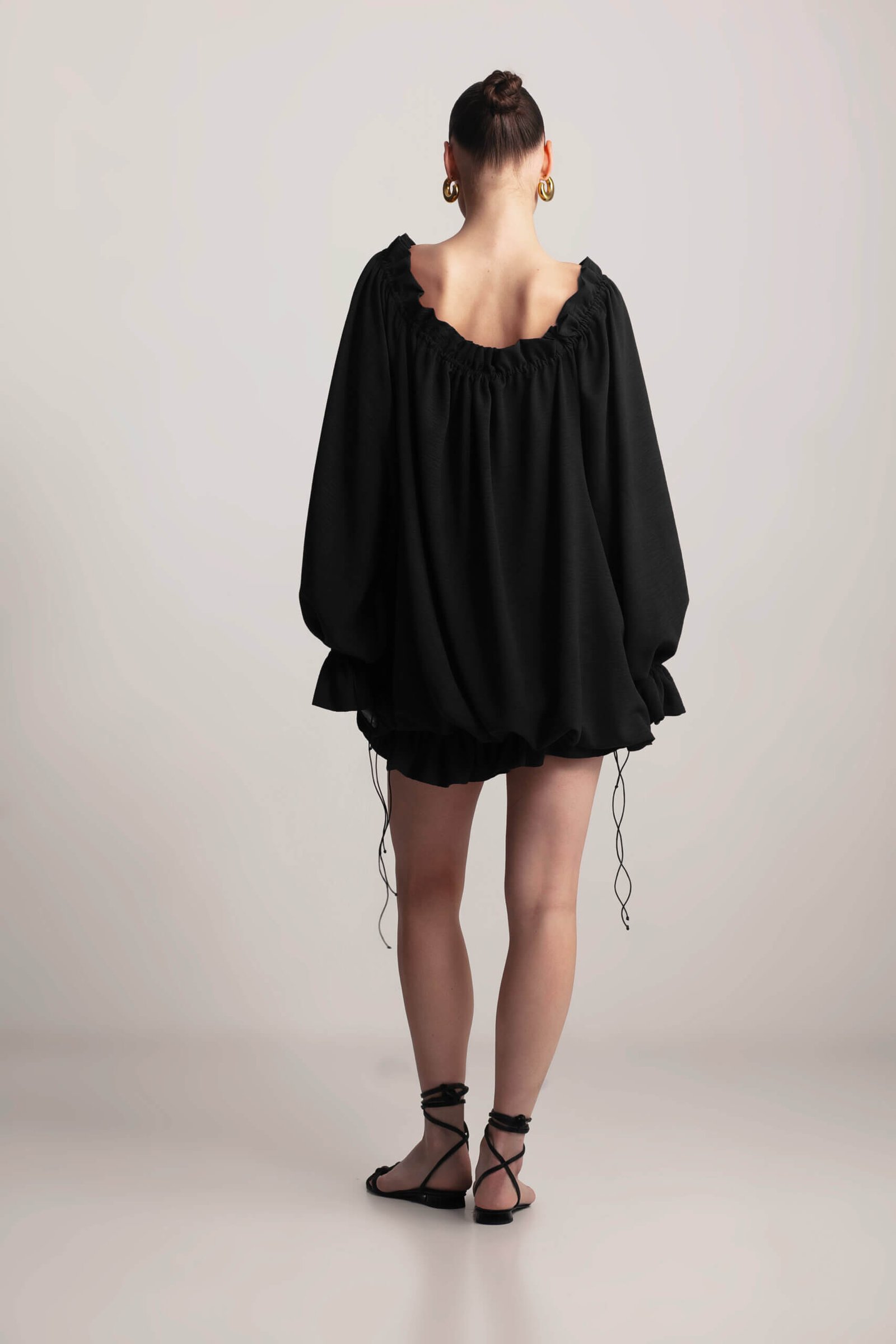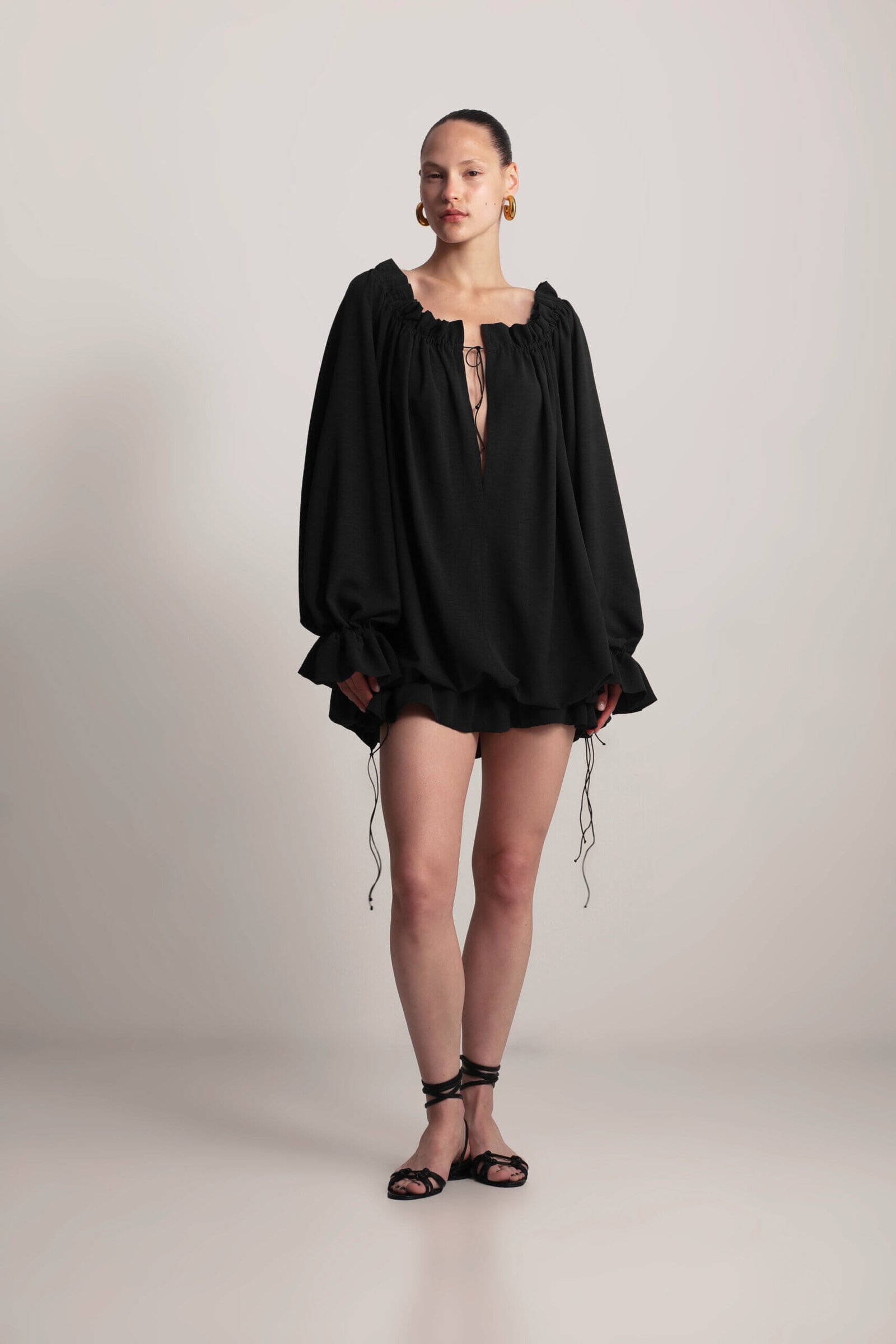 This versatile tunic dress offers a romantic feel with its voluminous puff sleeves and delicate gathering details. Featuring a flattering V-neckline at the front, it’s finished with tie closures at the neckline and lower waist, allowing you to adjust the fit for the perfect look. The design can be worn as a short dress or tunic, making it ideal for various occasions. Its romantic and feminine silhouette can be easily customized, perfect for dressing up or down.
