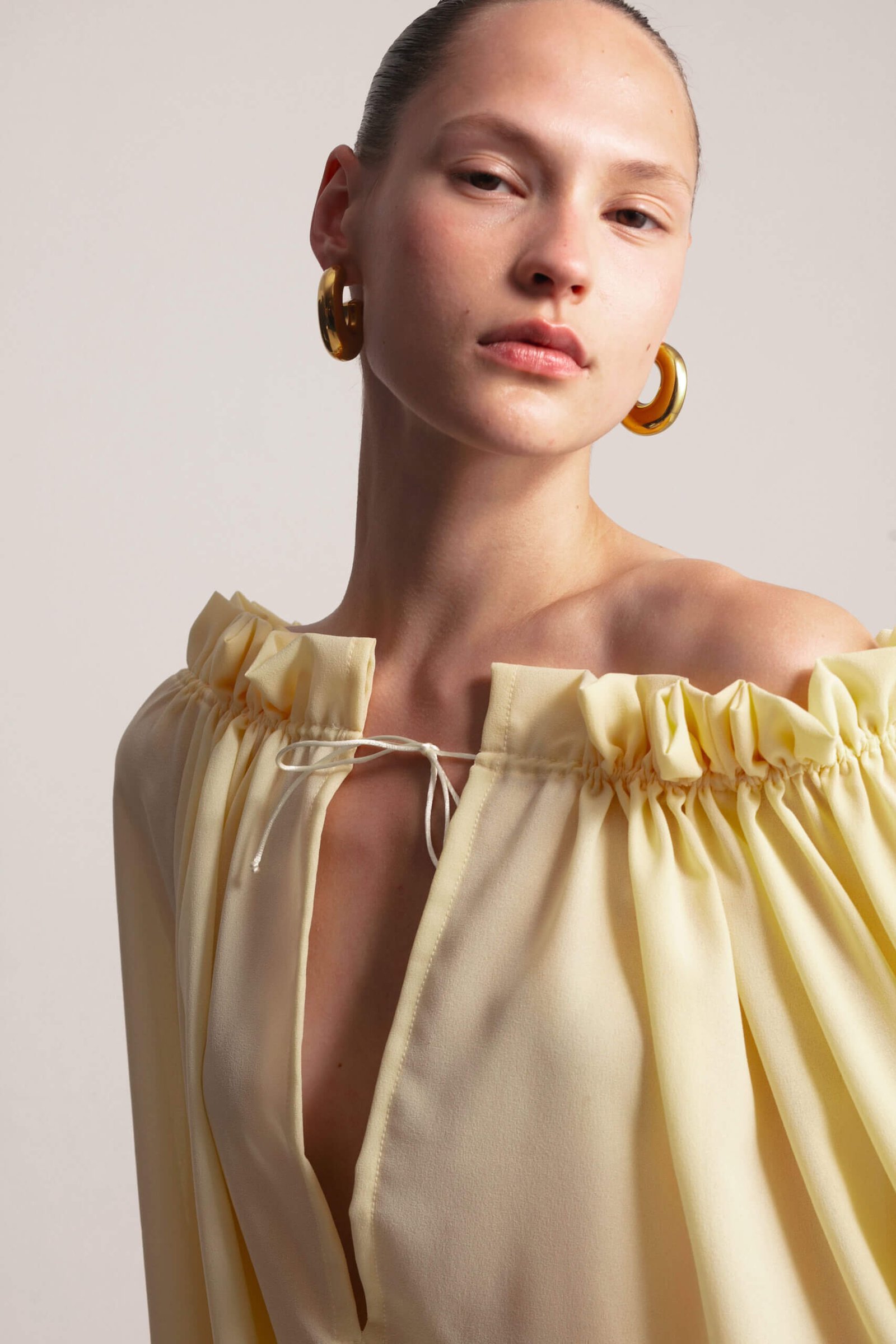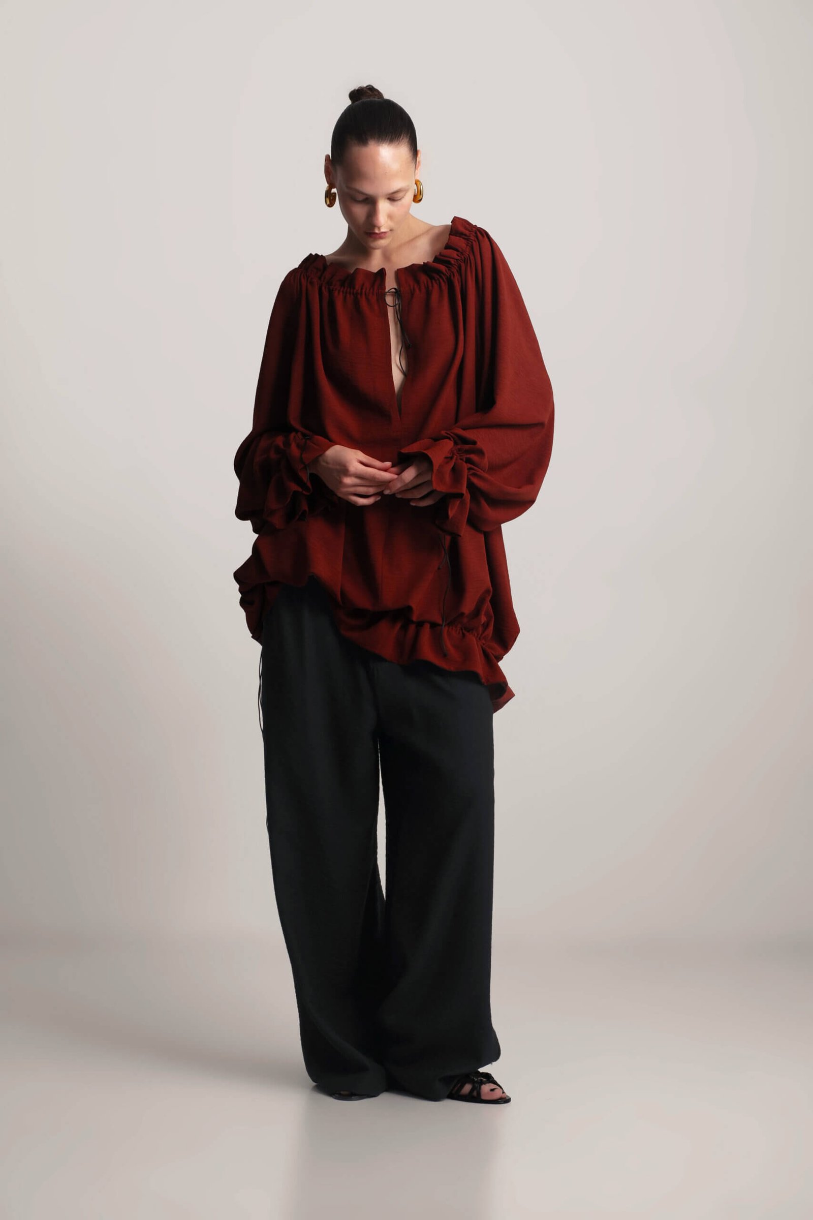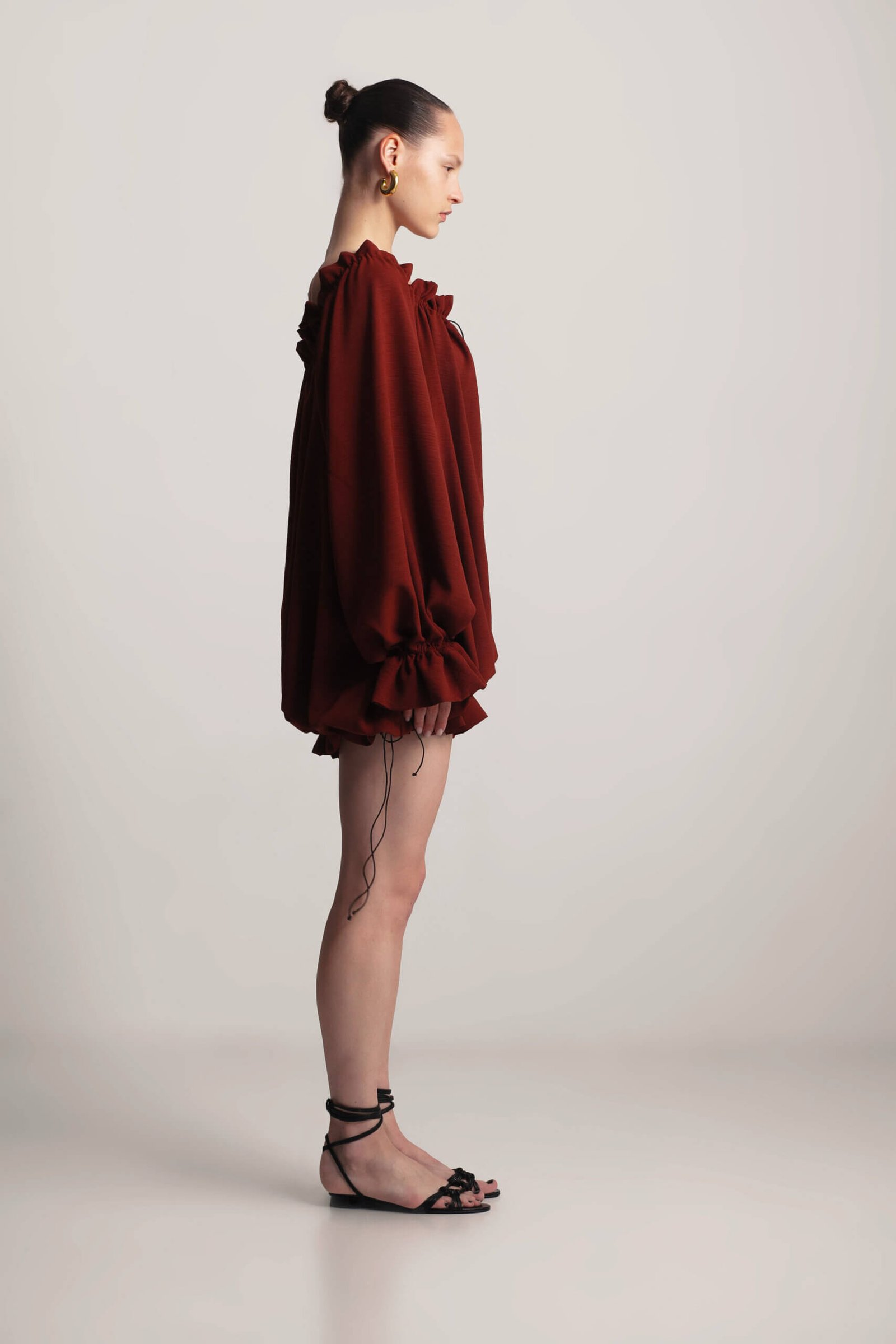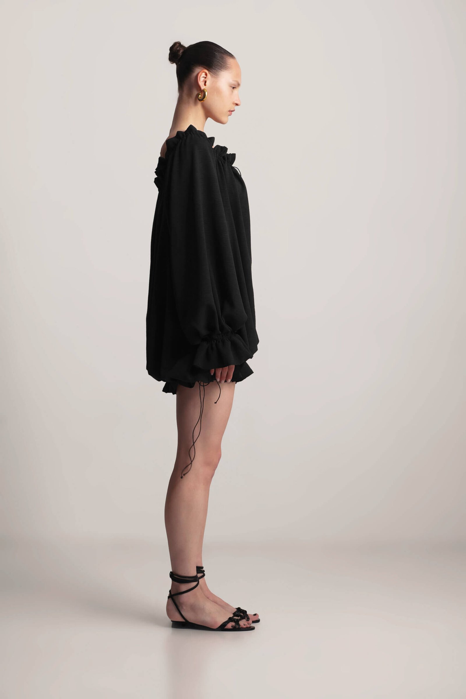 This versatile tunic dress offers a romantic feel with its voluminous puff sleeves and delicate gathering details. Featuring a flattering V-neckline at the front, it’s finished with tie closures at the neckline and lower waist, allowing you to adjust the fit for the perfect look. The design can be worn as a short dress or tunic, making it ideal for various occasions. Its romantic and feminine silhouette can be easily customized, perfect for dressing up or down.