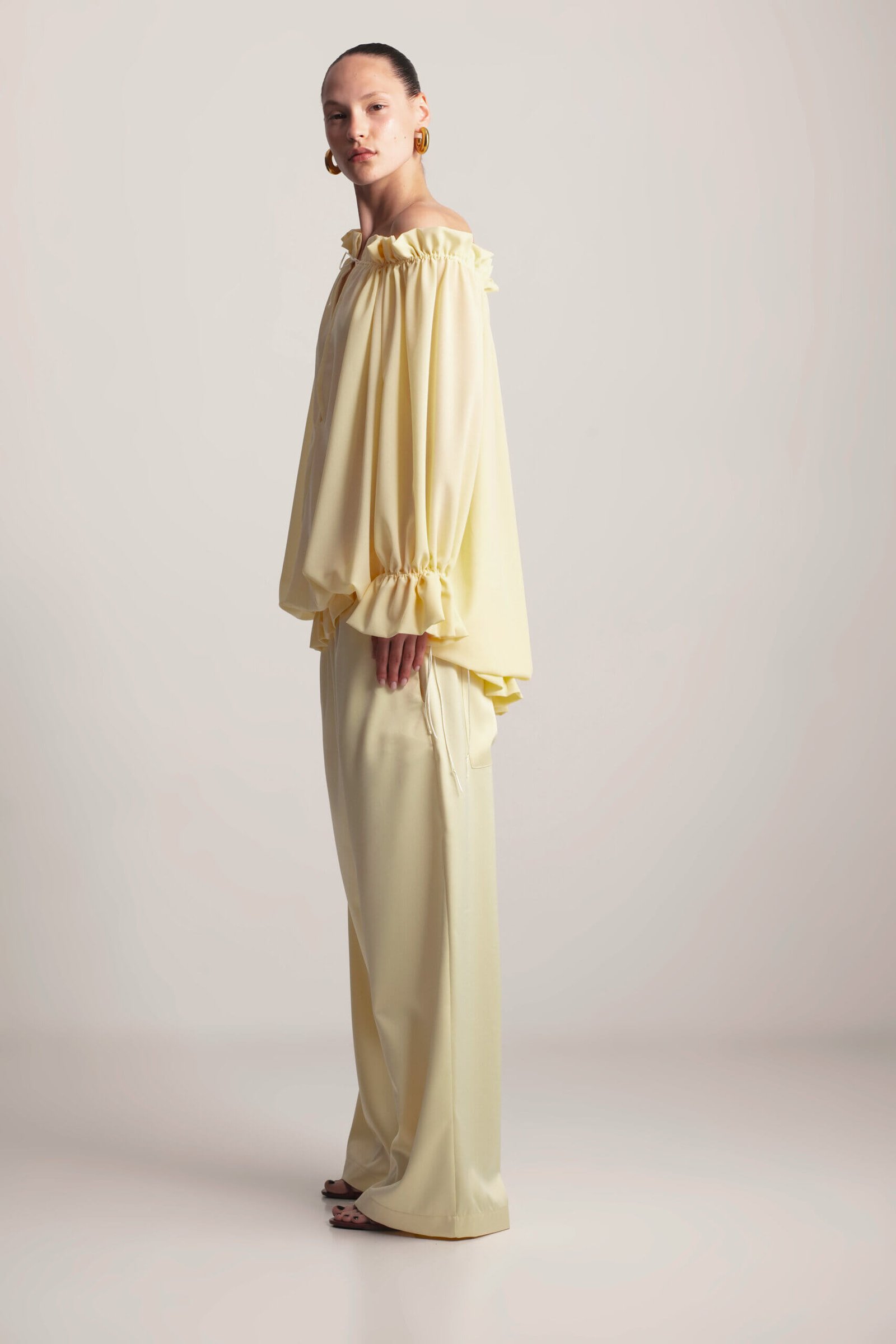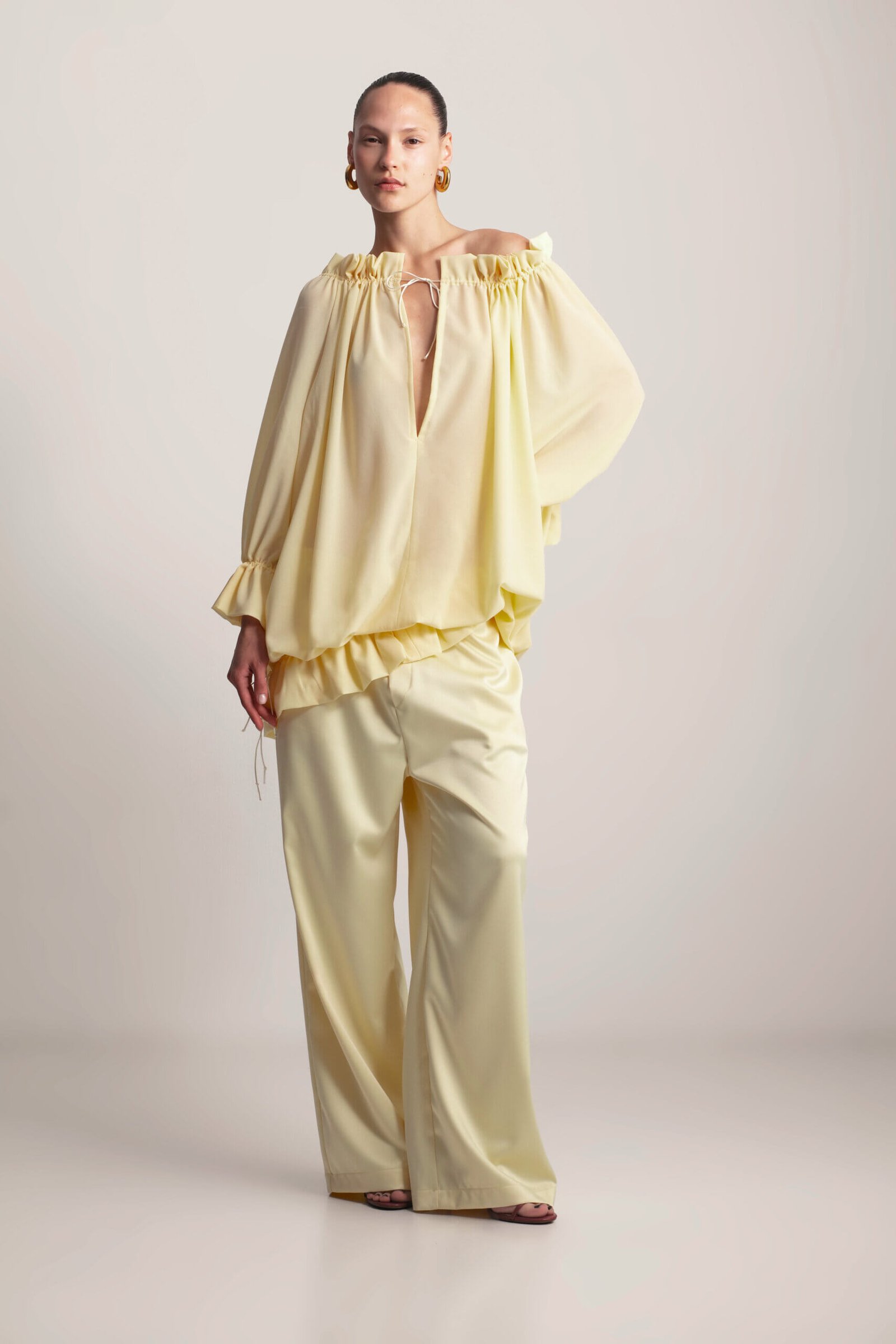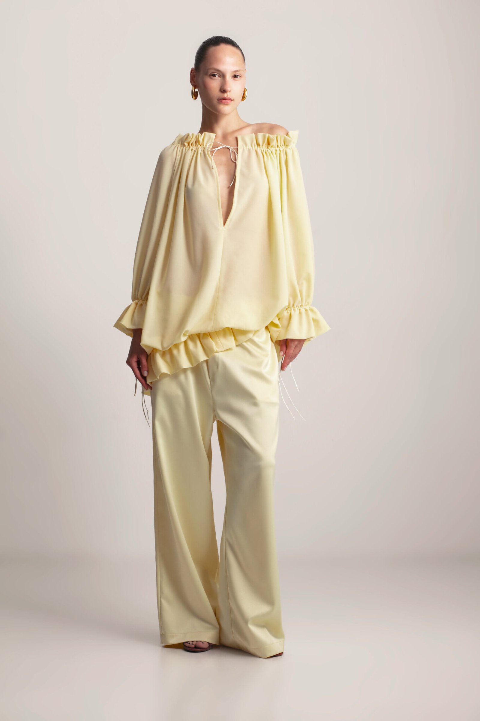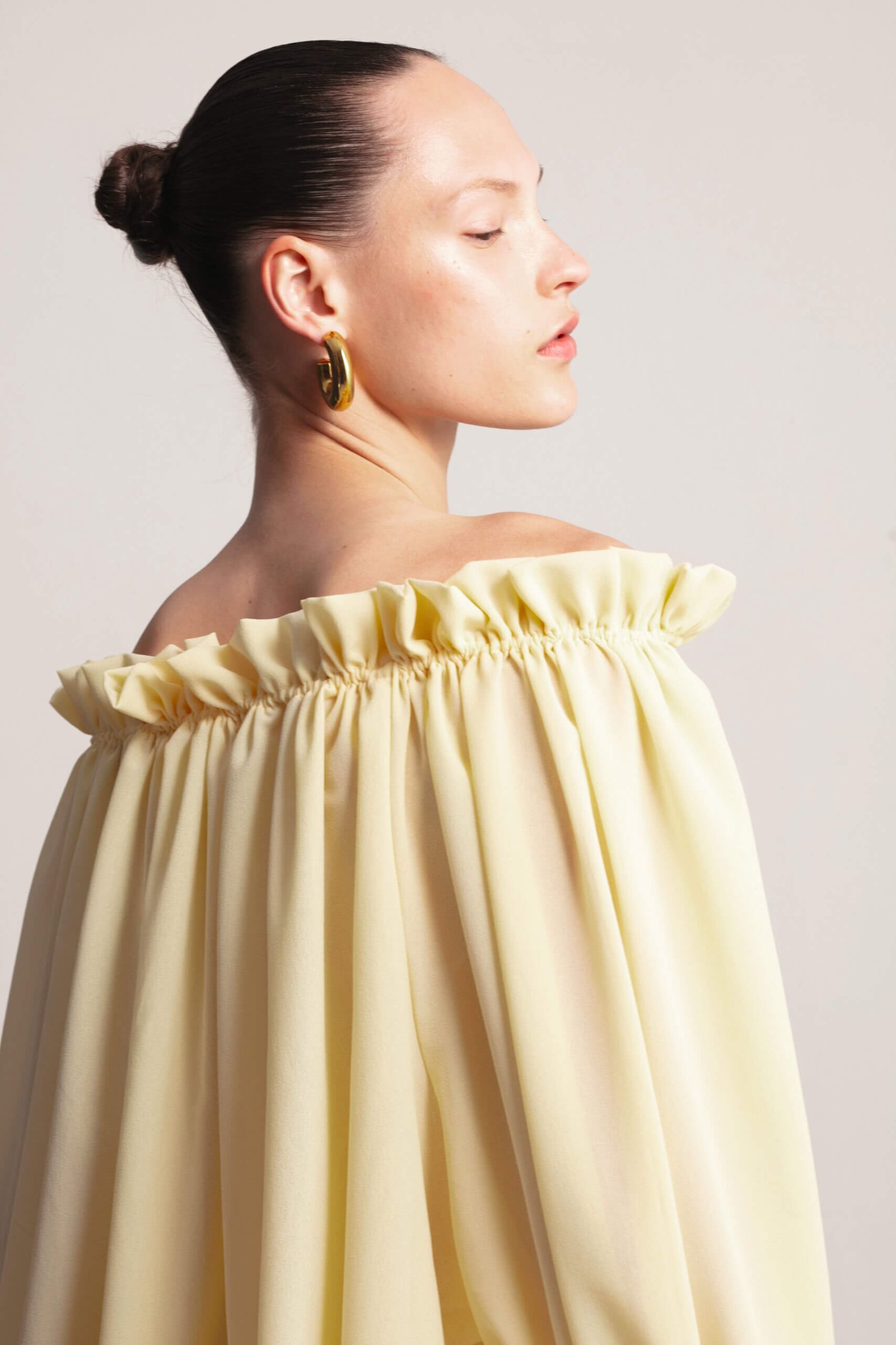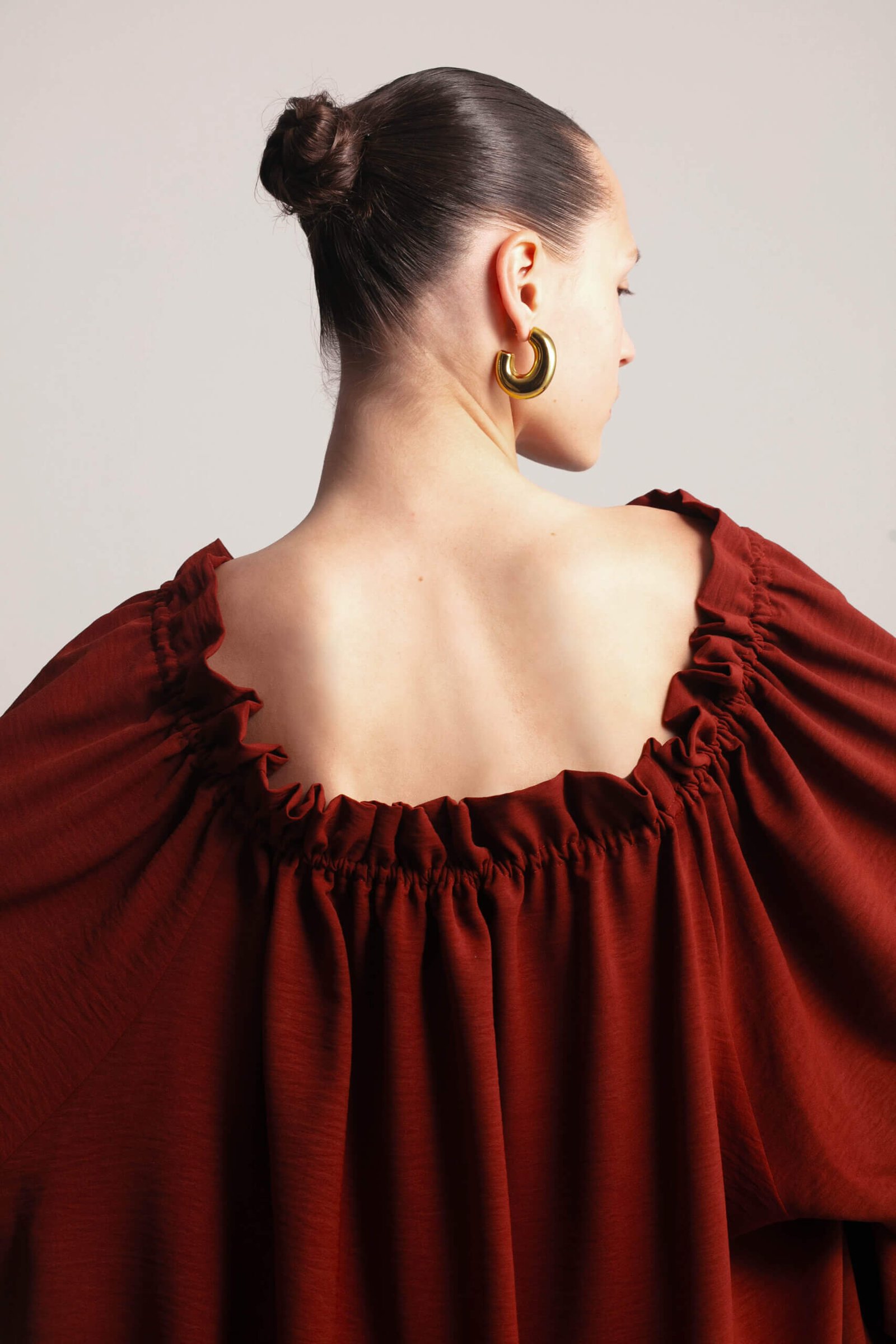 This versatile tunic dress offers a romantic feel with its voluminous puff sleeves and delicate gathering details. Featuring a flattering V-neckline at the front, it’s finished with tie closures at the neckline and lower waist, allowing you to adjust the fit for the perfect look. The design can be worn as a short dress or tunic, making it ideal for various occasions. Its romantic and feminine silhouette can be easily customized, perfect for dressing up or down.