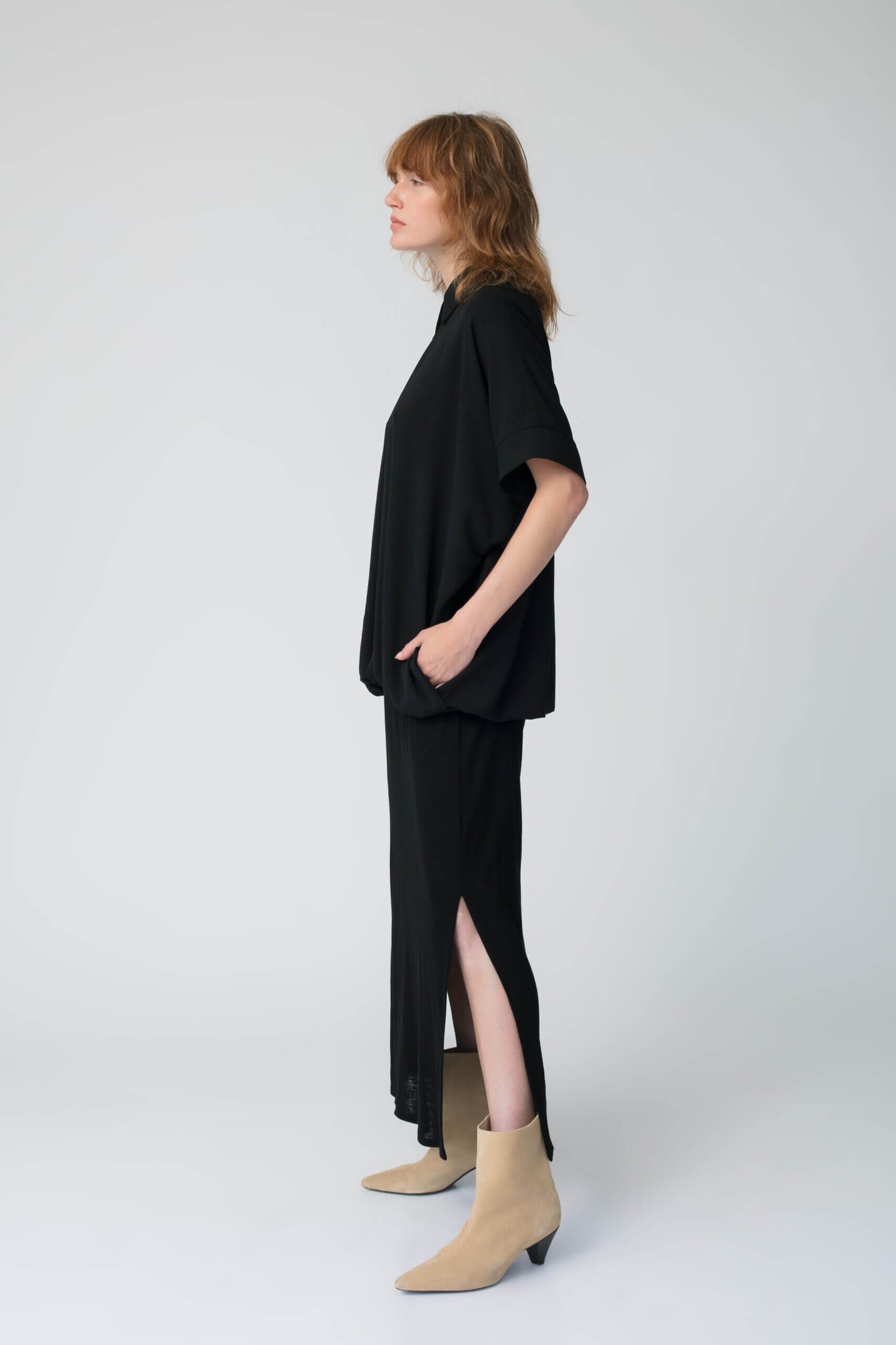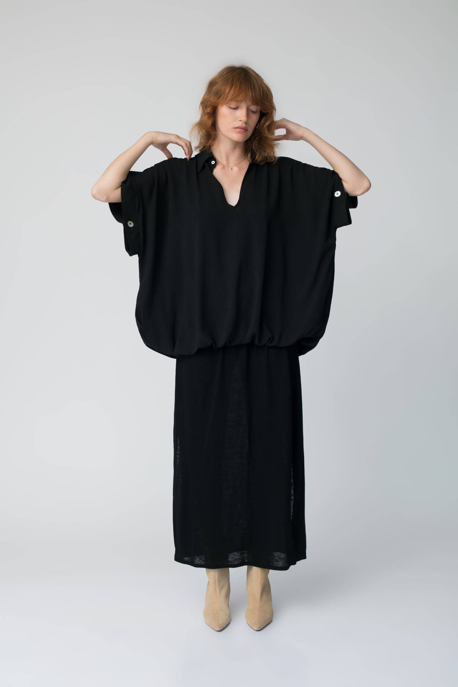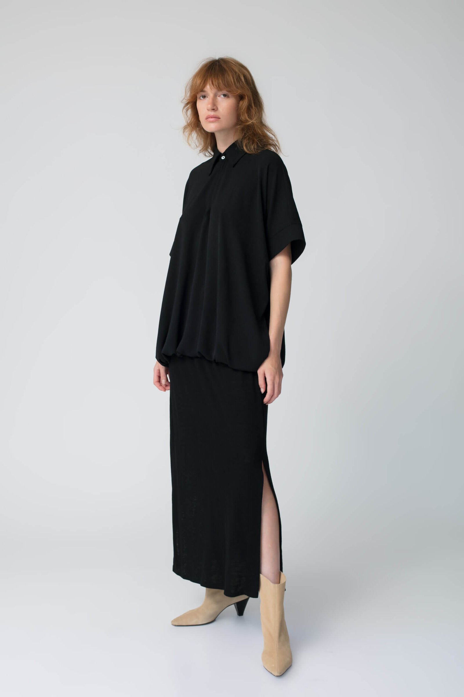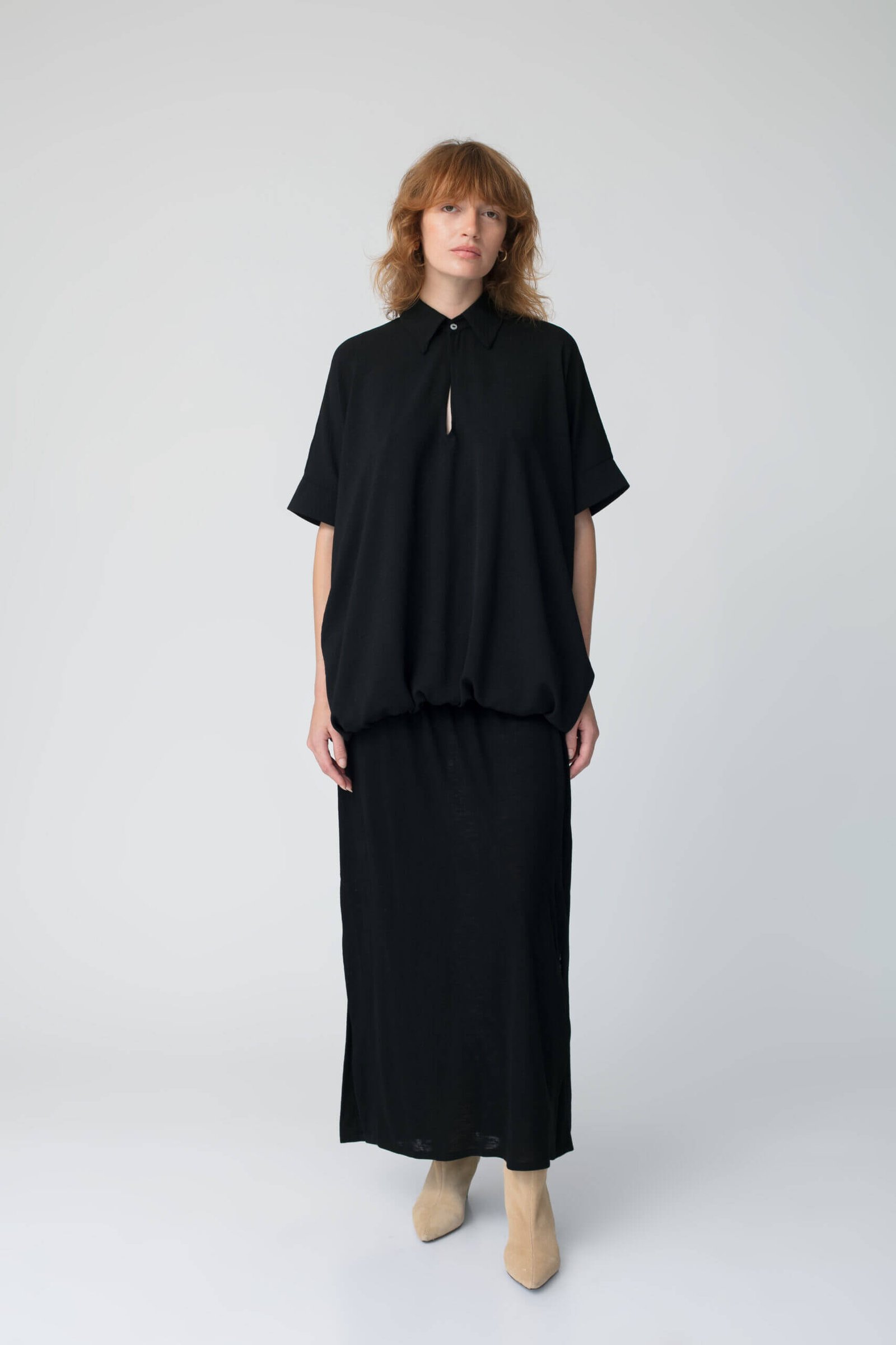 Constructed for a voluminous silhouette, this dress is cut from a combination of crepe and a soft knit. The gathered top has a sharp collar that falls to a V-neckline. The skirt contours your figure and adds structure to the fluid silhouette. Note the confidence-inspiring details – mother of pearl buttons, elasticated waist and side slits. Available in 2 colors: Cloud and Black Onyx.