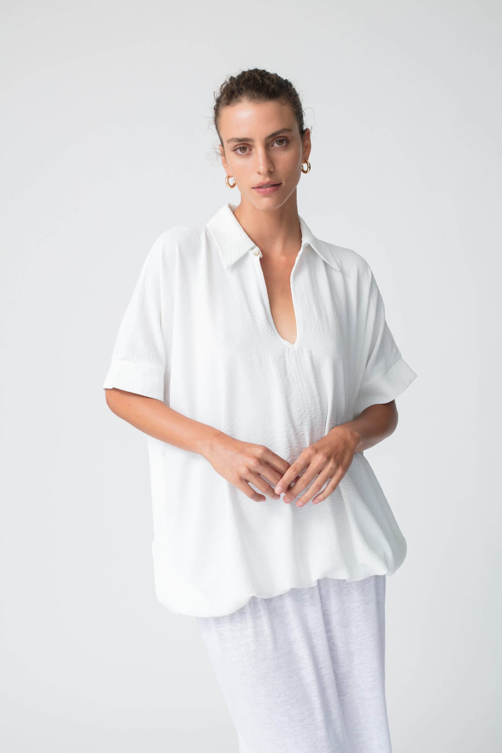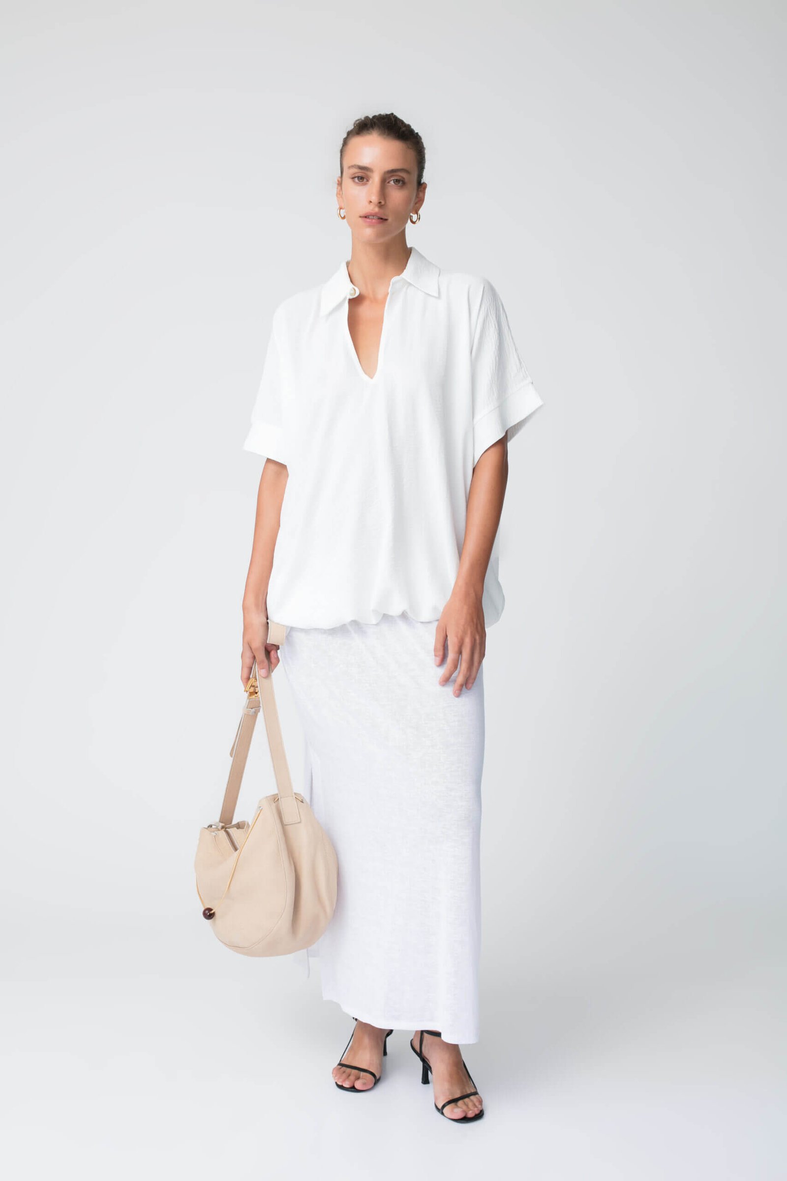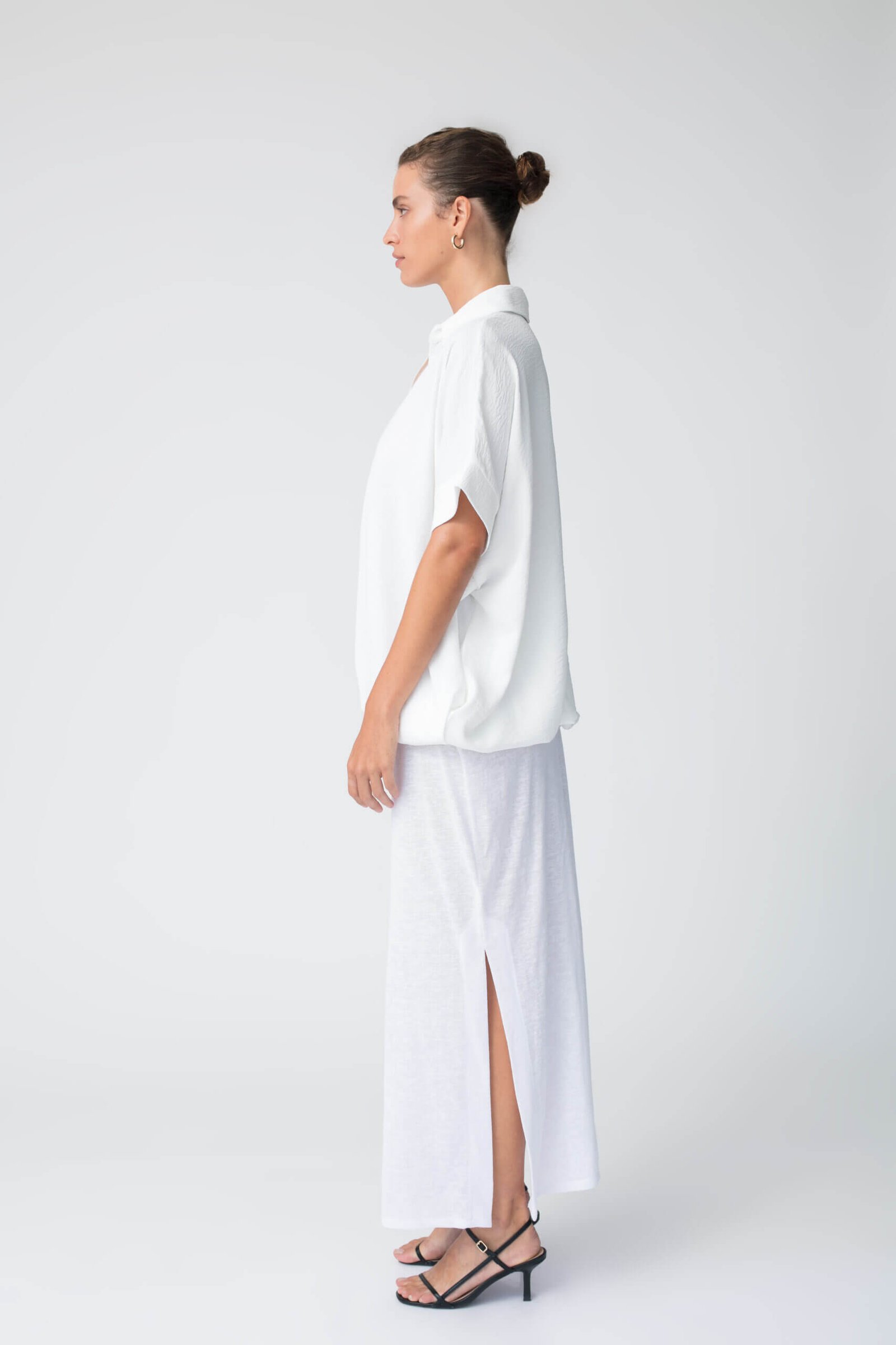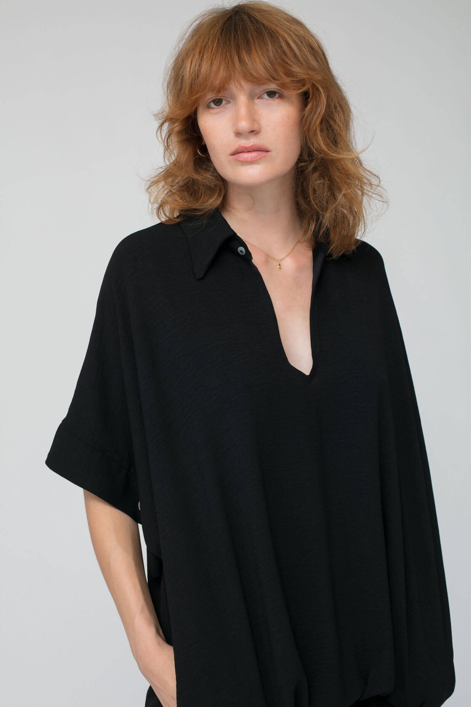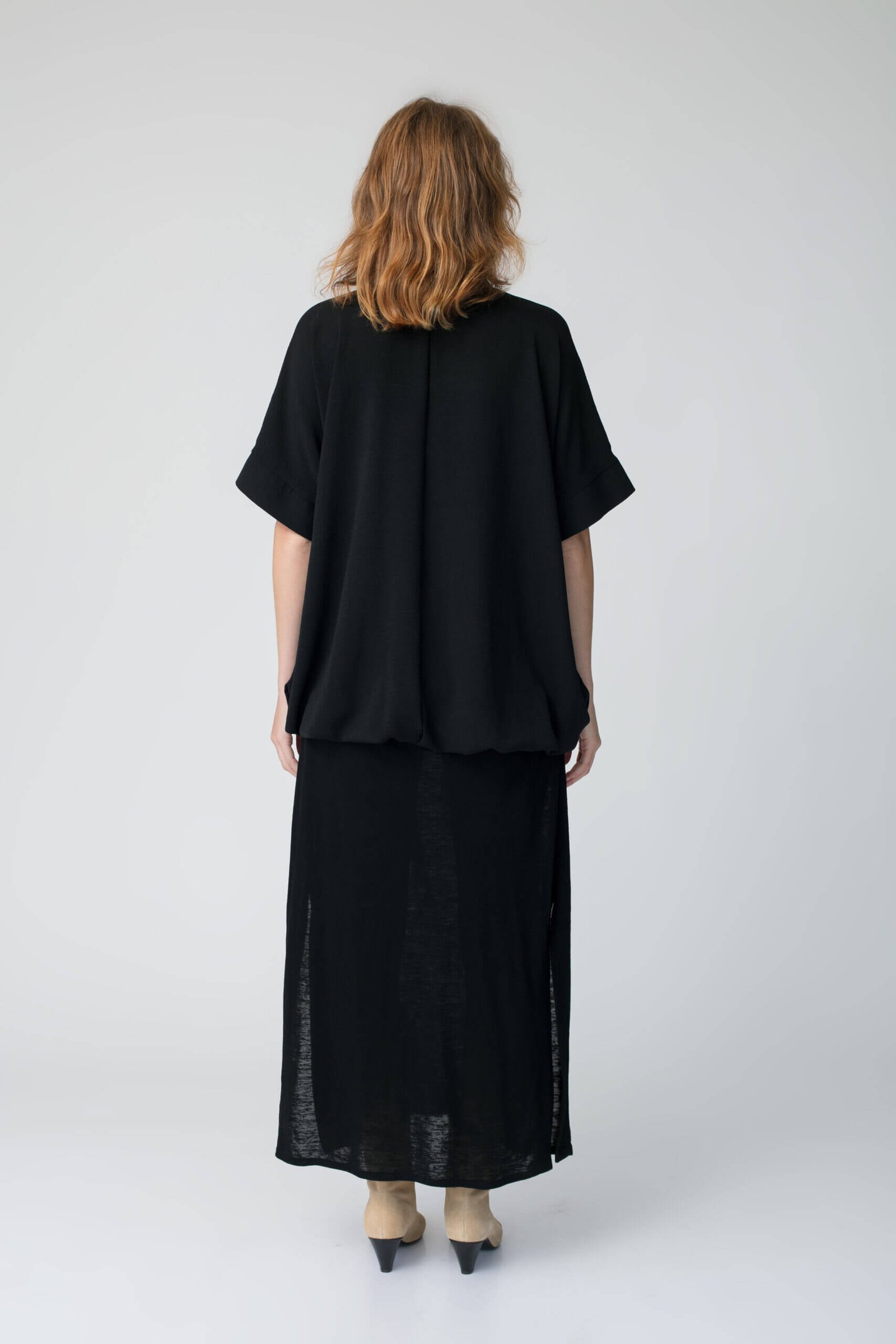 Constructed for a voluminous silhouette, this dress is cut from a combination of crepe and a soft knit. The gathered top has a sharp collar that falls to a V-neckline. The skirt contours your figure and adds structure to the fluid silhouette. Note the confidence-inspiring details – mother of pearl buttons, elasticated waist and side slits. Available in 2 colors: Cloud and Black Onyx.