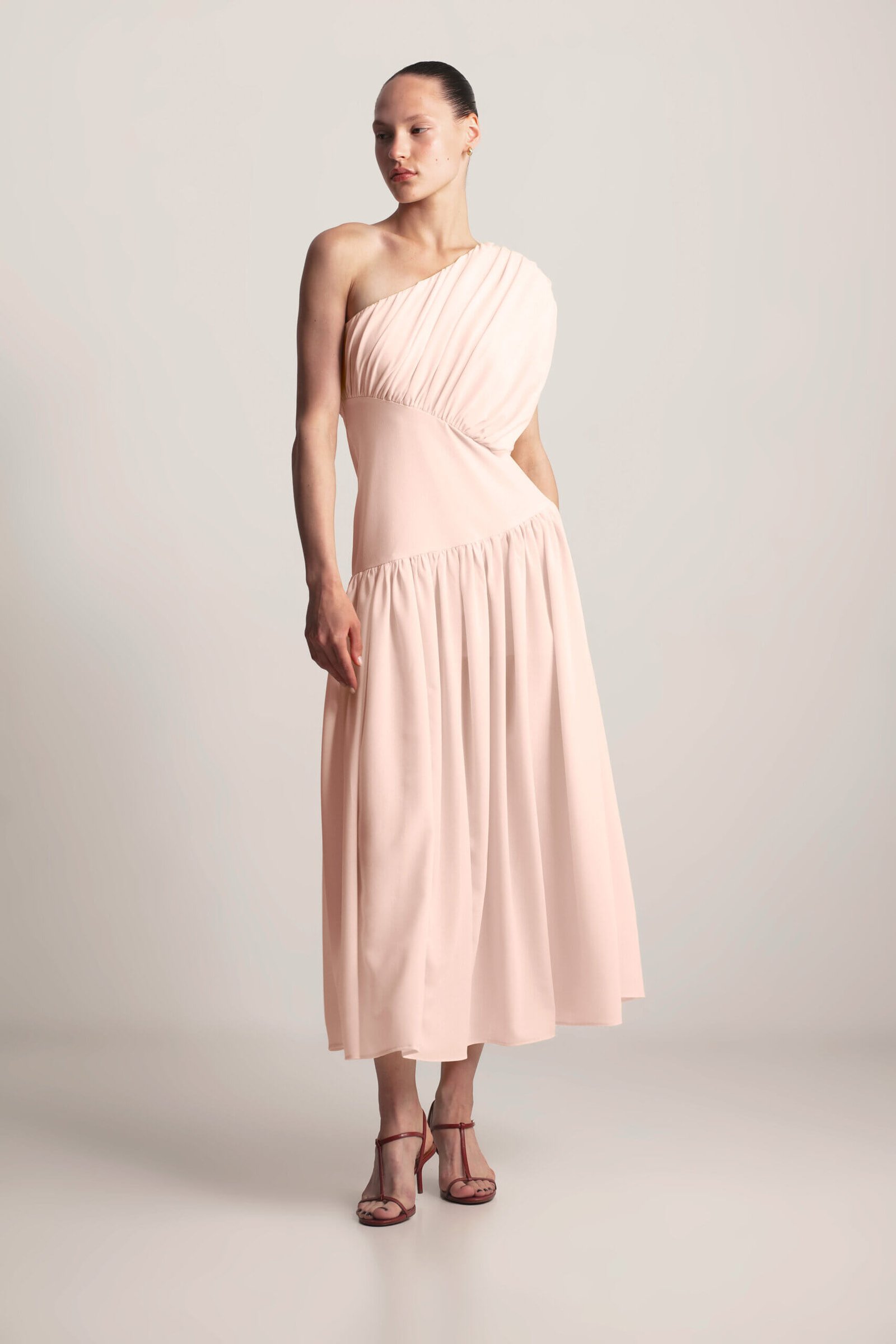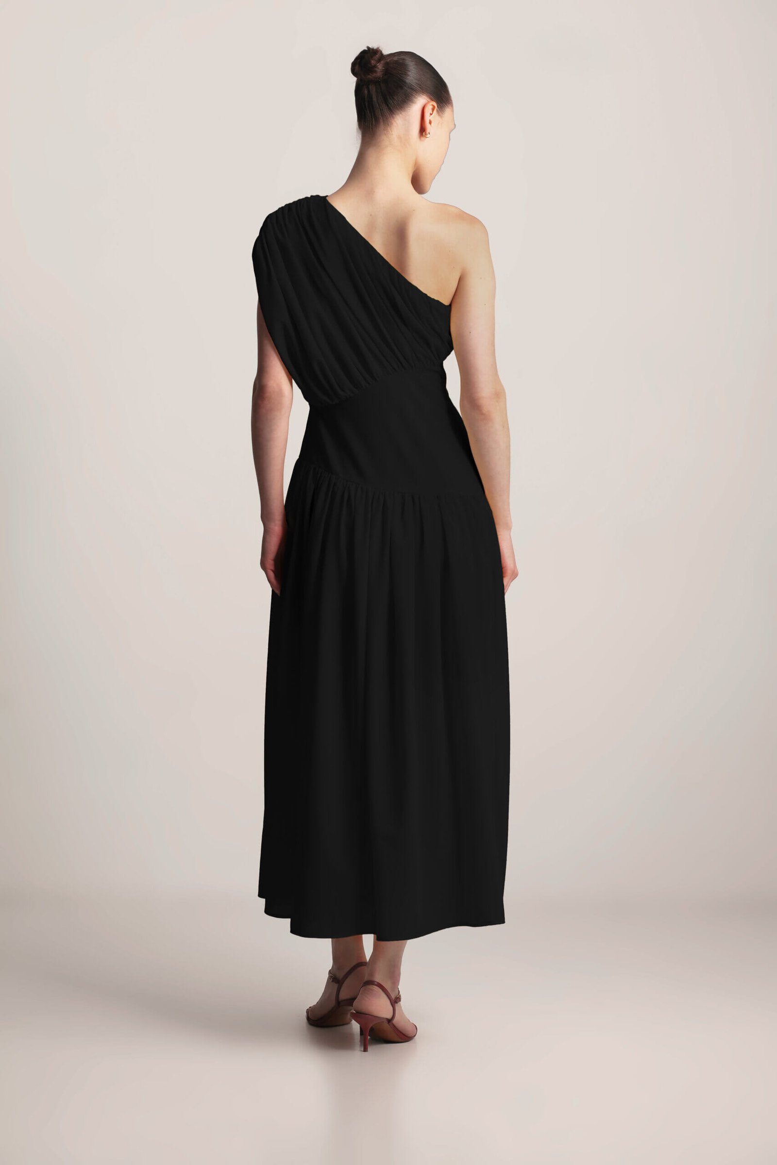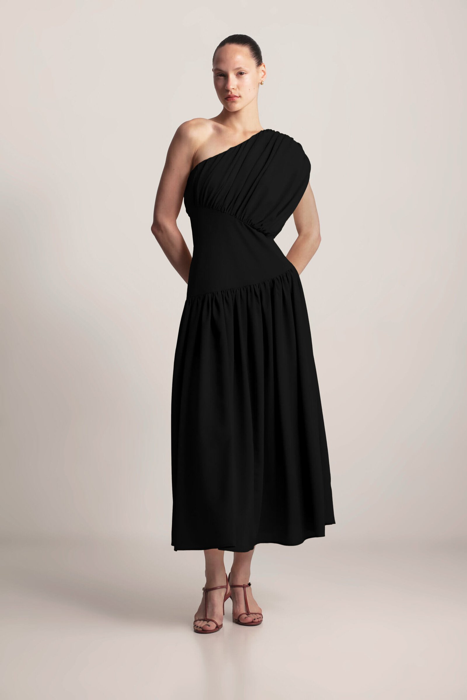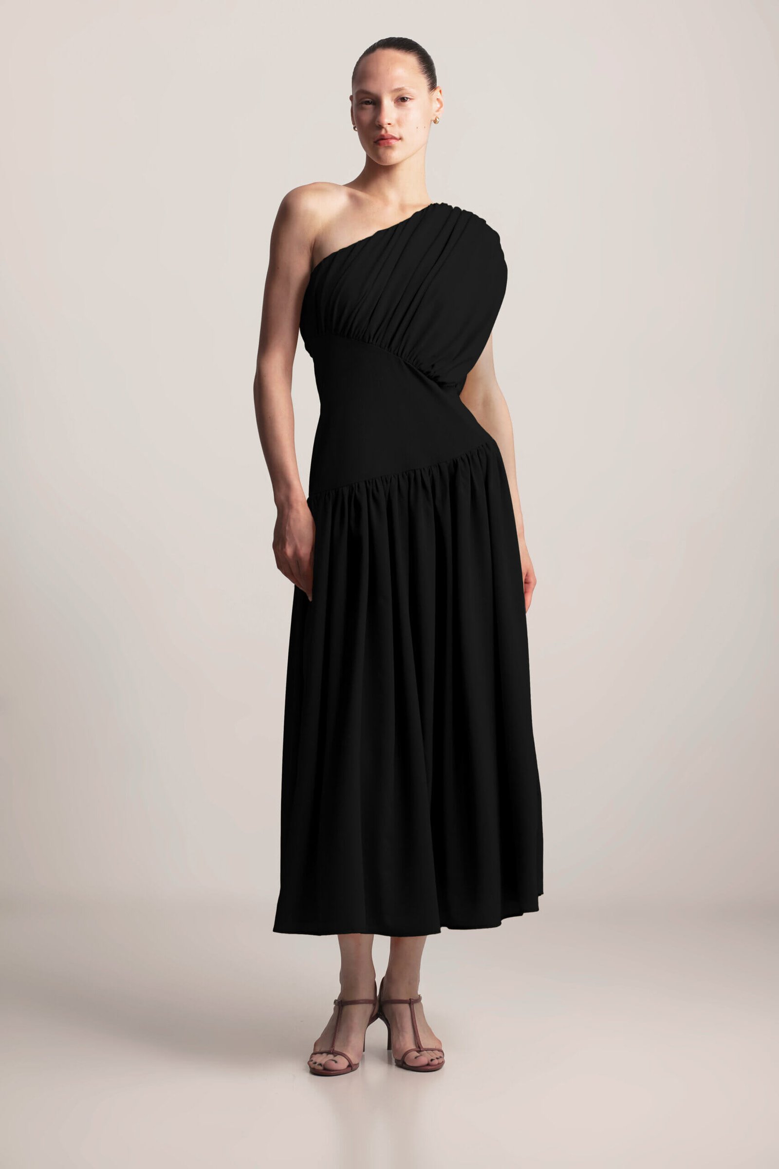 Drape Dress, this sculpted asymmetrical dress features a striking one-shoulder design with elegant gathering, creating a flattering and feminine silhouette. The under-bust seam defines the waist, while the full, flowing skirt with delicate gathering adds graceful movement. A side zipper ensures a secure and comfortable fit. Crafted from soft, lightweight viscose fabric, this dress exudes modern elegance with a touch of artistic design. Available in Black, Butter and Blush.