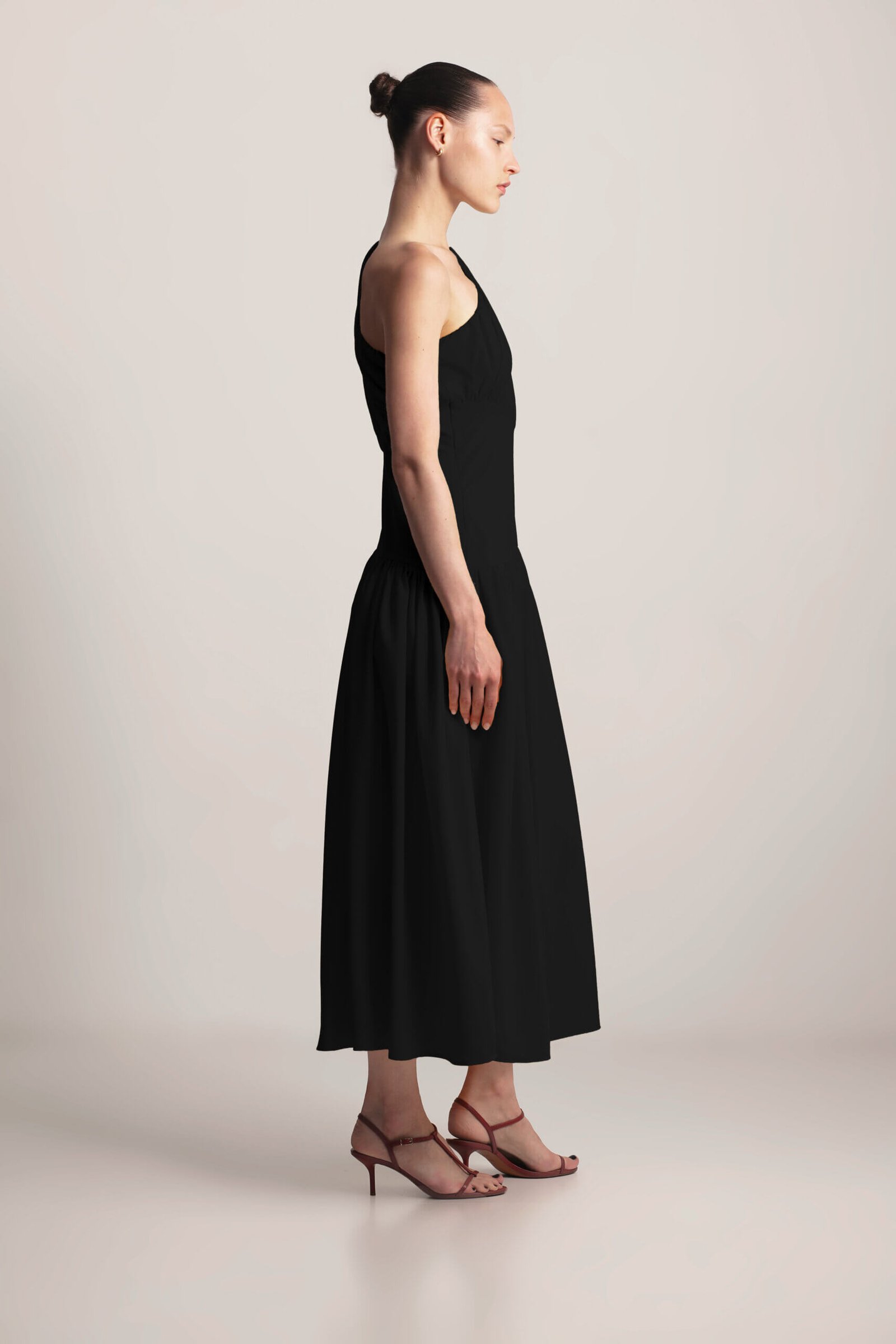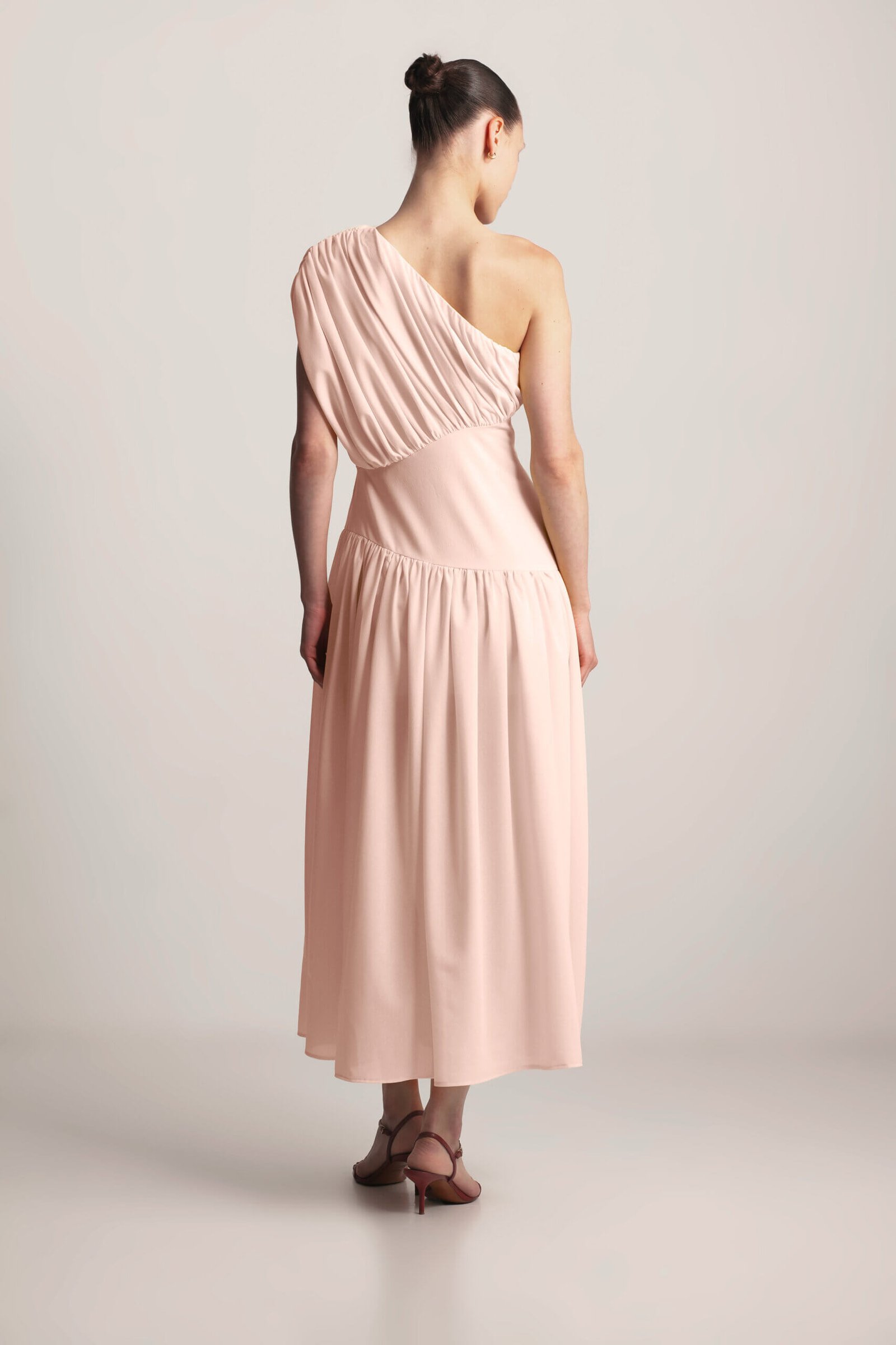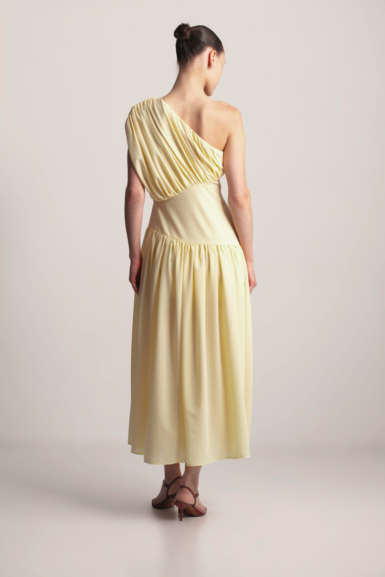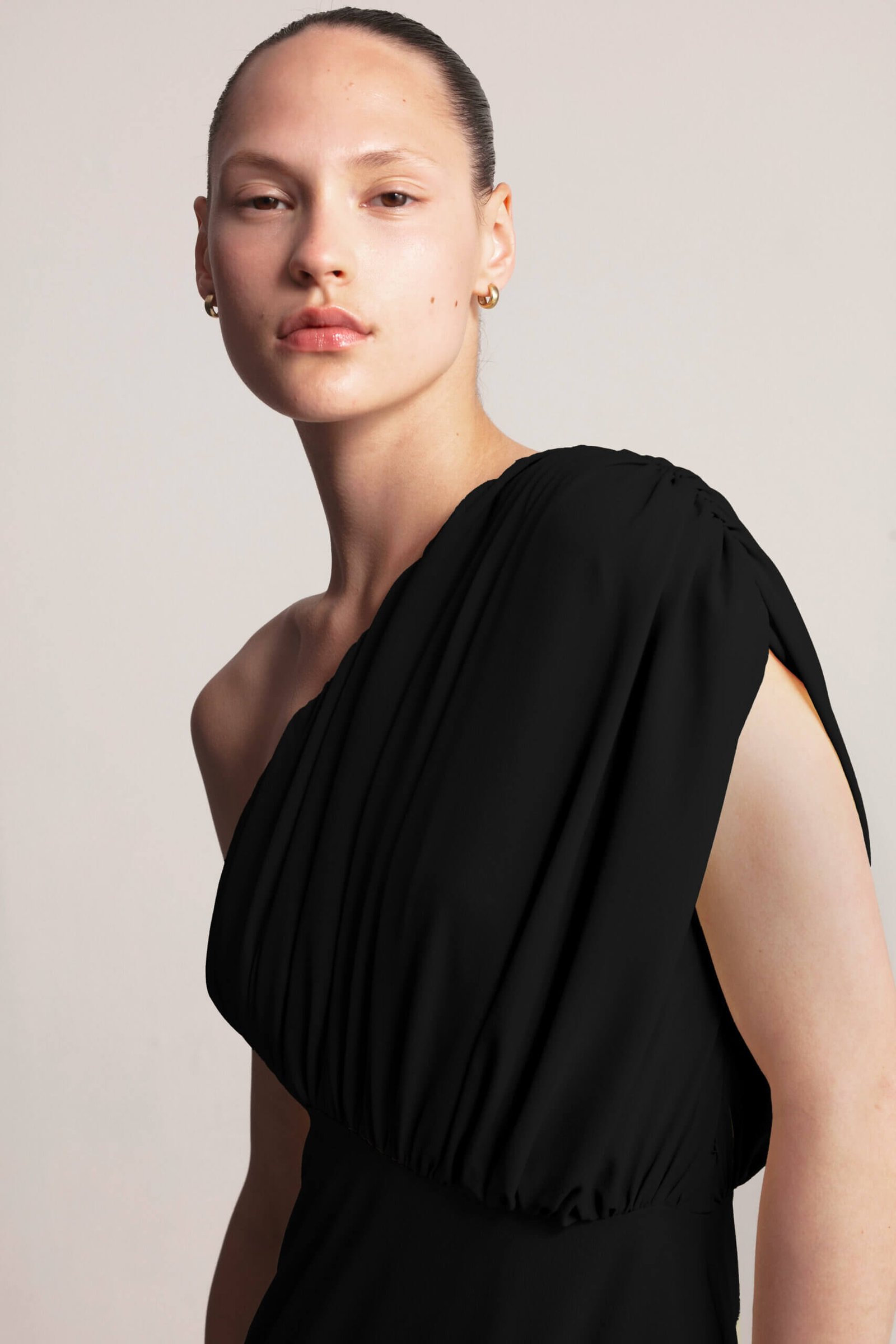 Drape Dress, this sculpted asymmetrical dress features a striking one-shoulder design with elegant gathering, creating a flattering and feminine silhouette. The under-bust seam defines the waist, while the full, flowing skirt with delicate gathering adds graceful movement. A side zipper ensures a secure and comfortable fit. Crafted from soft, lightweight viscose fabric, this dress exudes modern elegance with a touch of artistic design. Available in Black, Butter and Blush.