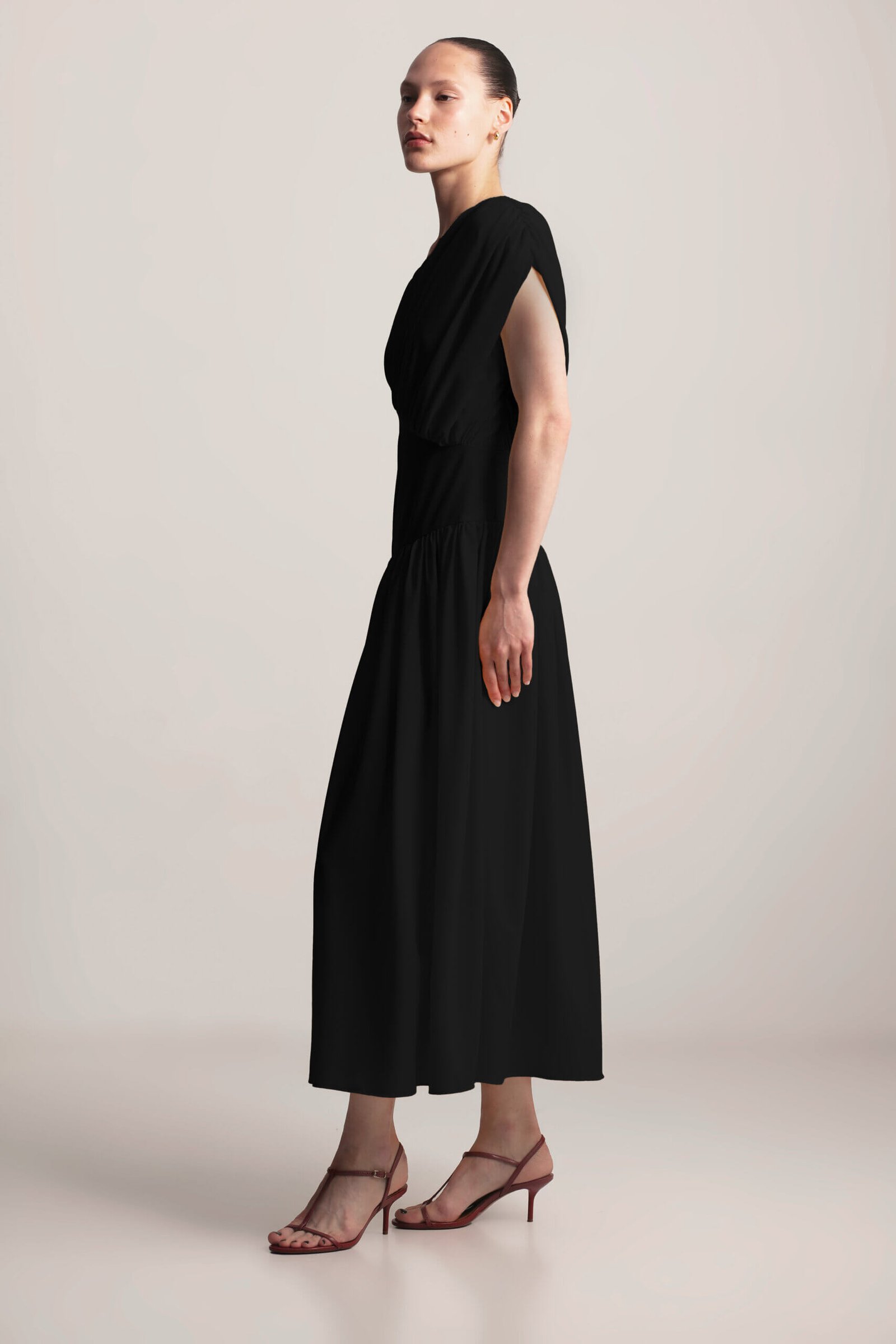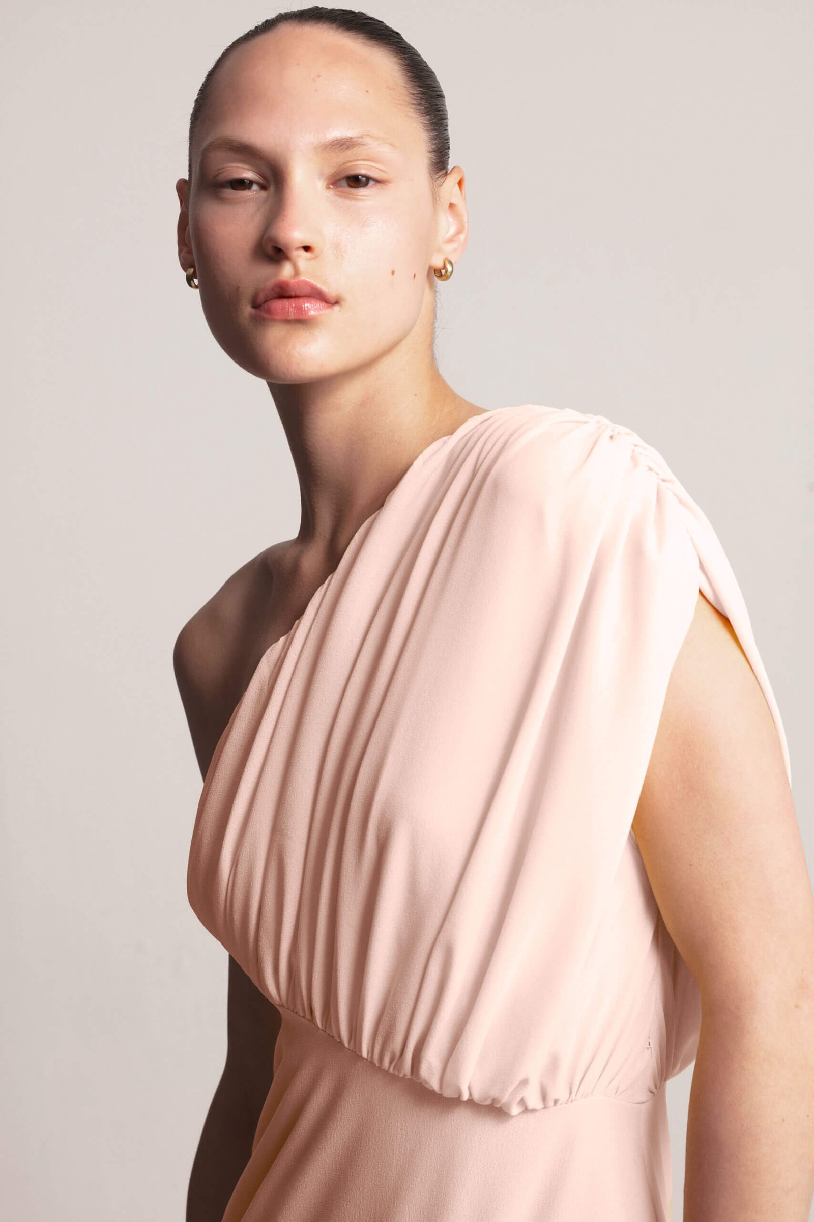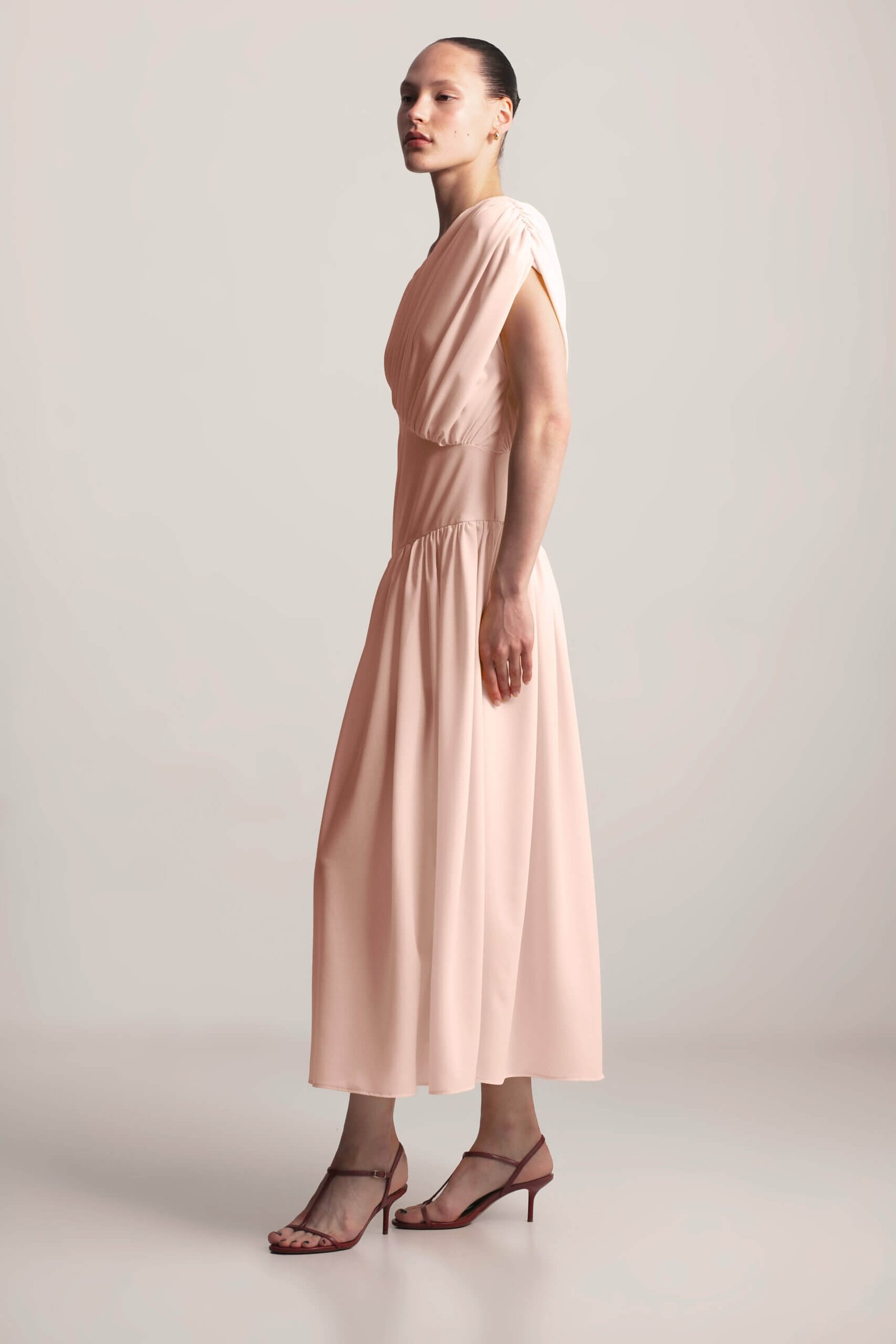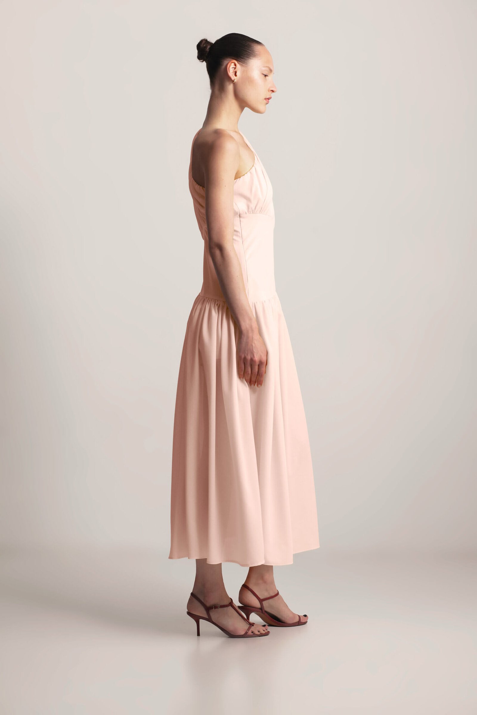 Drape Dress, this sculpted asymmetrical dress features a striking one-shoulder design with elegant gathering, creating a flattering and feminine silhouette. The under-bust seam defines the waist, while the full, flowing skirt with delicate gathering adds graceful movement. A side zipper ensures a secure and comfortable fit. Crafted from soft, lightweight viscose fabric, this dress exudes modern elegance with a touch of artistic design. Available in Black, Butter and Blush.