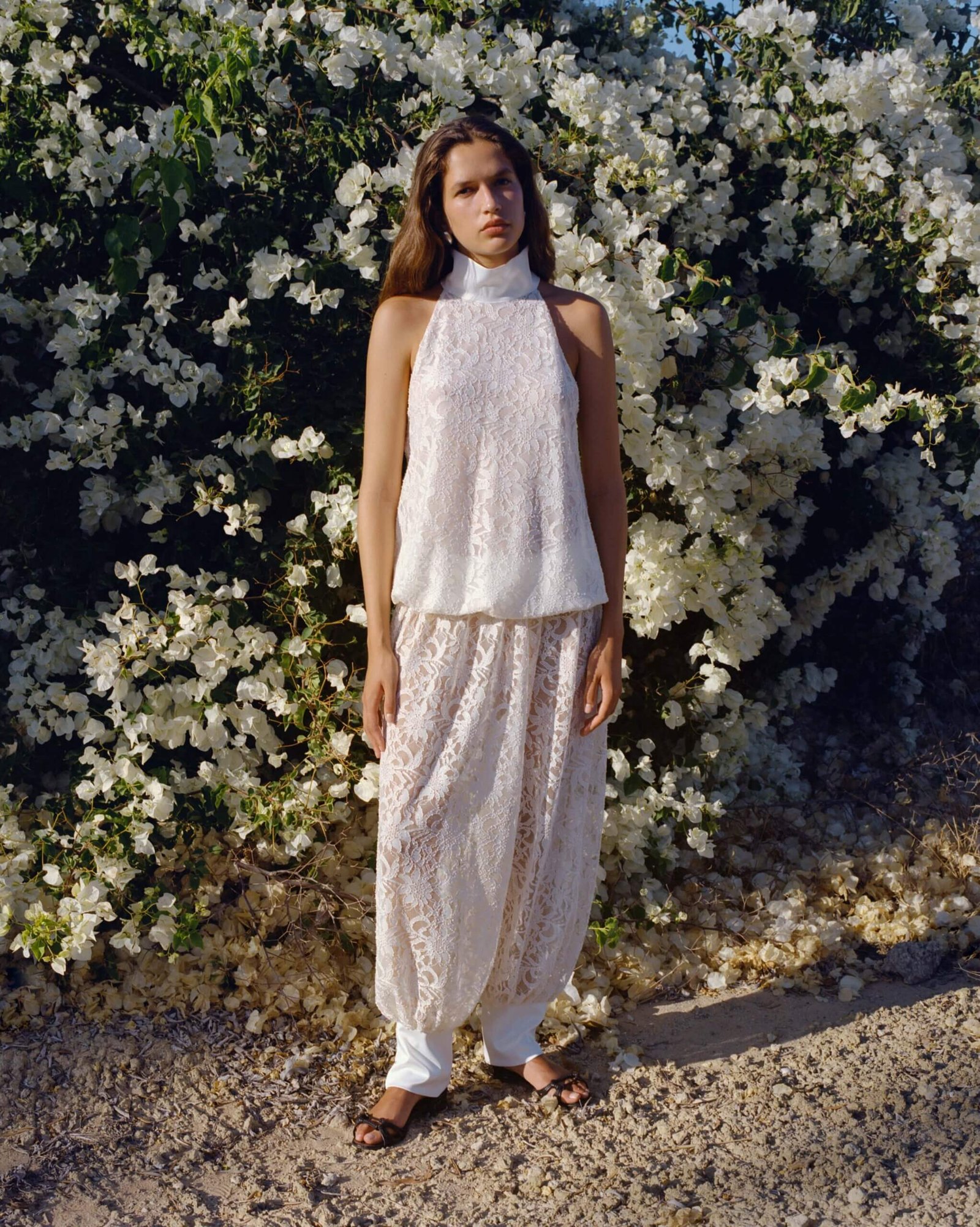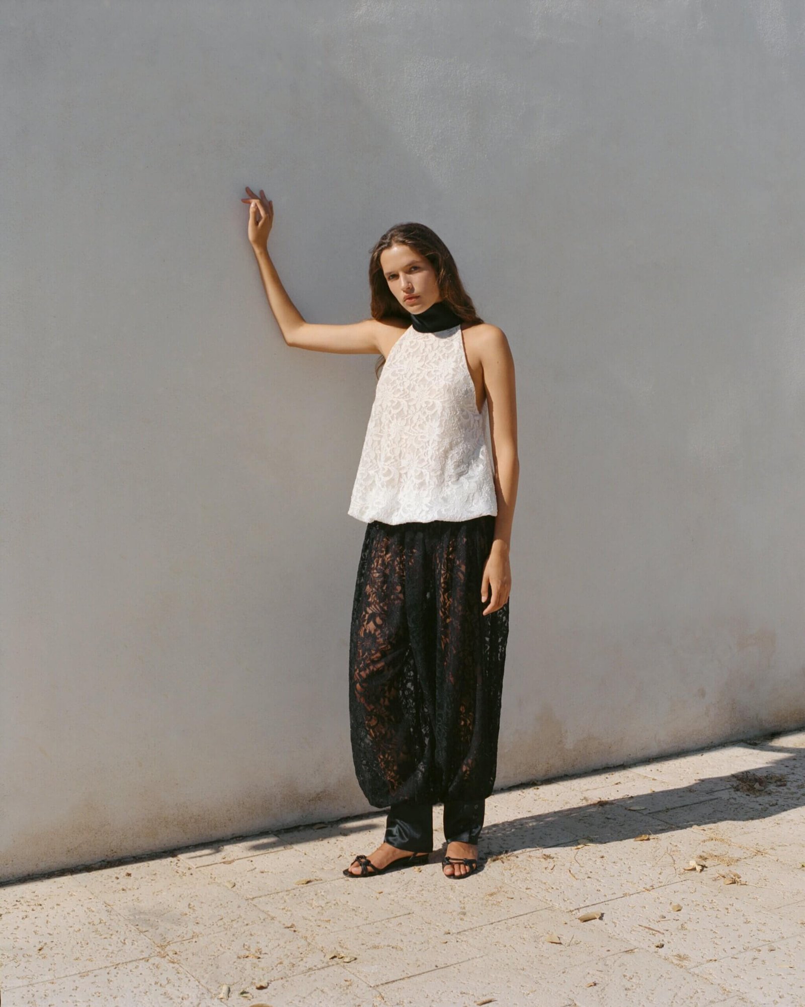 Lace pants in a relaxed, effortless silhouette. Designed with a soft satin elastic waistband for all-day comfort and finished with satin cuffs, each featuring delicate mother-of-pearl buttons. The sheer lace reveals just enough, making them perfect for any occasion that calls for effortless sophistication.