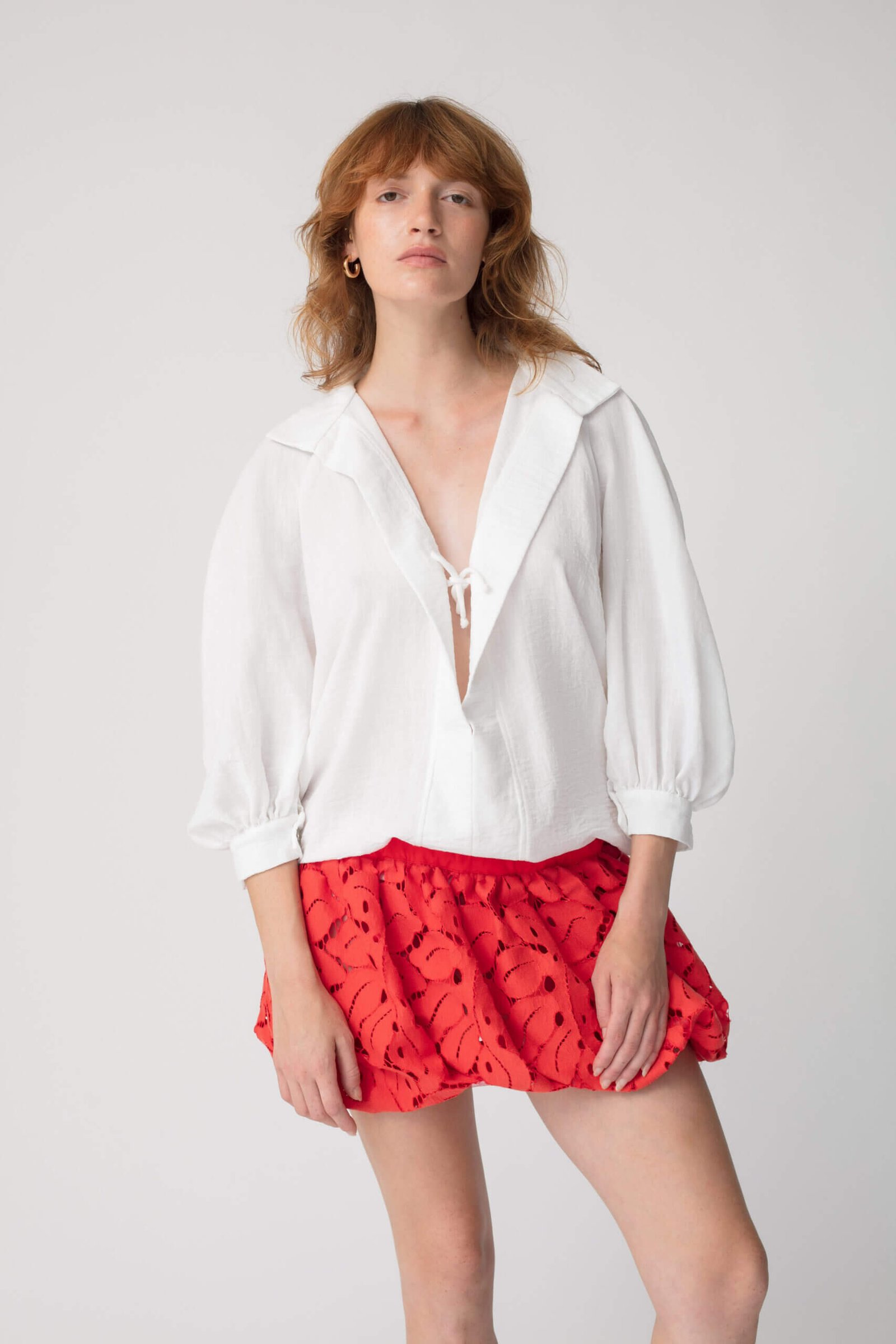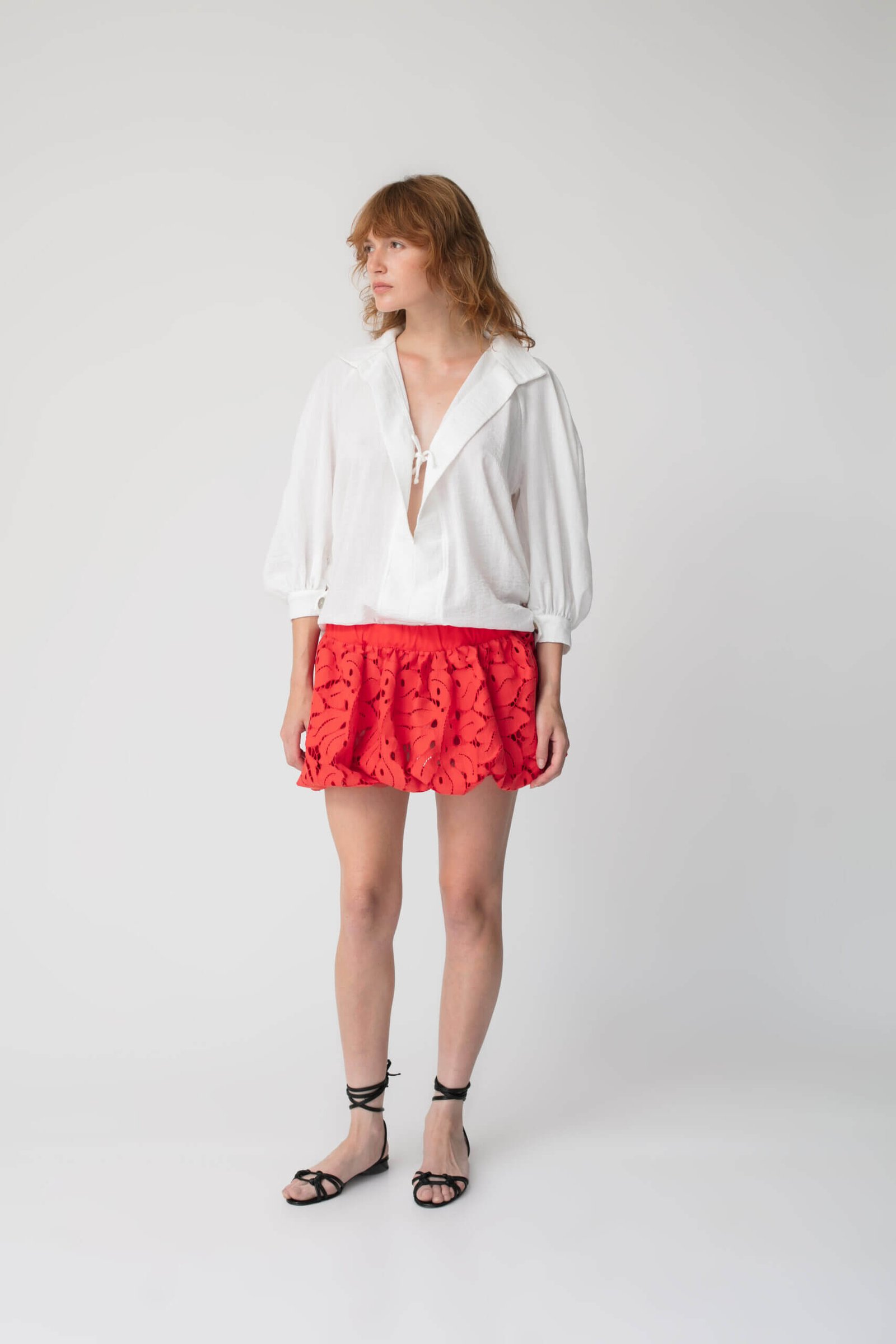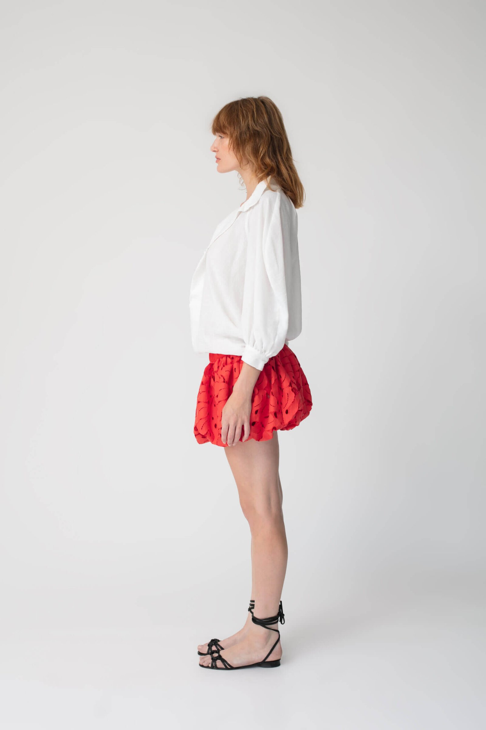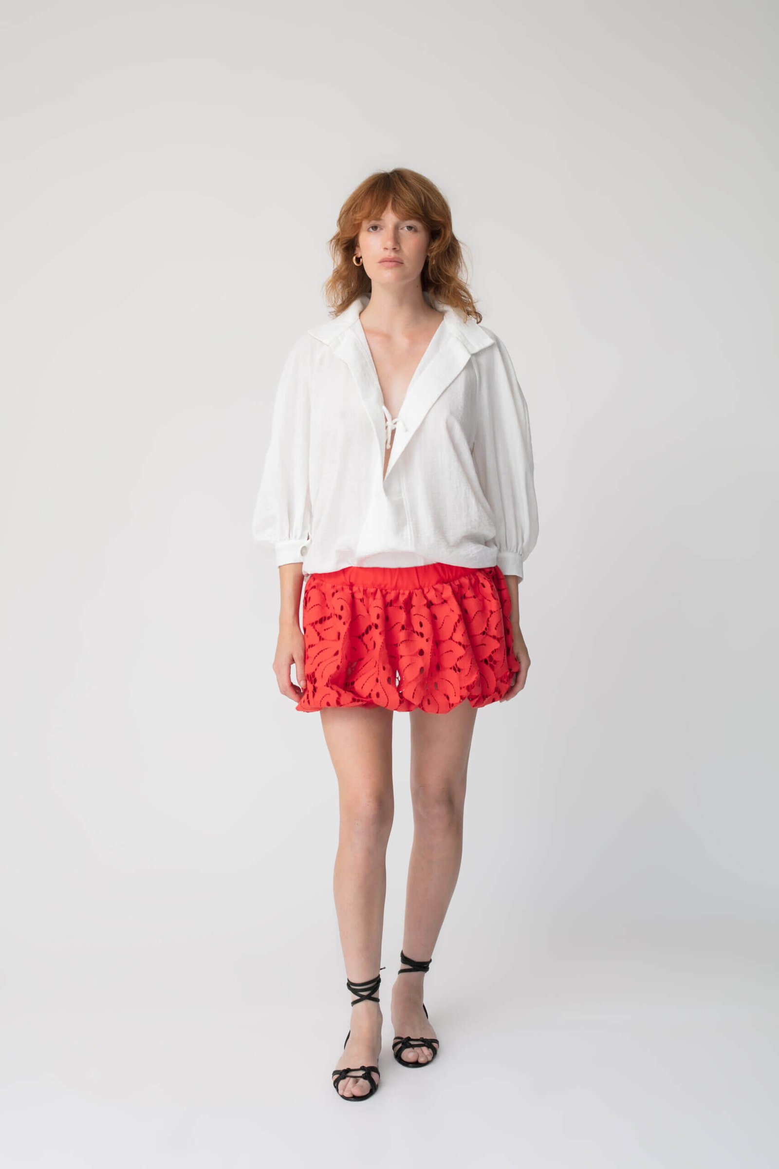 Made from airy macramé that incorporates flowers and leaves, this mini skirt is gathered to create a voluminous bubble hem. It sits flatteringly on the waist, with a hidden zipper. Wear yours with the coordinating button down shirt for a chic, effortless look. Available in vibrant orange, inspired by end of summer golden sunsets.