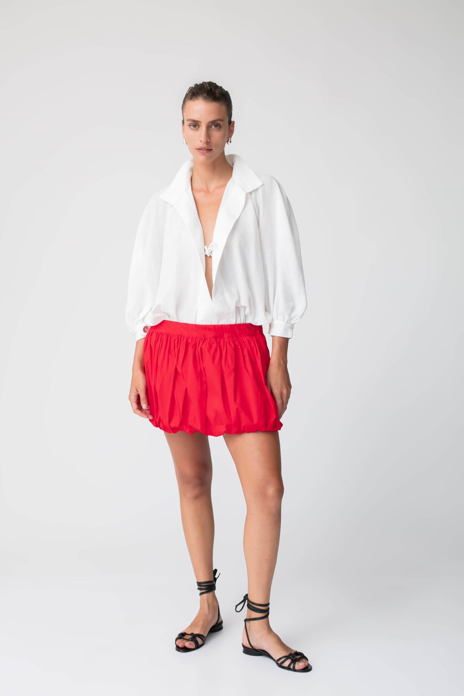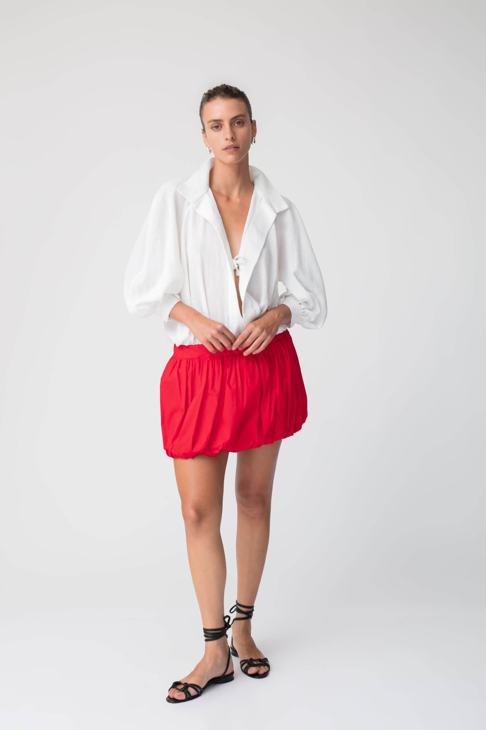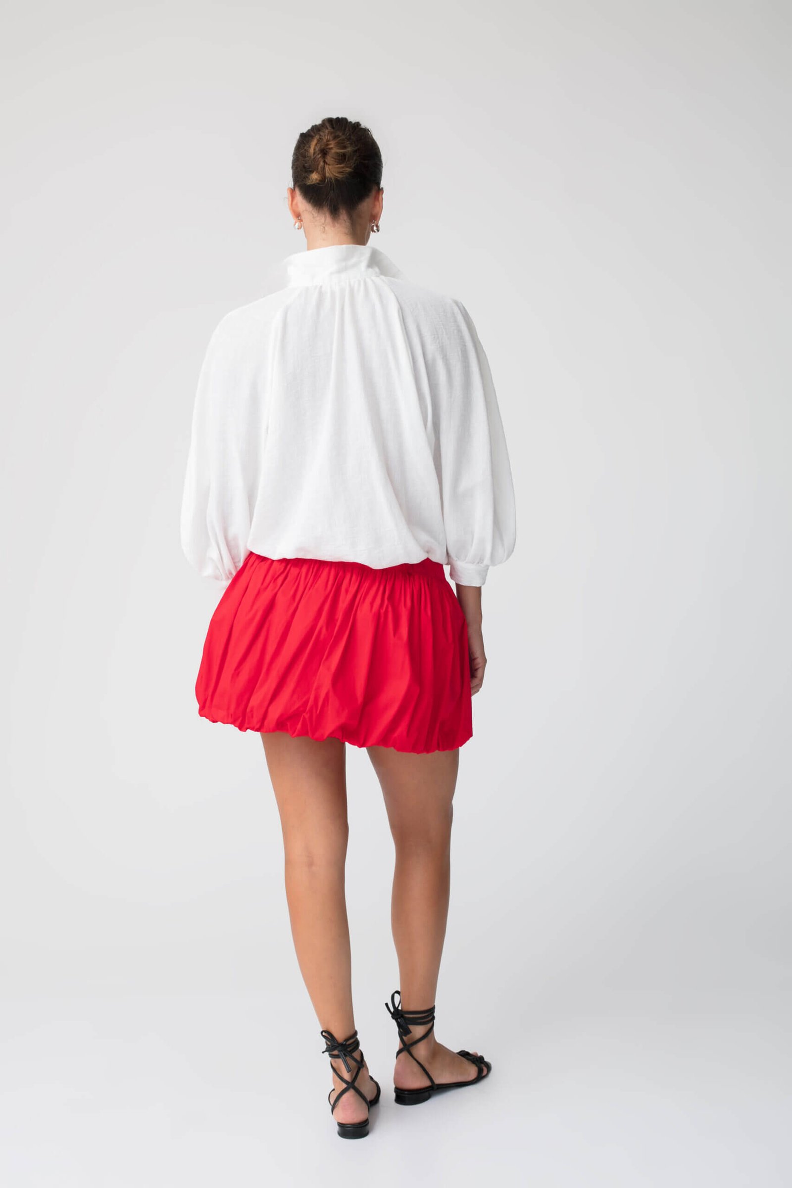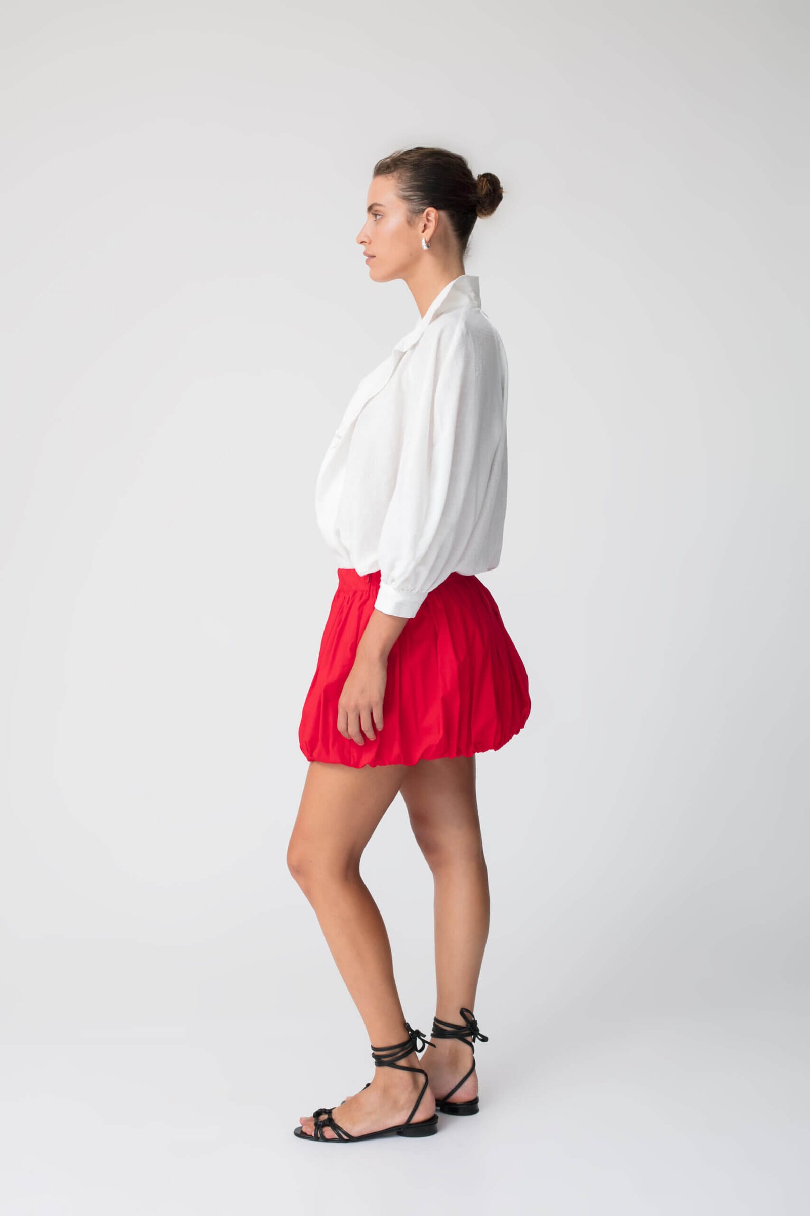 Made from crisp cotton-drill, this miniskirt is gathered to create a voluminous bubble hem. It sits flatteringly on the waist, with a hidden zipper and an elastic waist band. Available in 3 colors: Scarlet Red, Oak and Charcoal.