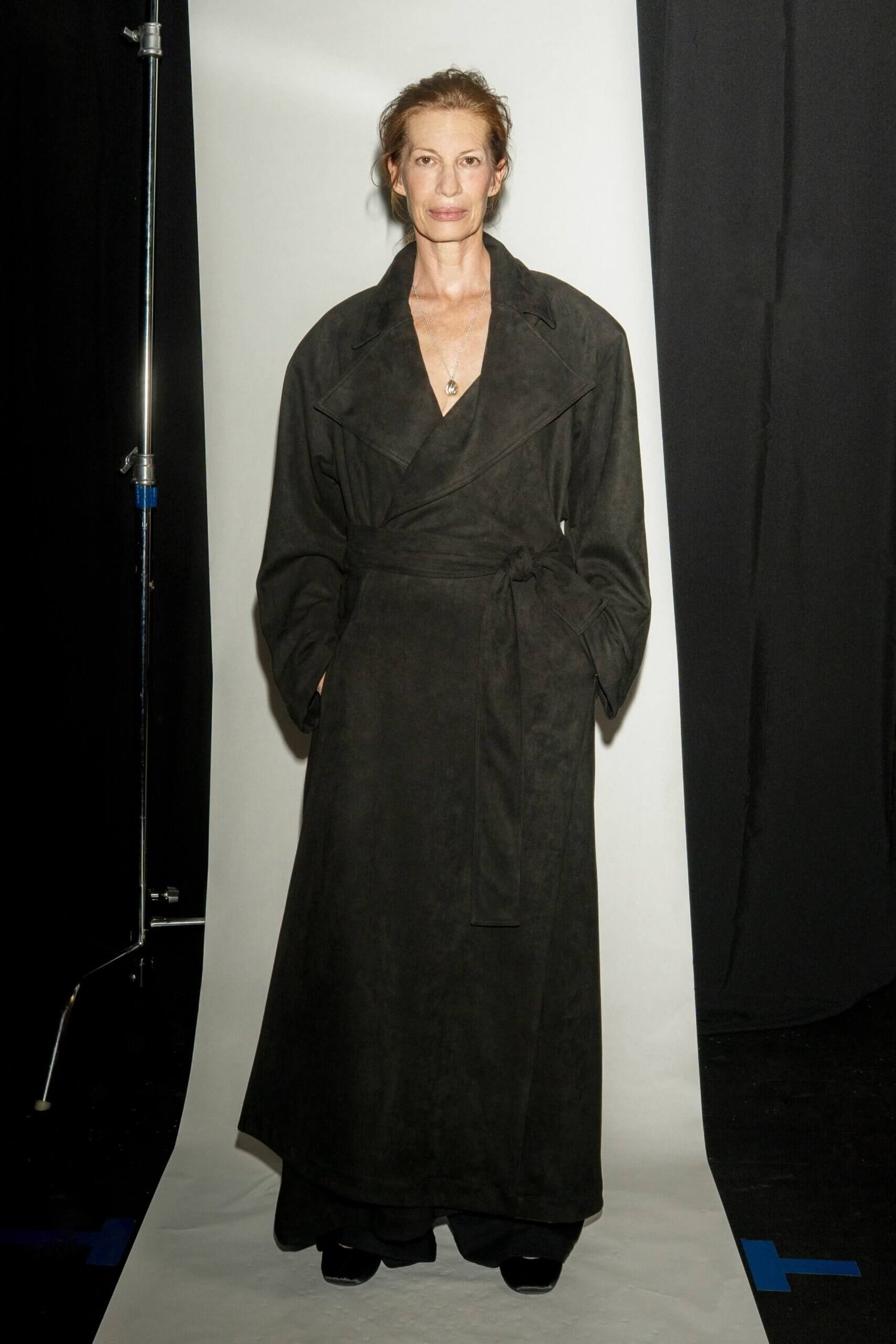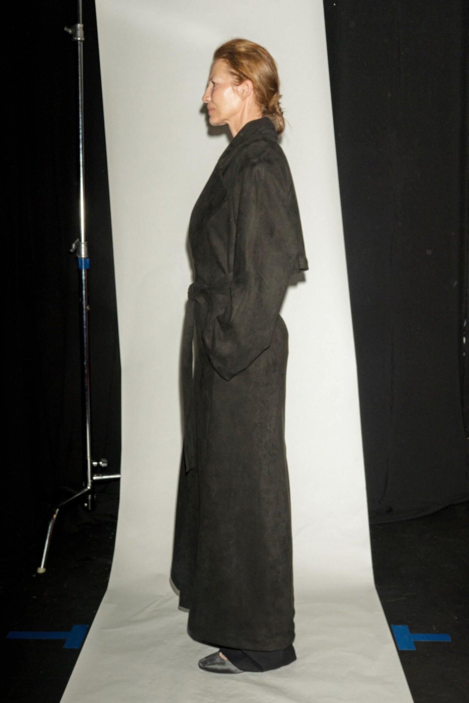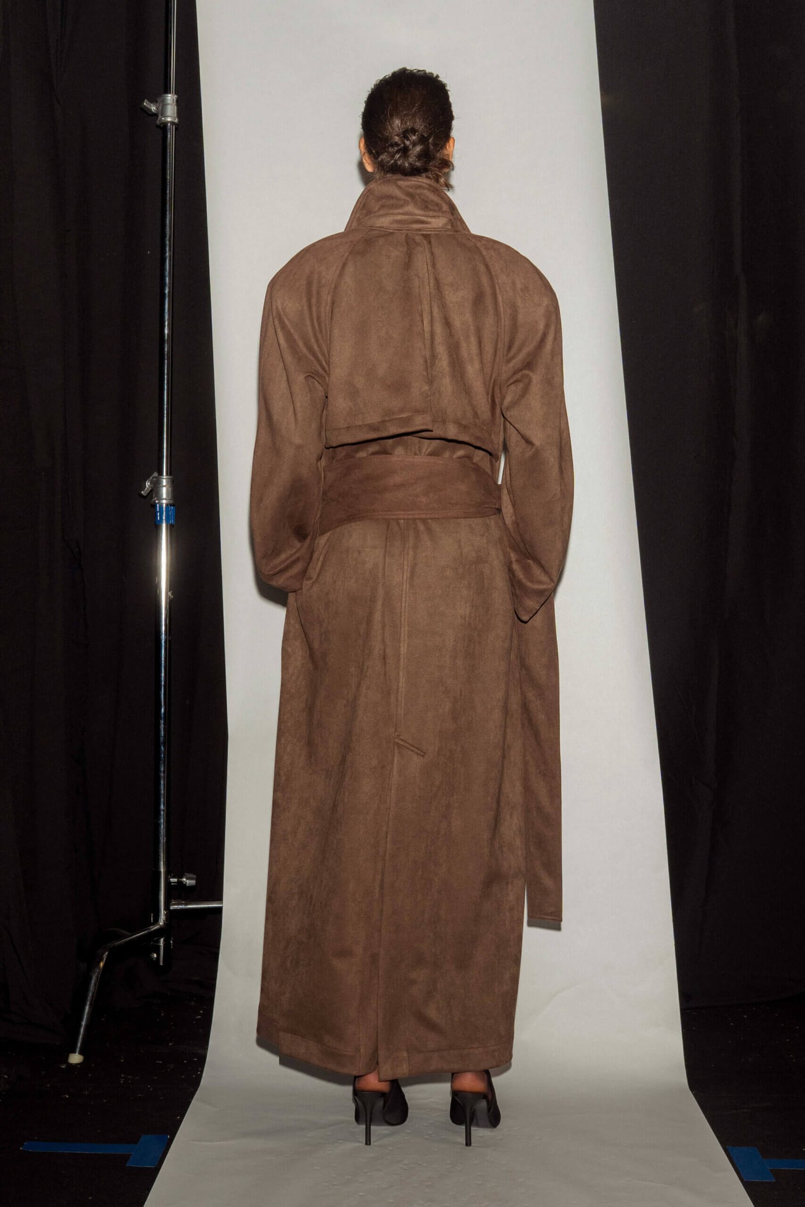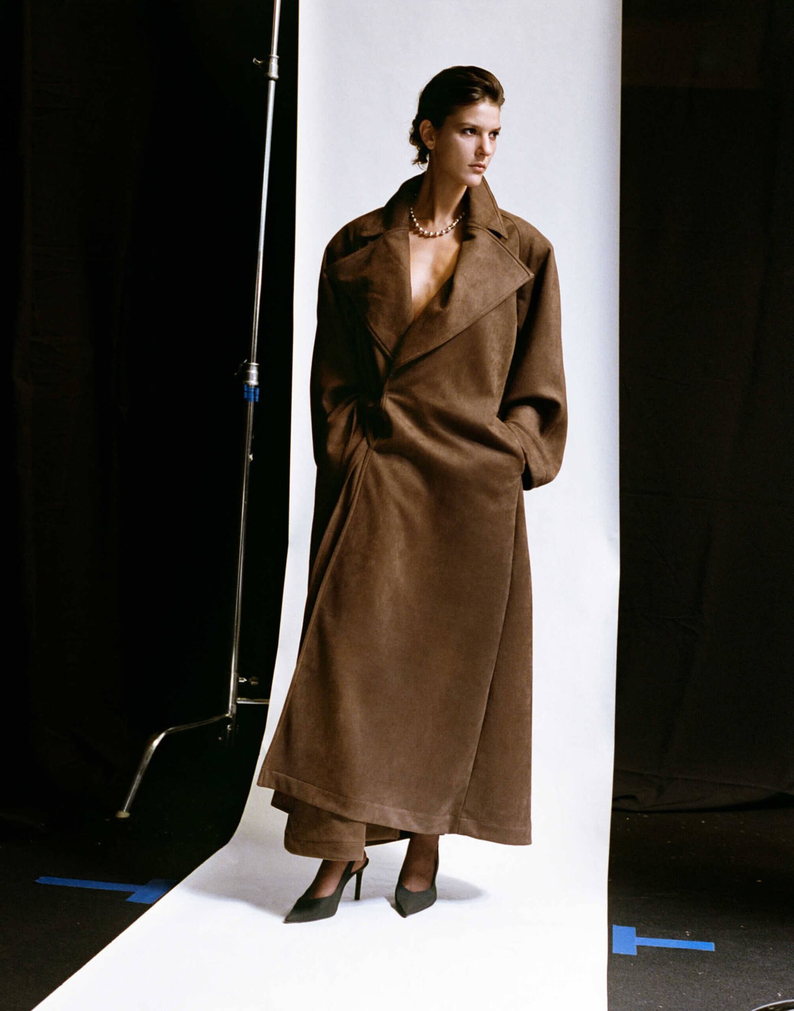 Elegant and structured – this long trench coat features clean tailoring, defined lines, and a relaxed yet refined silhouette. Crafted from a suede-like fabric that adds depth, softness, and subtle texture. Designed with functional side pockets and a waist tie belt that shapes the figure with effortless ease. Available in black and brown.