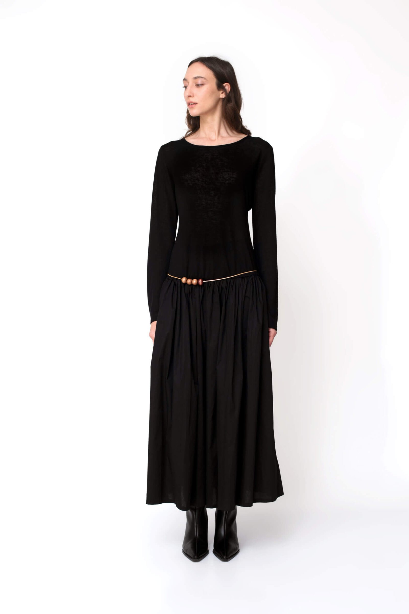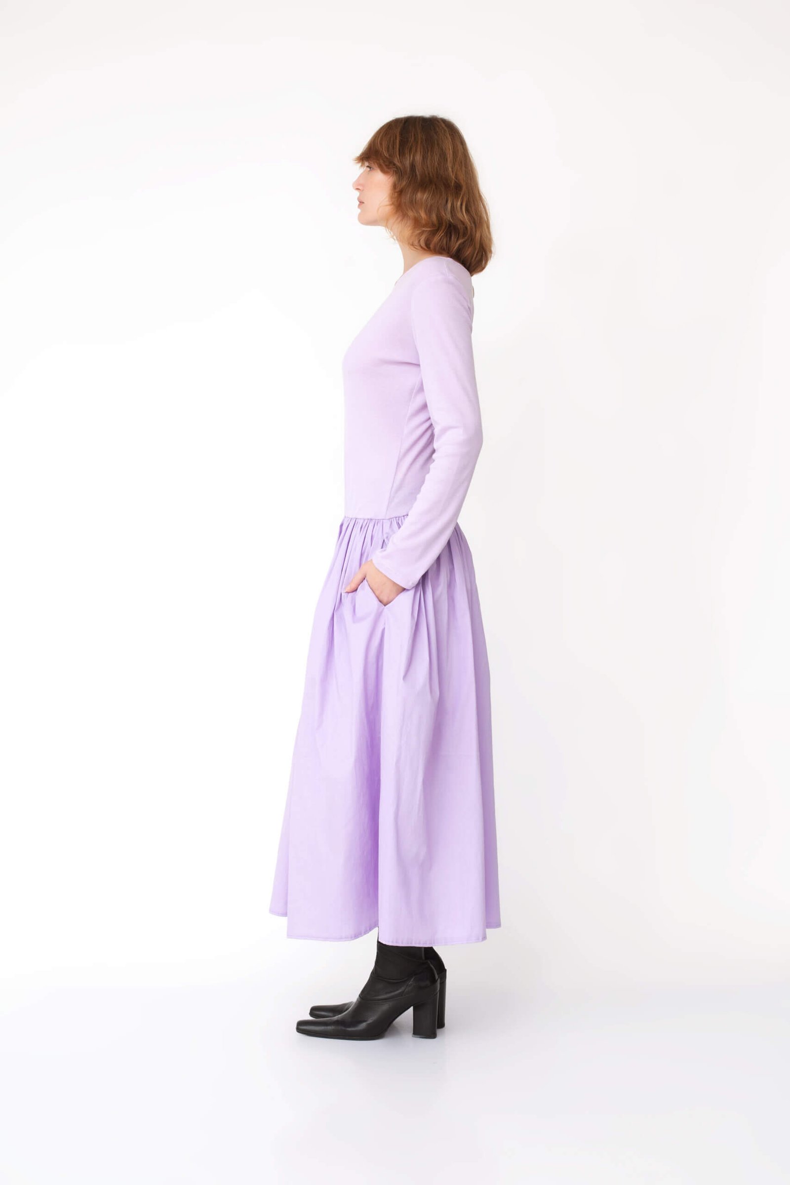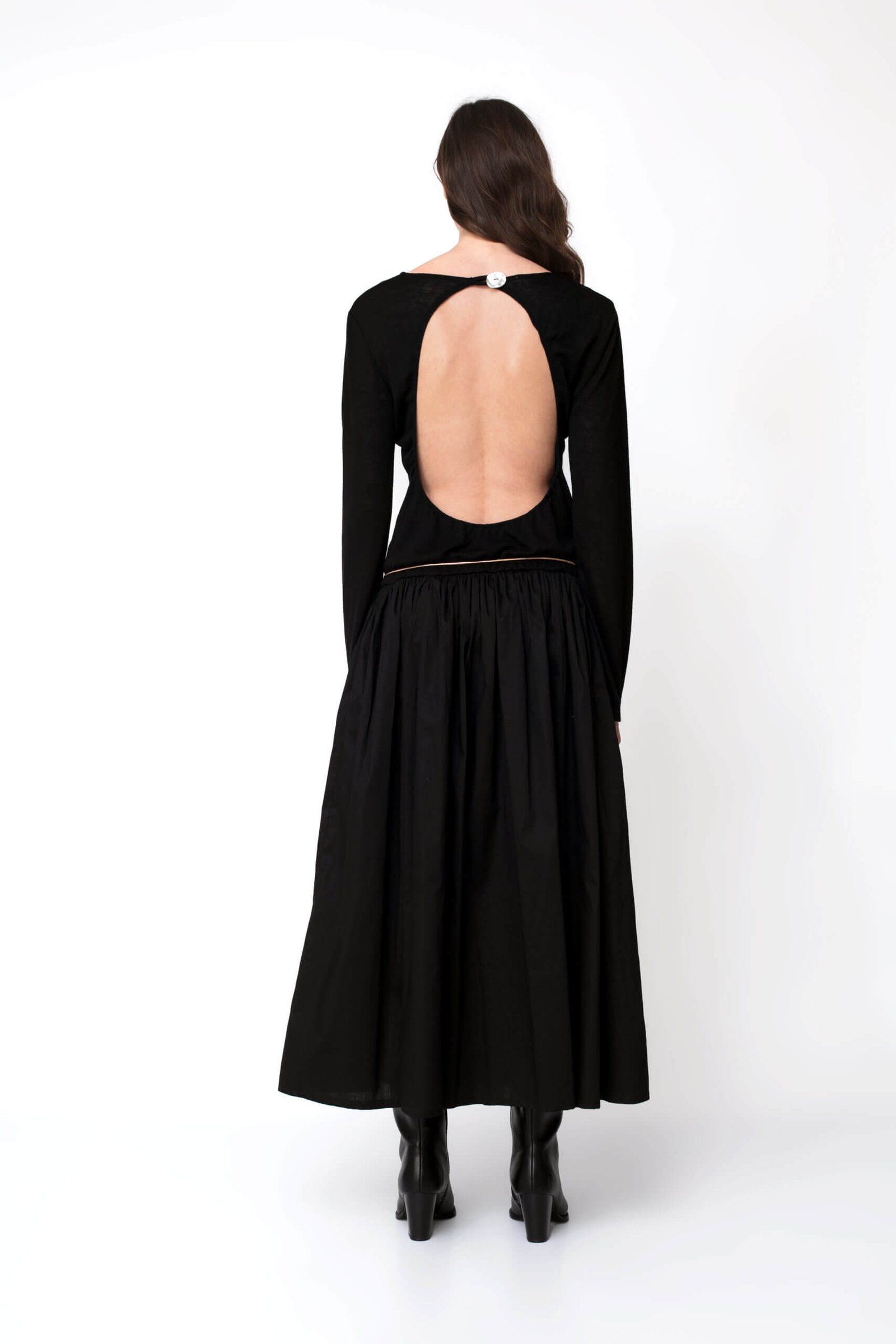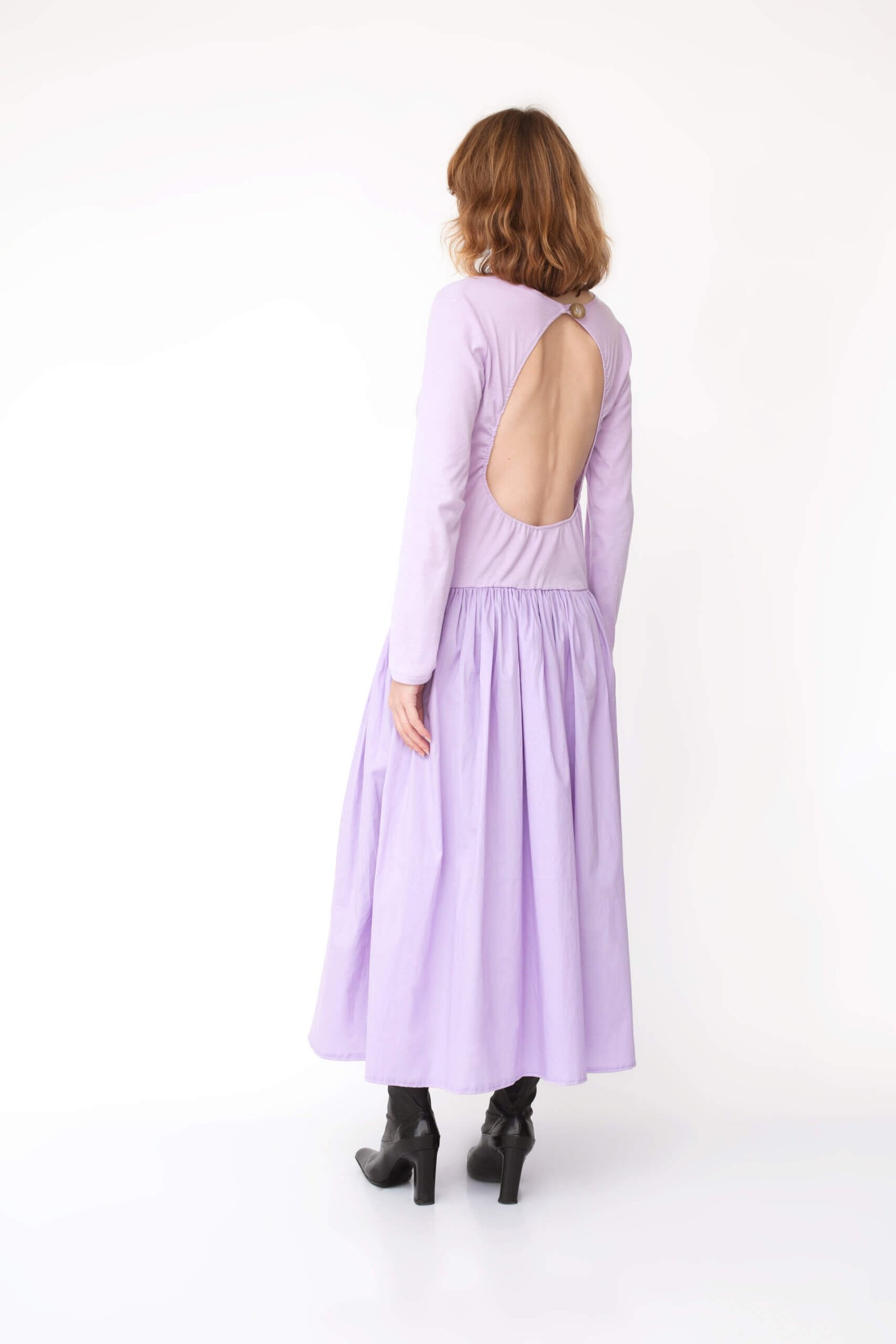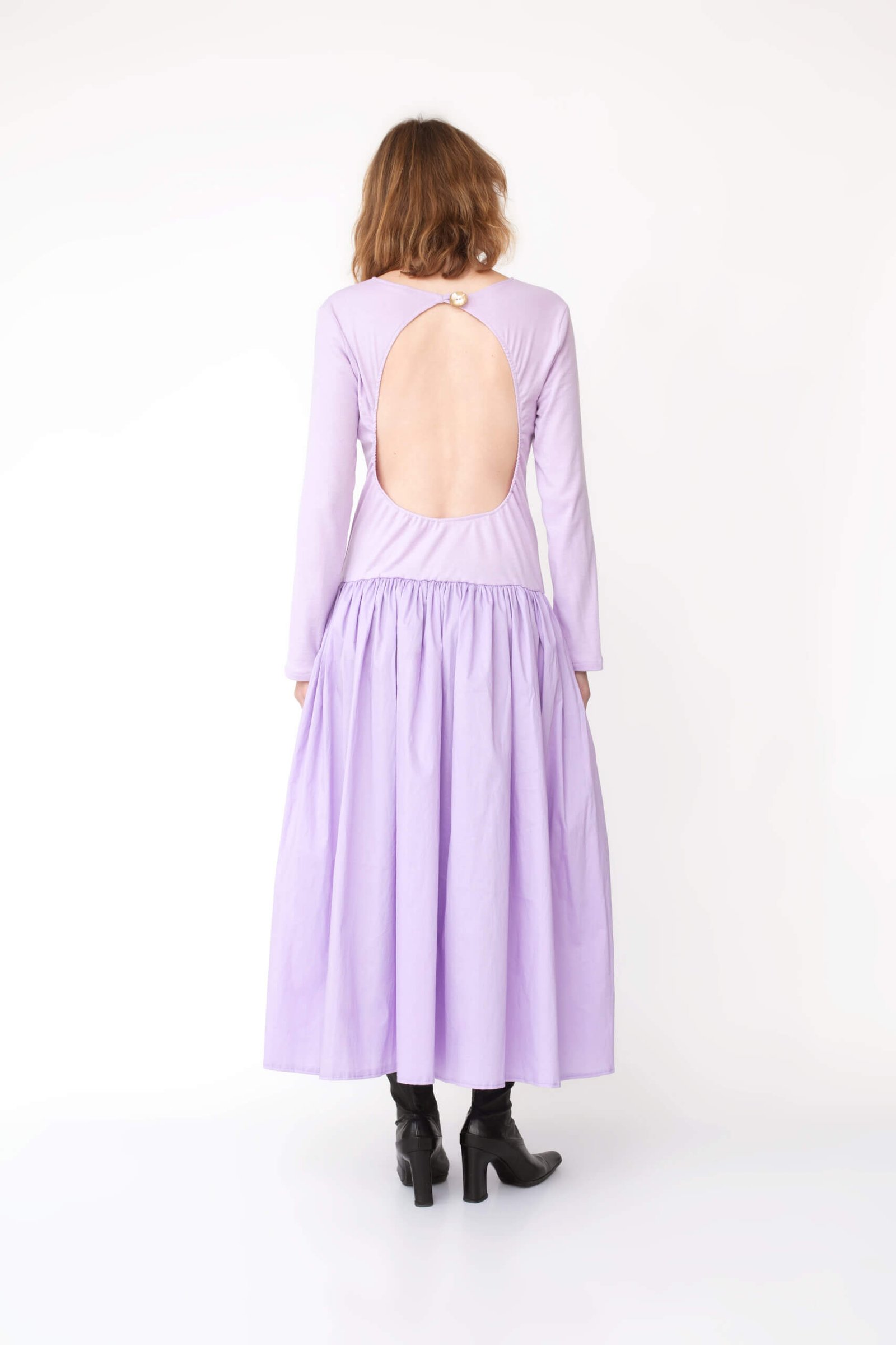 Gentle structure is brought throughout this season’s collection to create unique silhouettes with a strong feminine power. This sculptural dress is accentuated by a fitted knit top and a voluminous gathered skirt with side pockets and an open back. Available in 2 colors- Solid Black and Lilac.