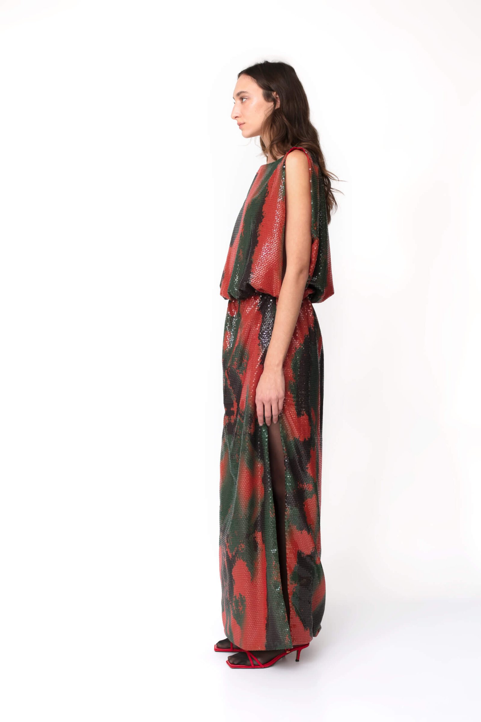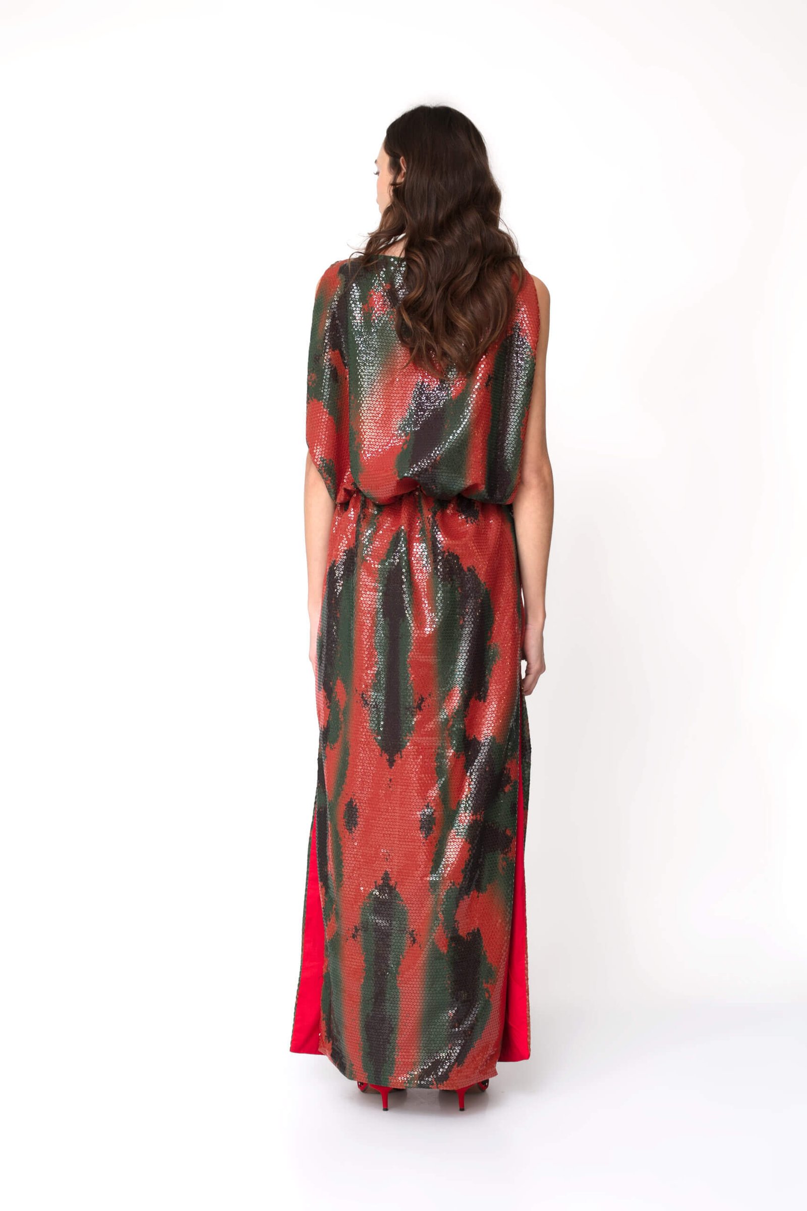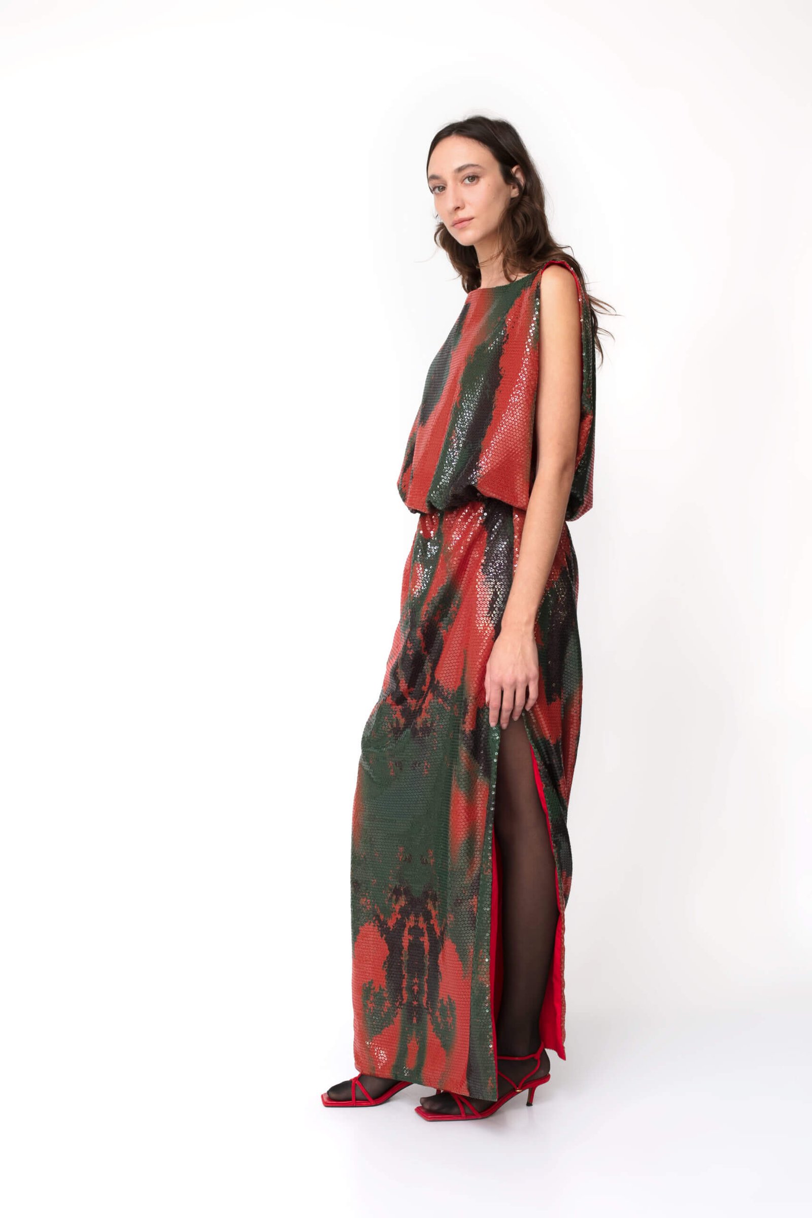 Constructed for a voluminous silhouette, this dress is cut from a luxuries sequin with a