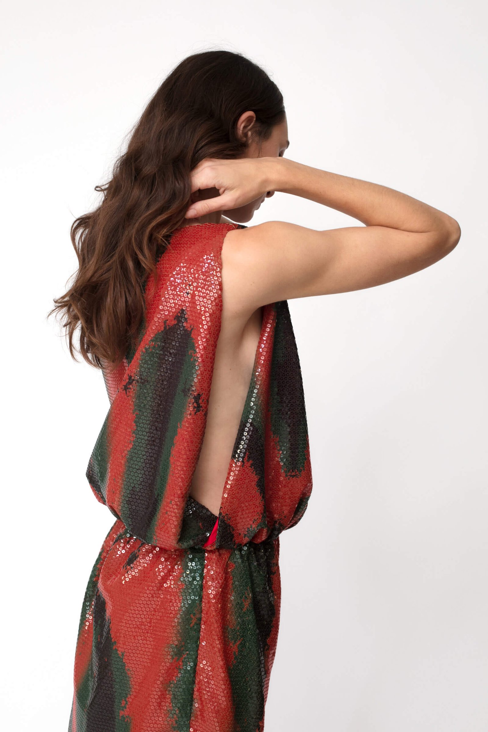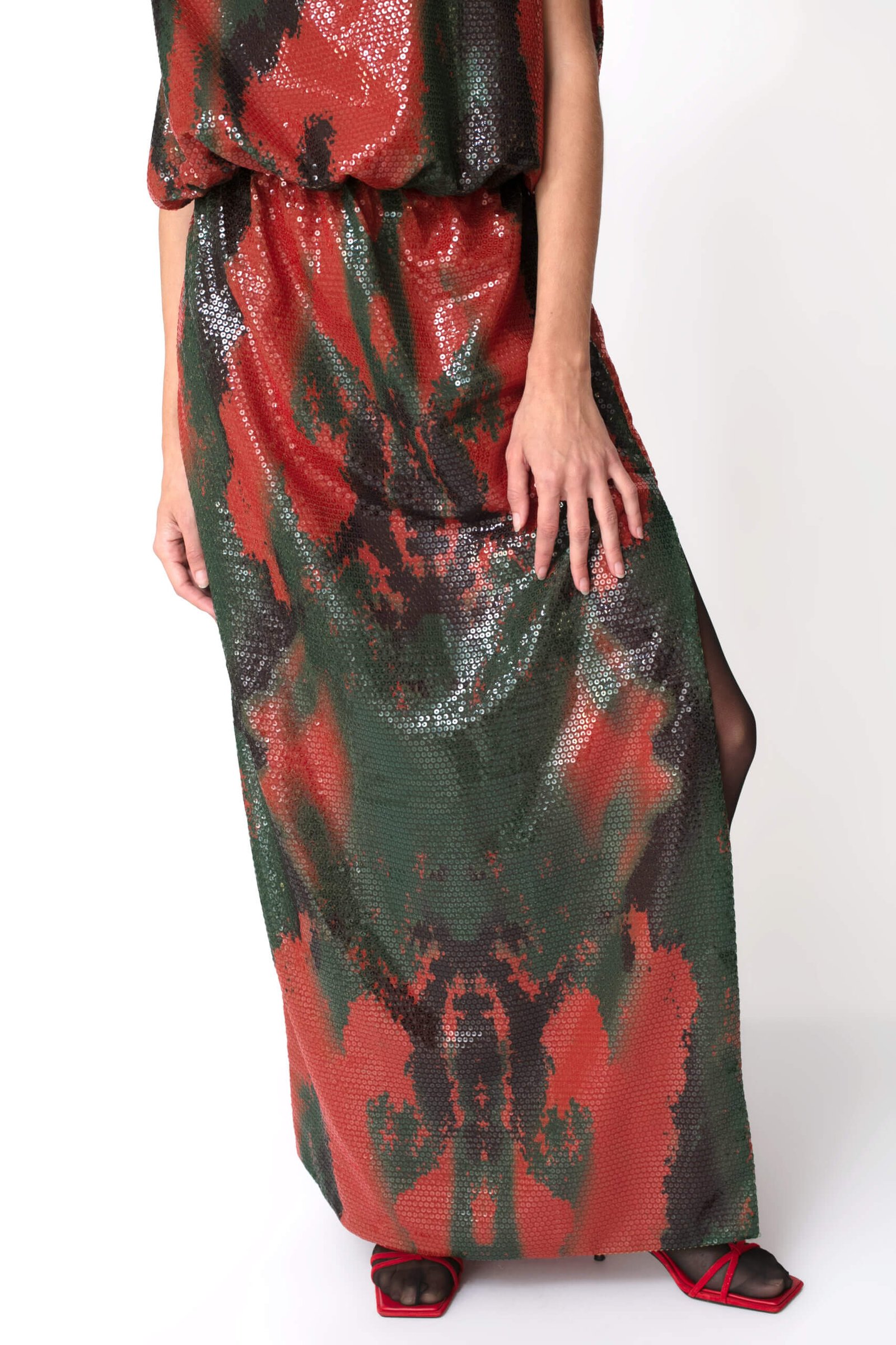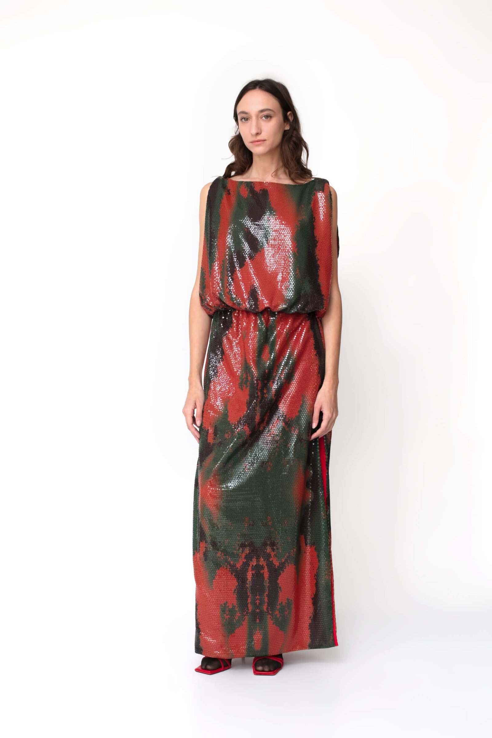 Constructed for a voluminous silhouette, this dress is cut from a luxuries sequin with a