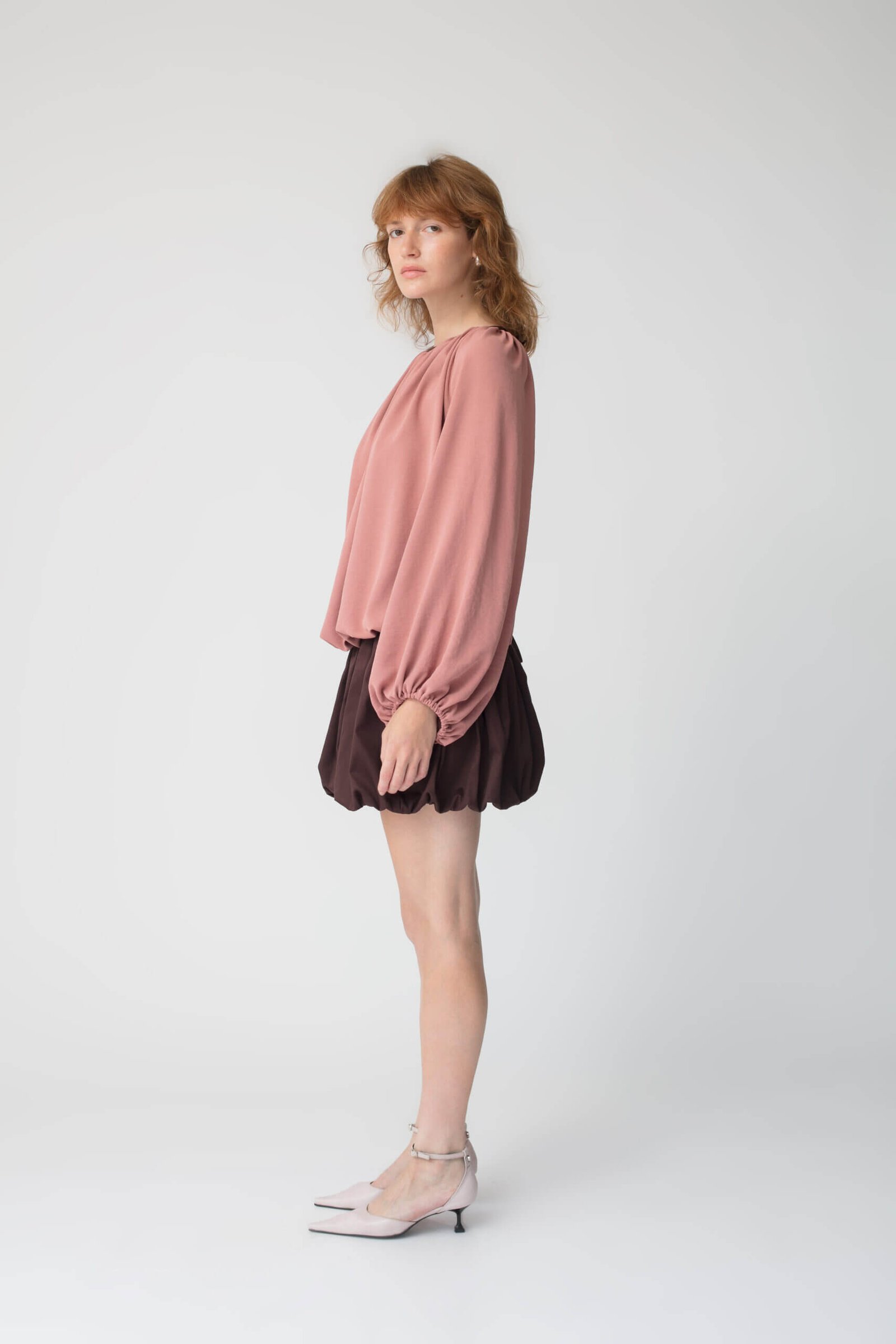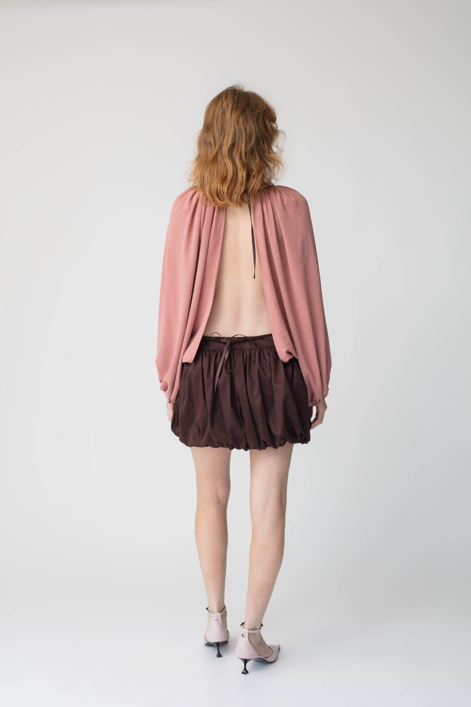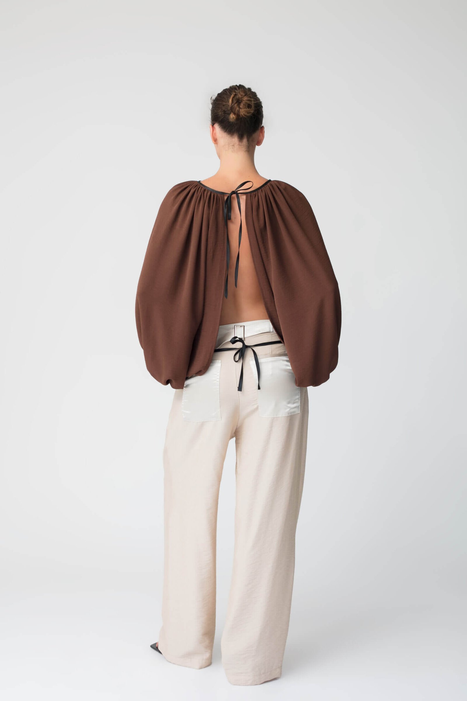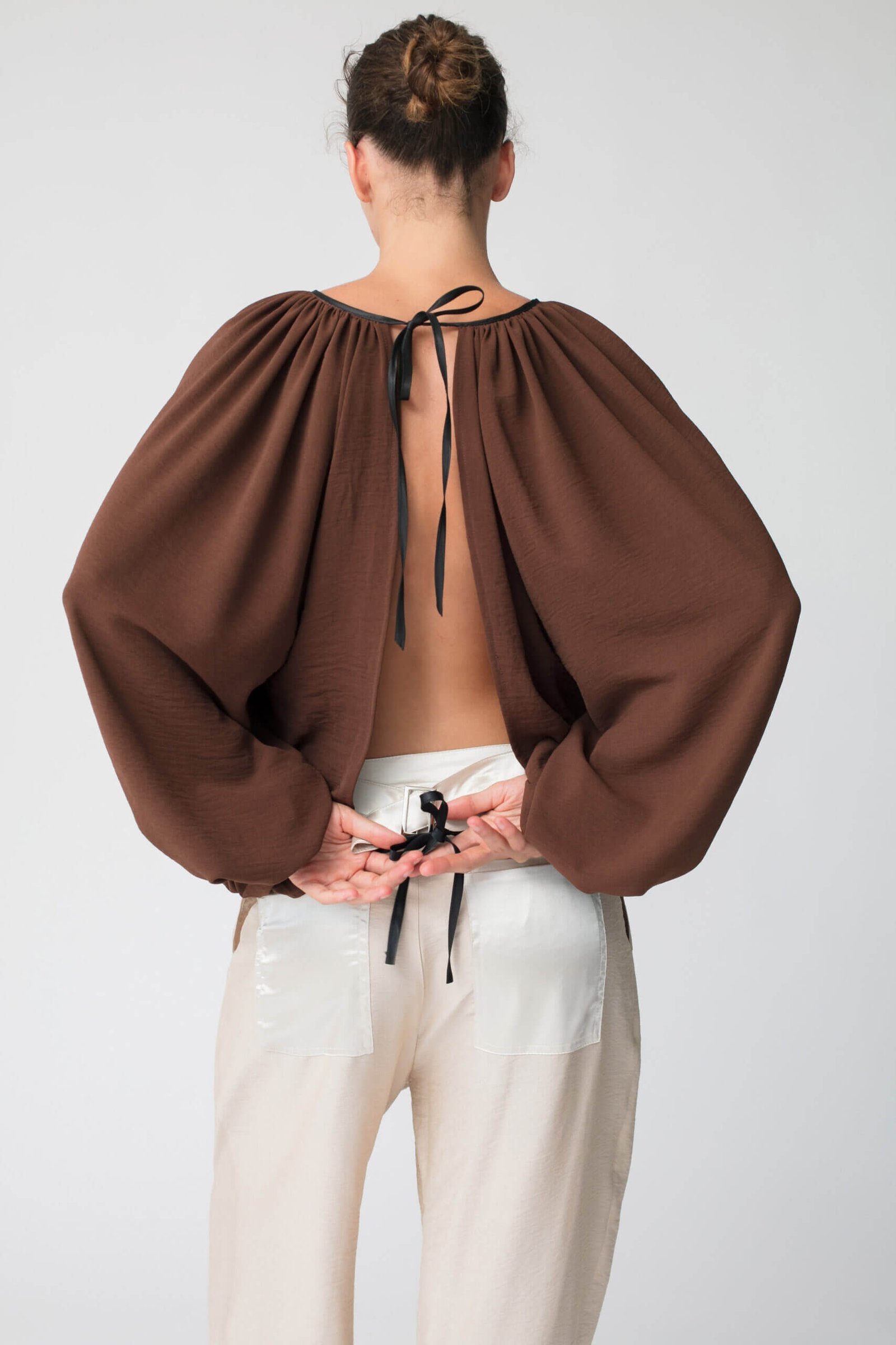 Crafted in fluid crepe, this gathered blouse exudes powerful femininity. Designed with a bateau neckline with ethereal lantern sleeves and a sweeping open back, it is artfully finished by satin ties in contrasting colors. Fits a range of different sizes. Available in 2 colors- Blush and Rust.