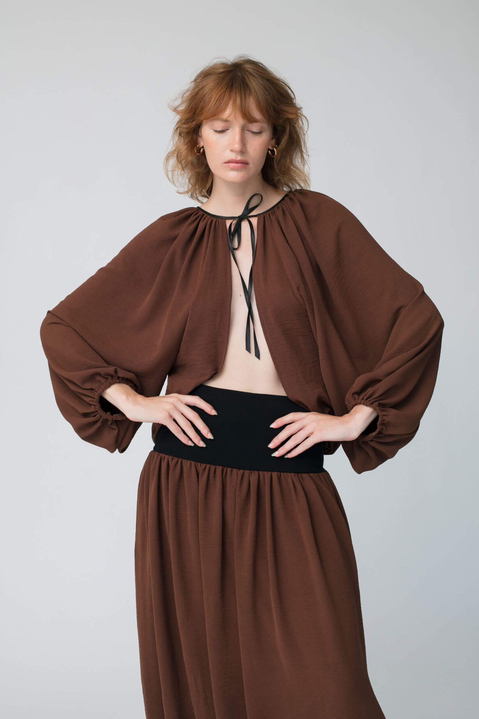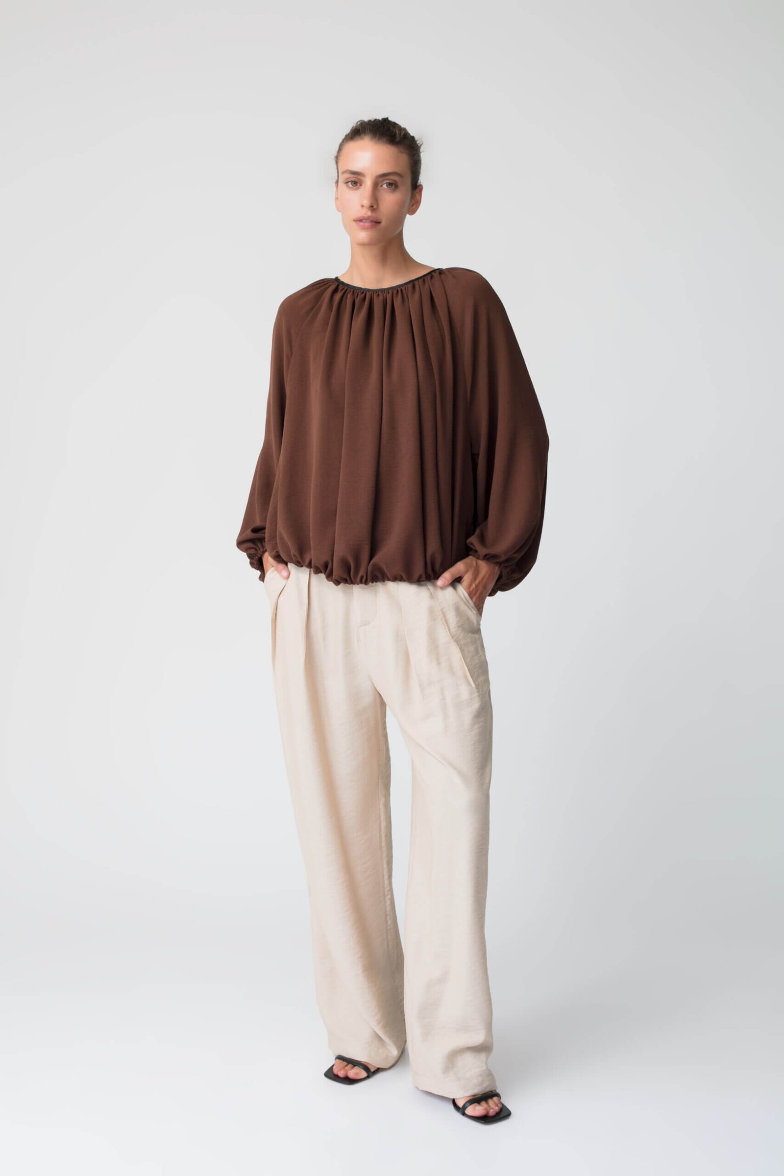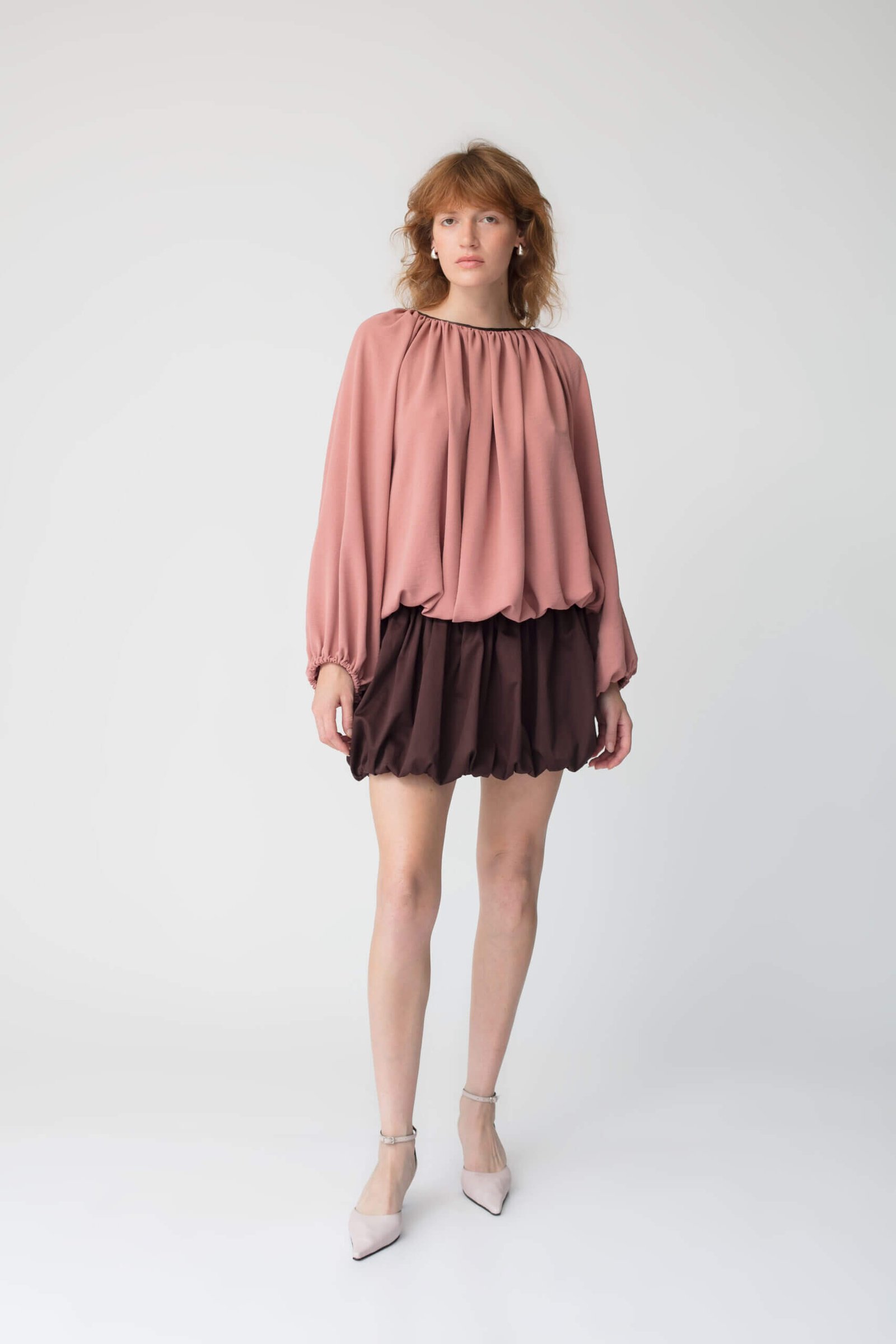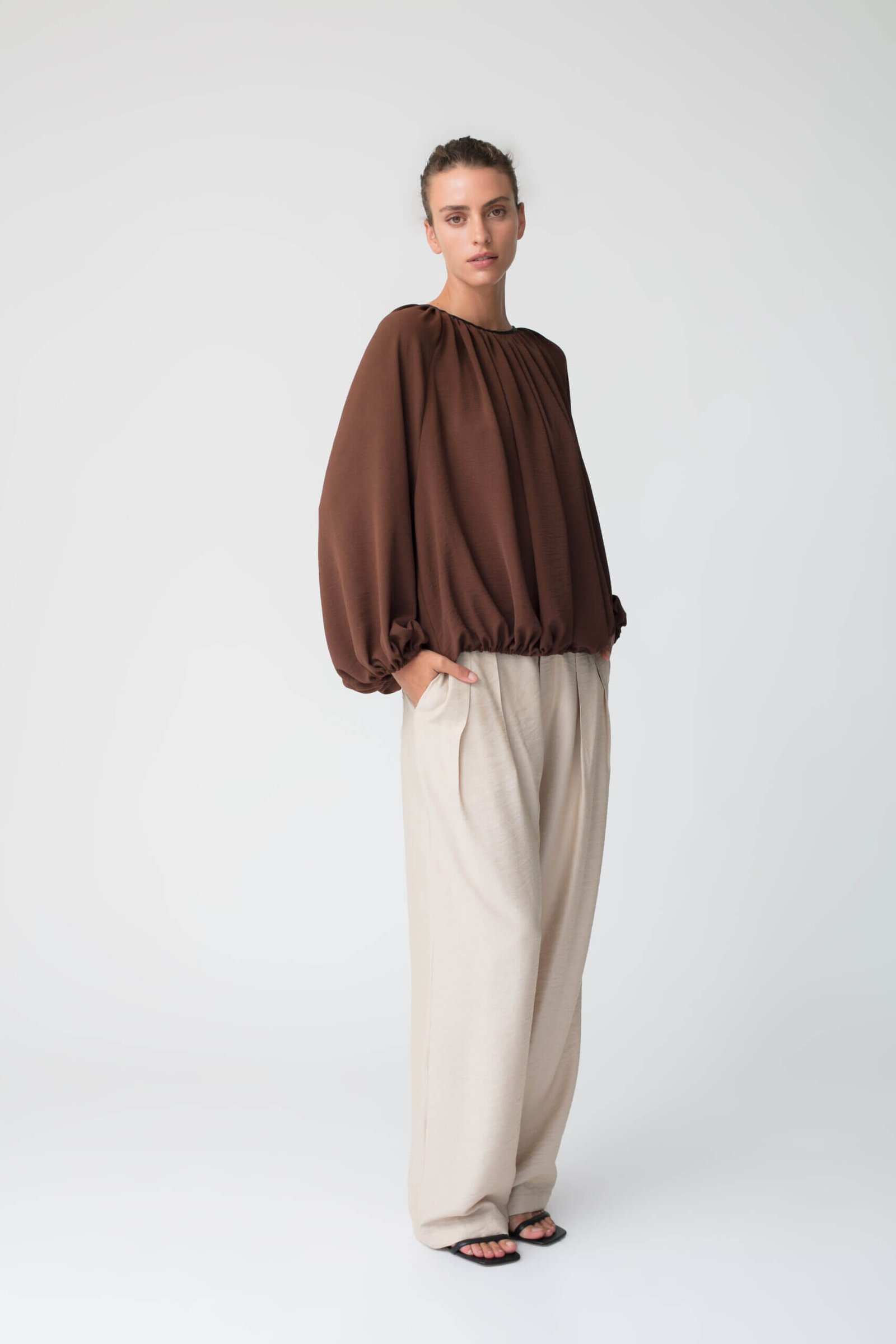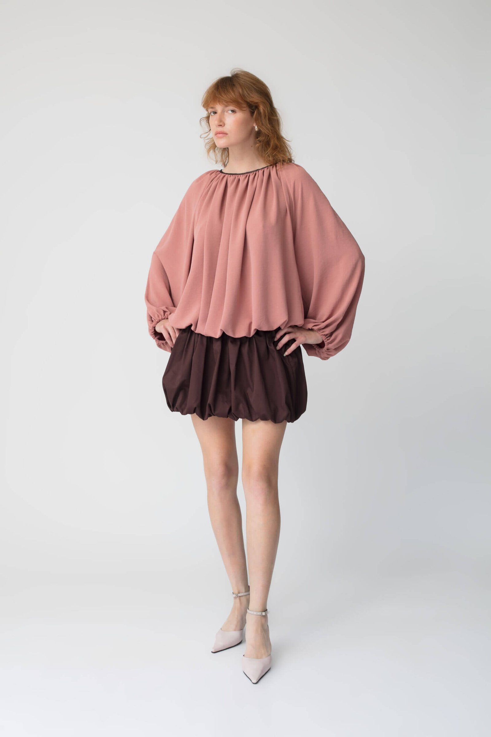 Crafted in fluid crepe, this gathered blouse exudes powerful femininity. Designed with a bateau neckline with ethereal lantern sleeves and a sweeping open back, it is artfully finished by satin ties in contrasting colors. Fits a range of different sizes. Available in 2 colors- Blush and Rust.