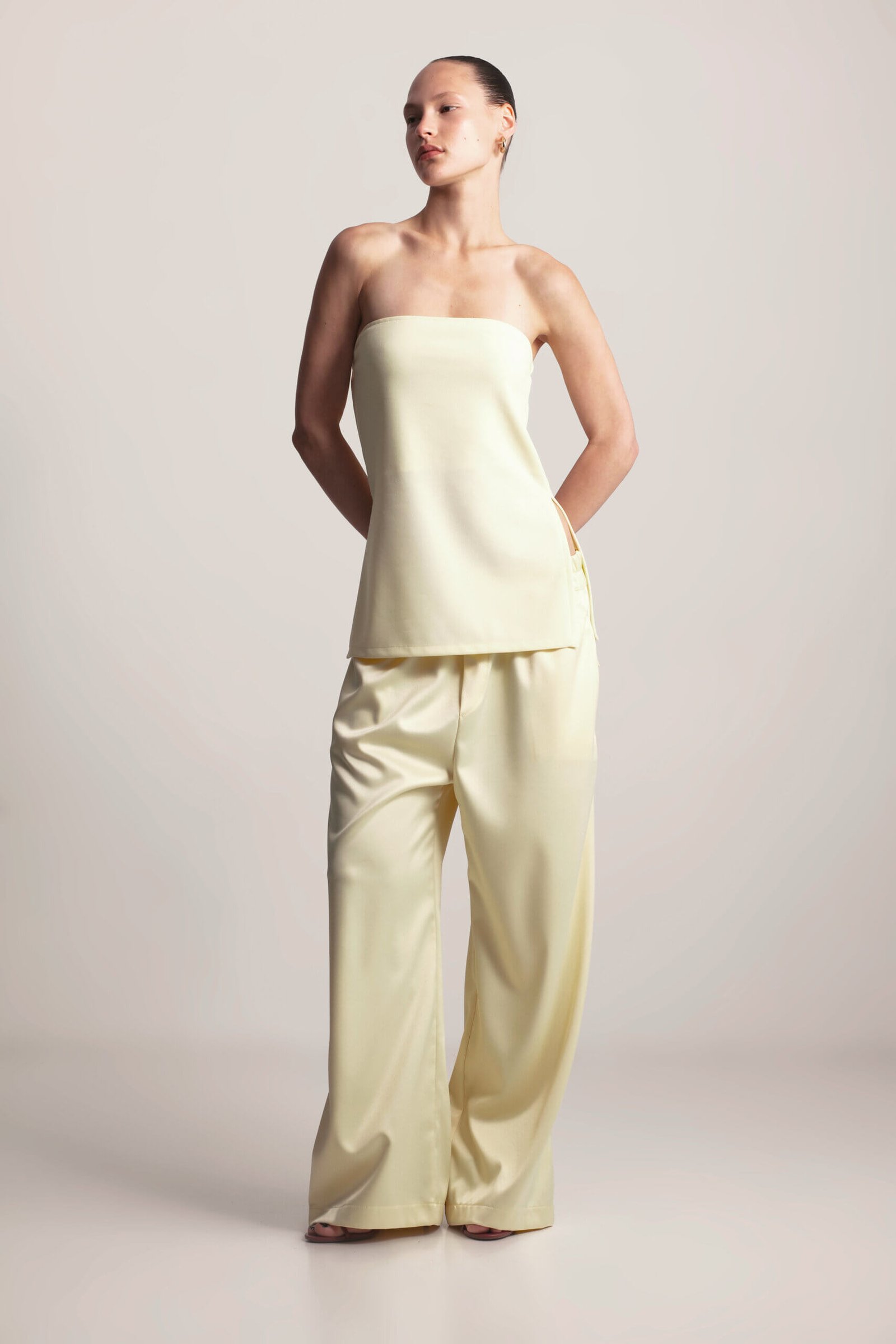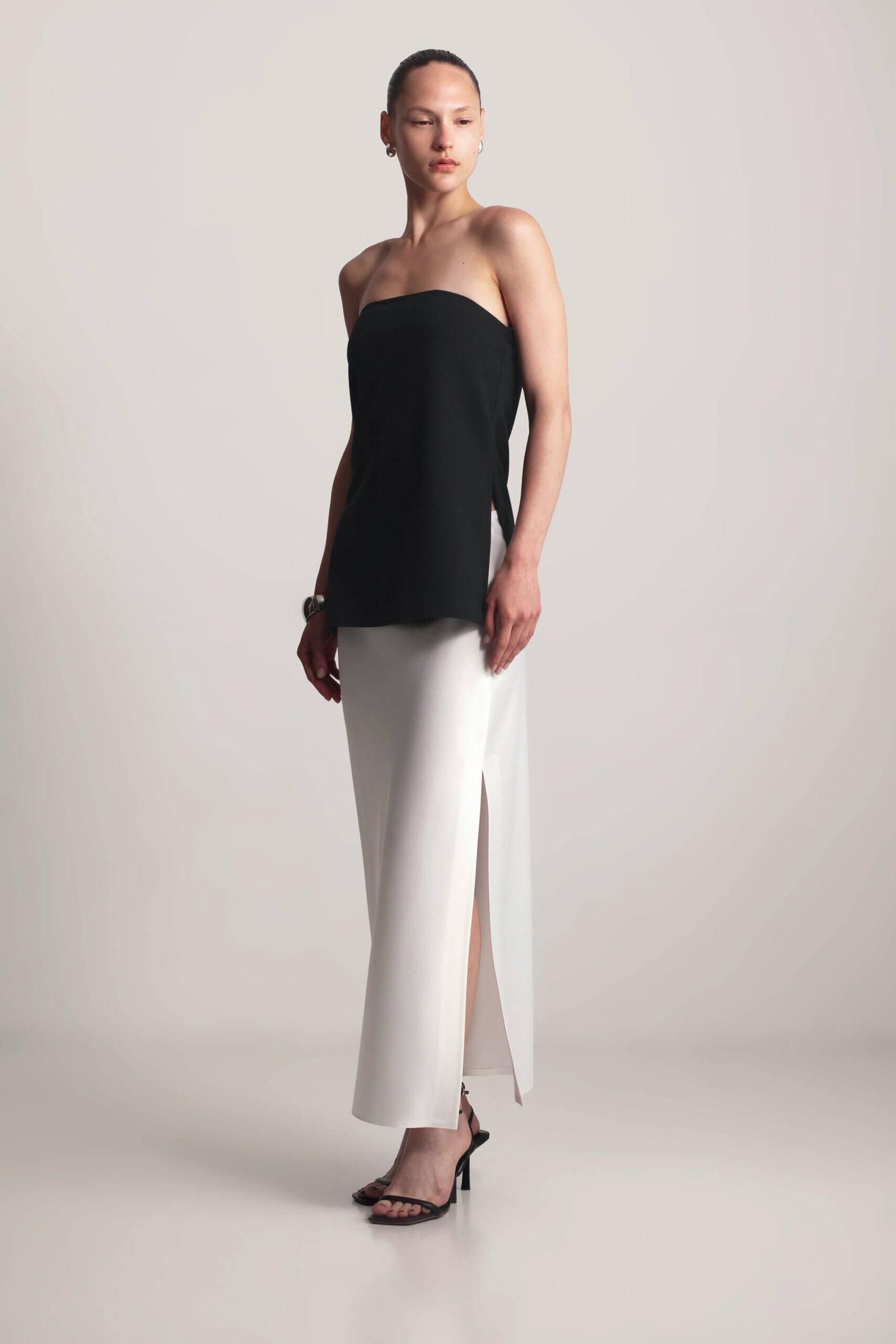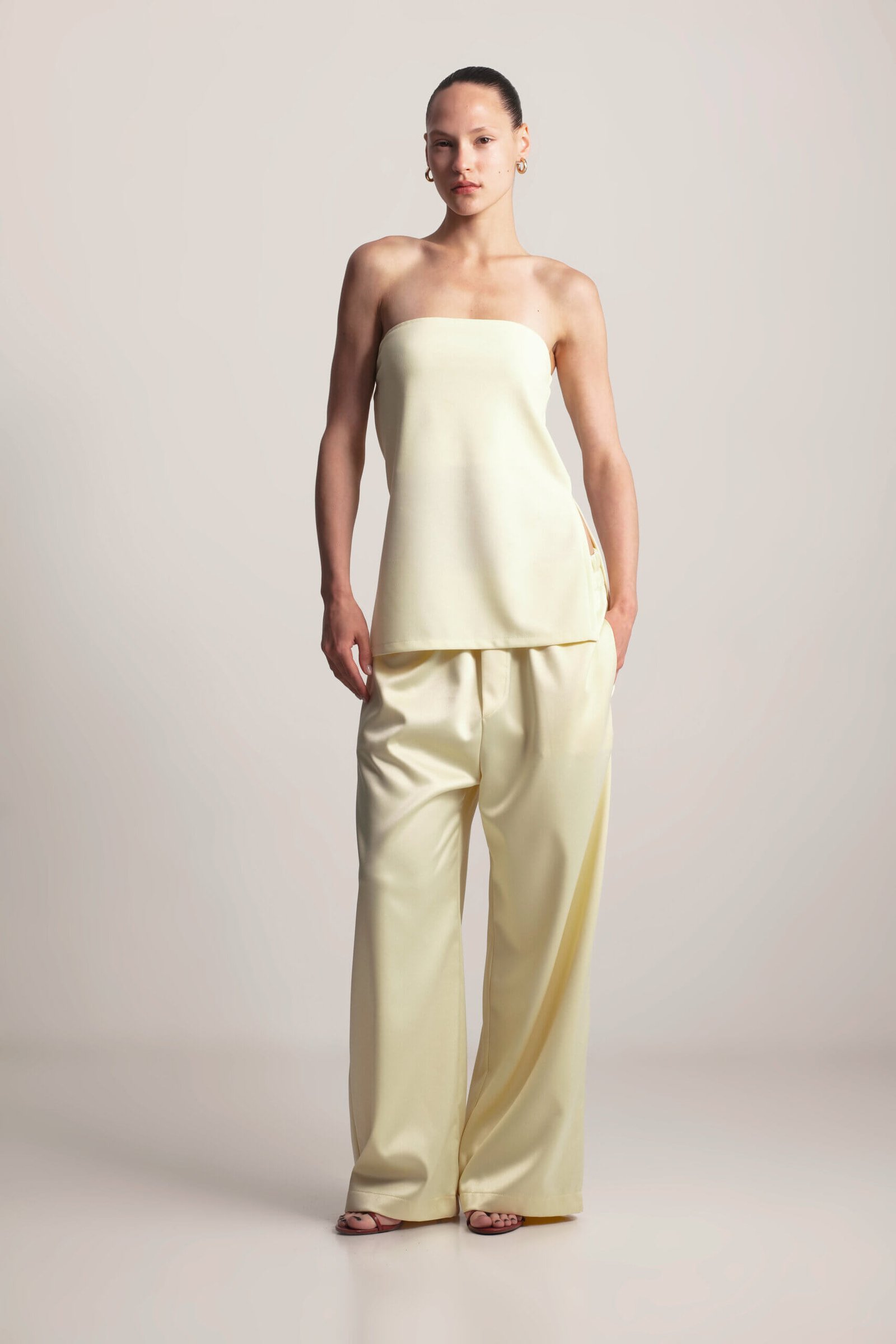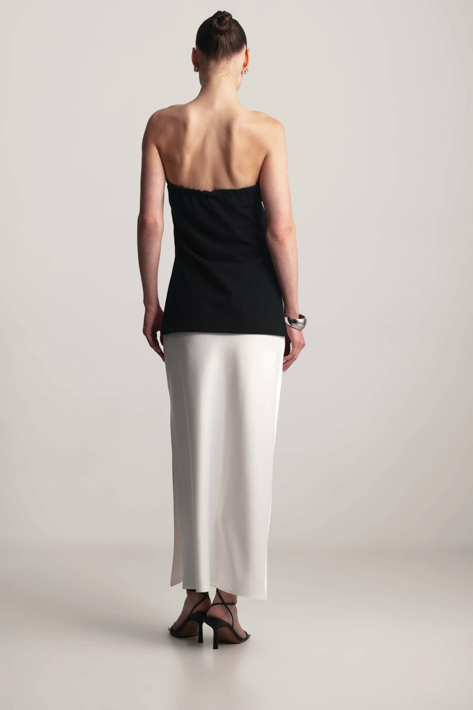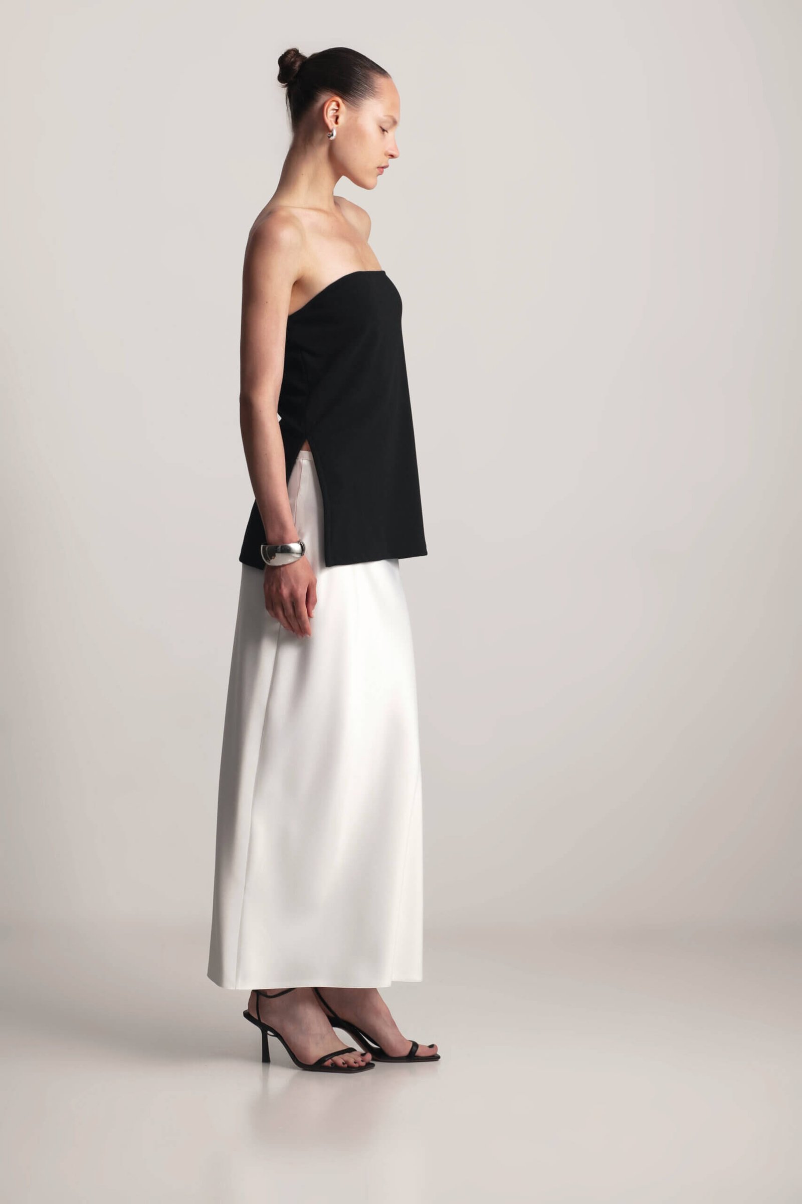 Chic strapless top with side slits and elastic back. This strapless top features a comfortable elastic back and stylish side slits for a modern touch. Perfect for casual days or a night out, it’s versatile enough to pair with a satin skirt or matching pants from the collection for a sleek, monochromatic look. The simple yet flattering design makes it a must-have wardrobe essential.