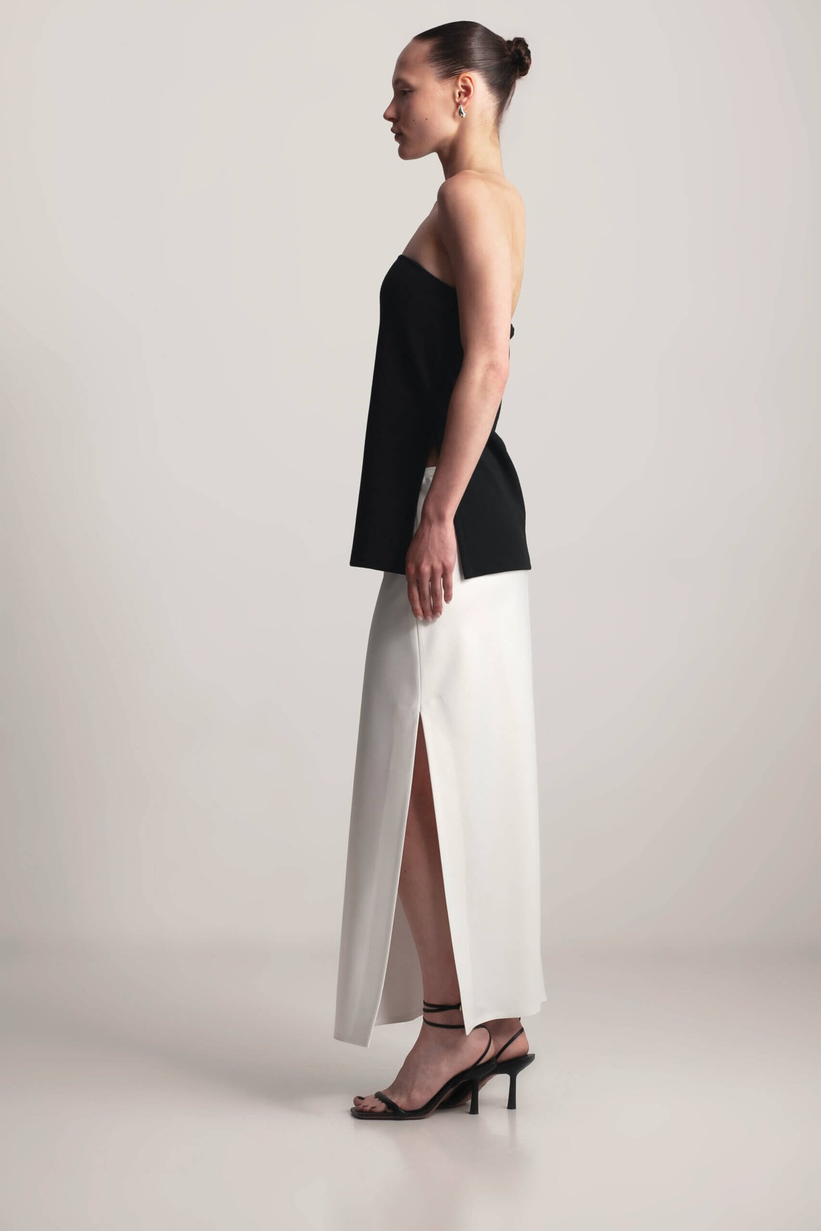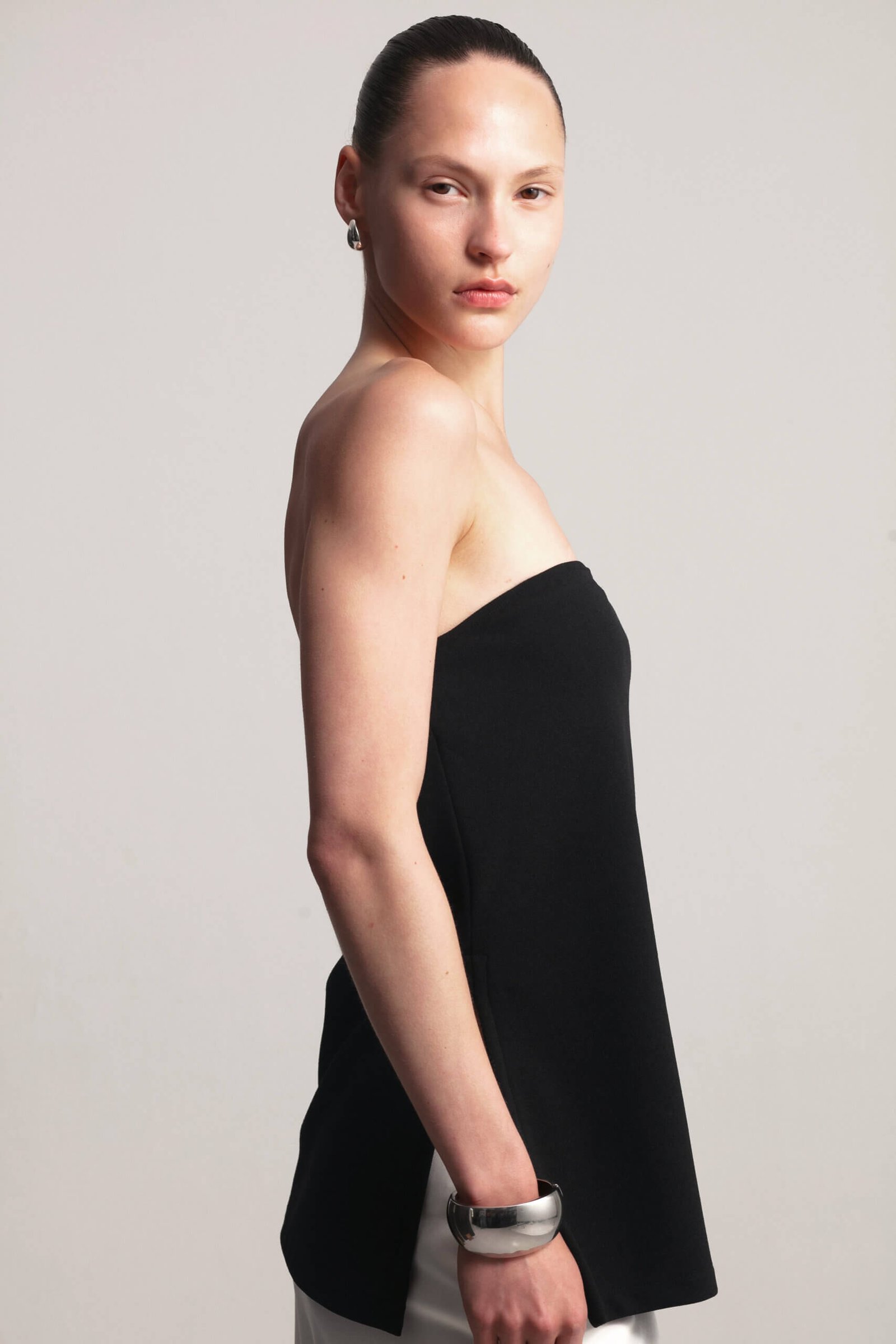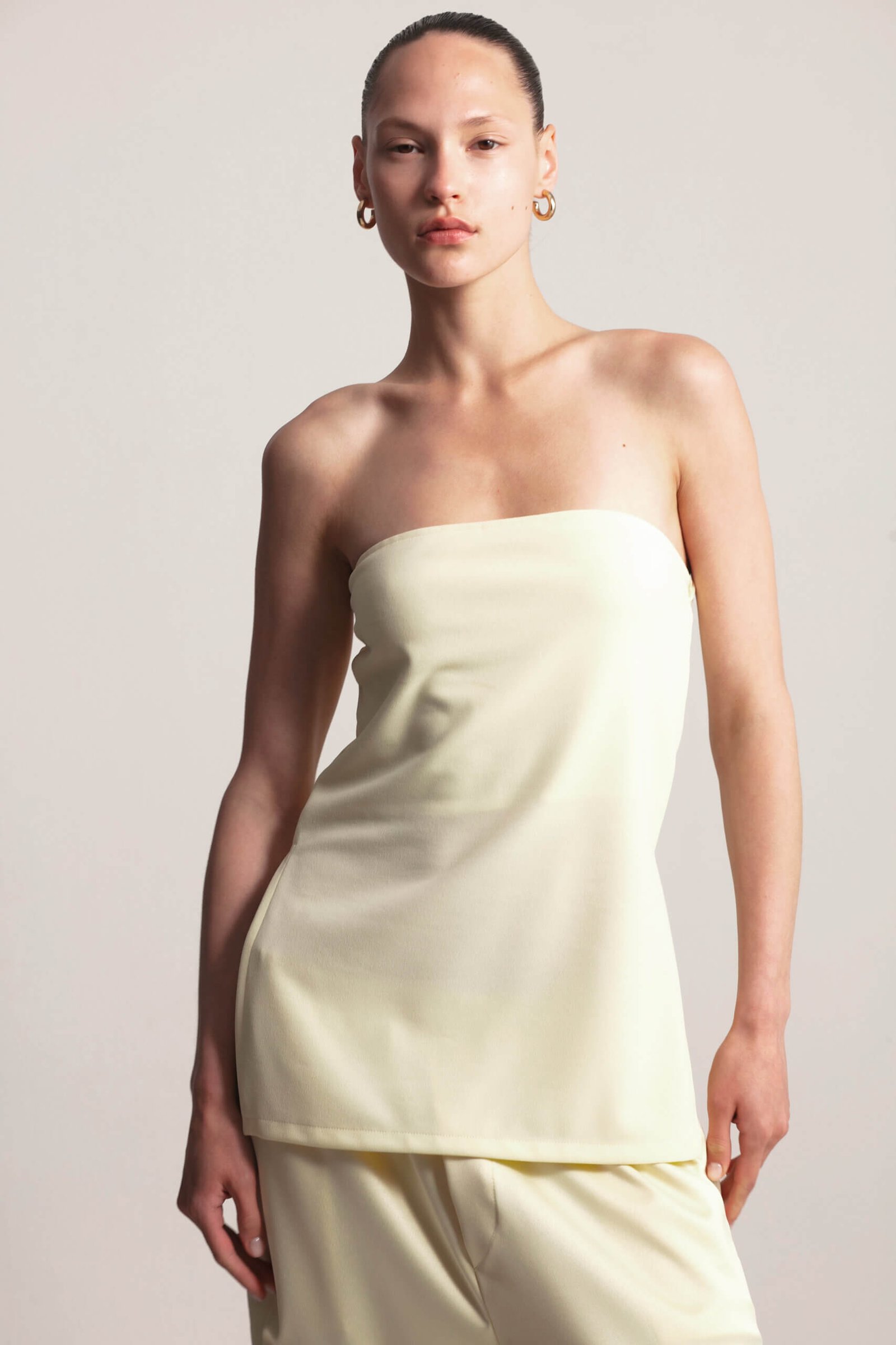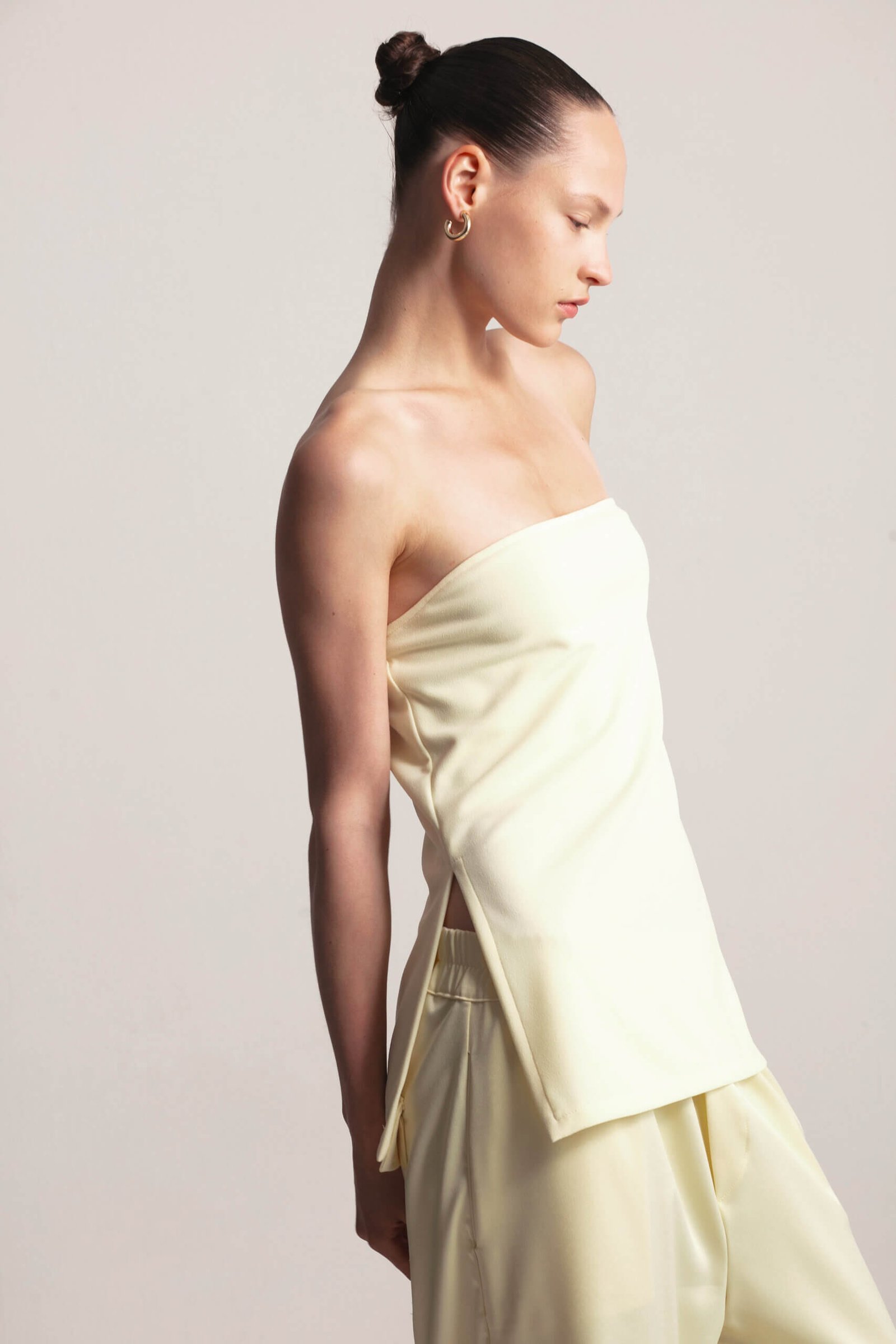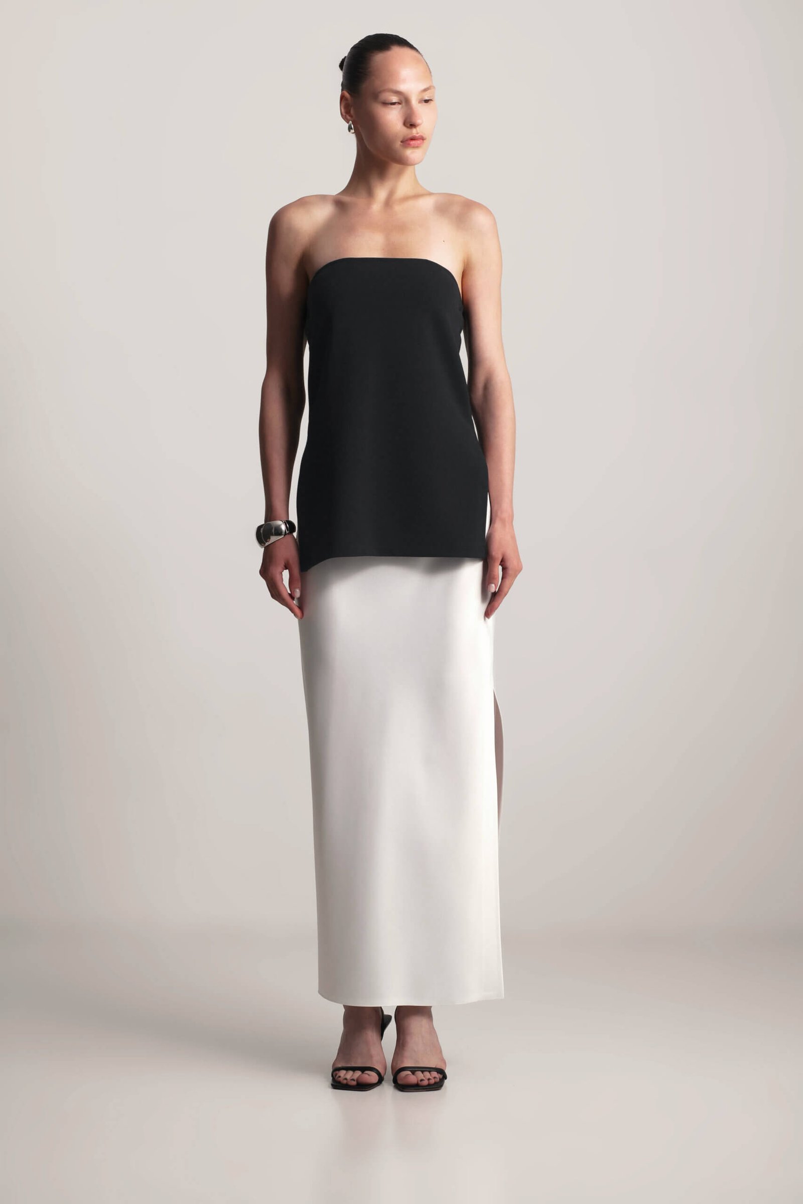 Chic strapless top with side slits and elastic back. This strapless top features a comfortable elastic back and stylish side slits for a modern touch. Perfect for casual days or a night out, it’s versatile enough to pair with a satin skirt or matching pants from the collection for a sleek, monochromatic look. The simple yet flattering design makes it a must-have wardrobe essential.