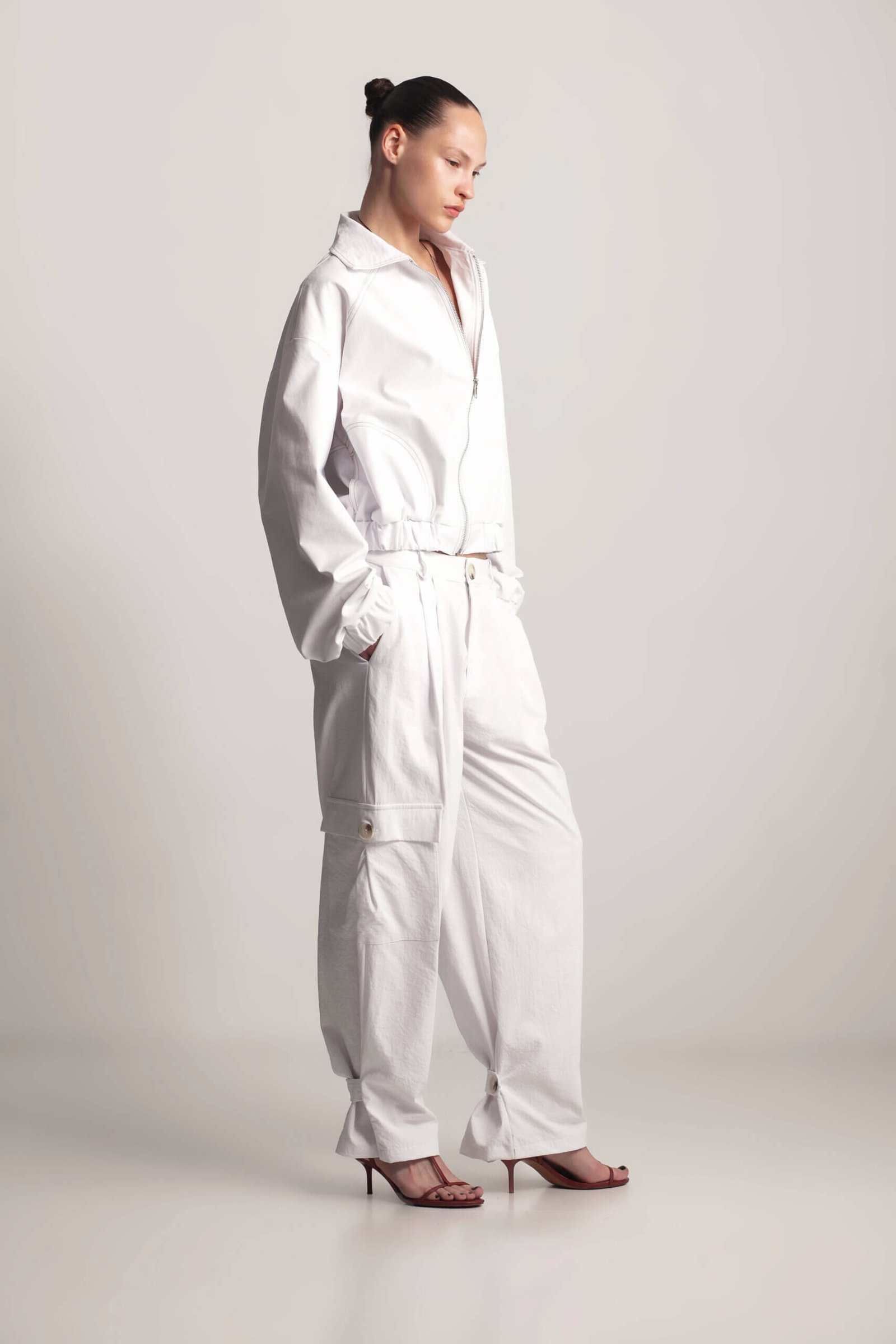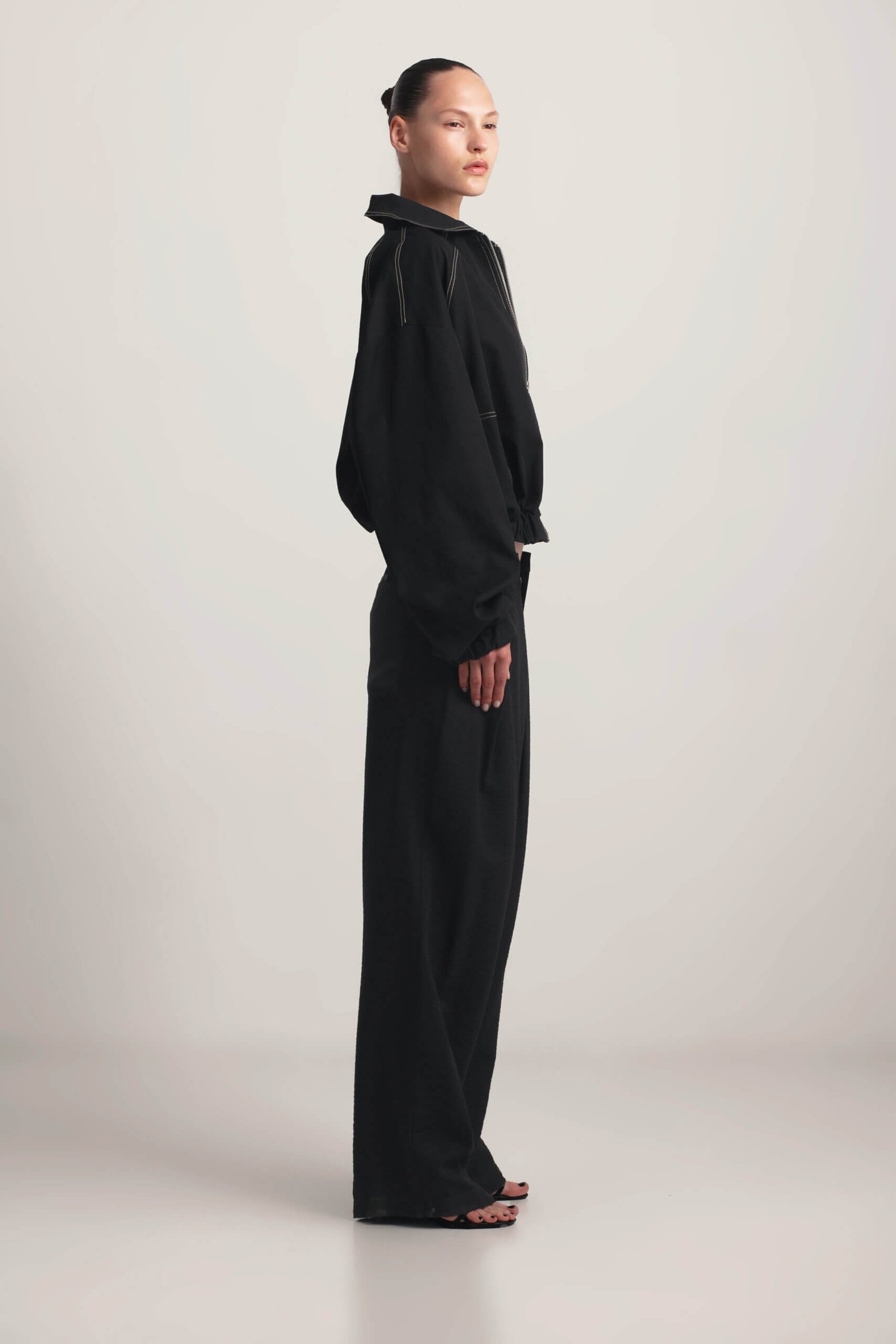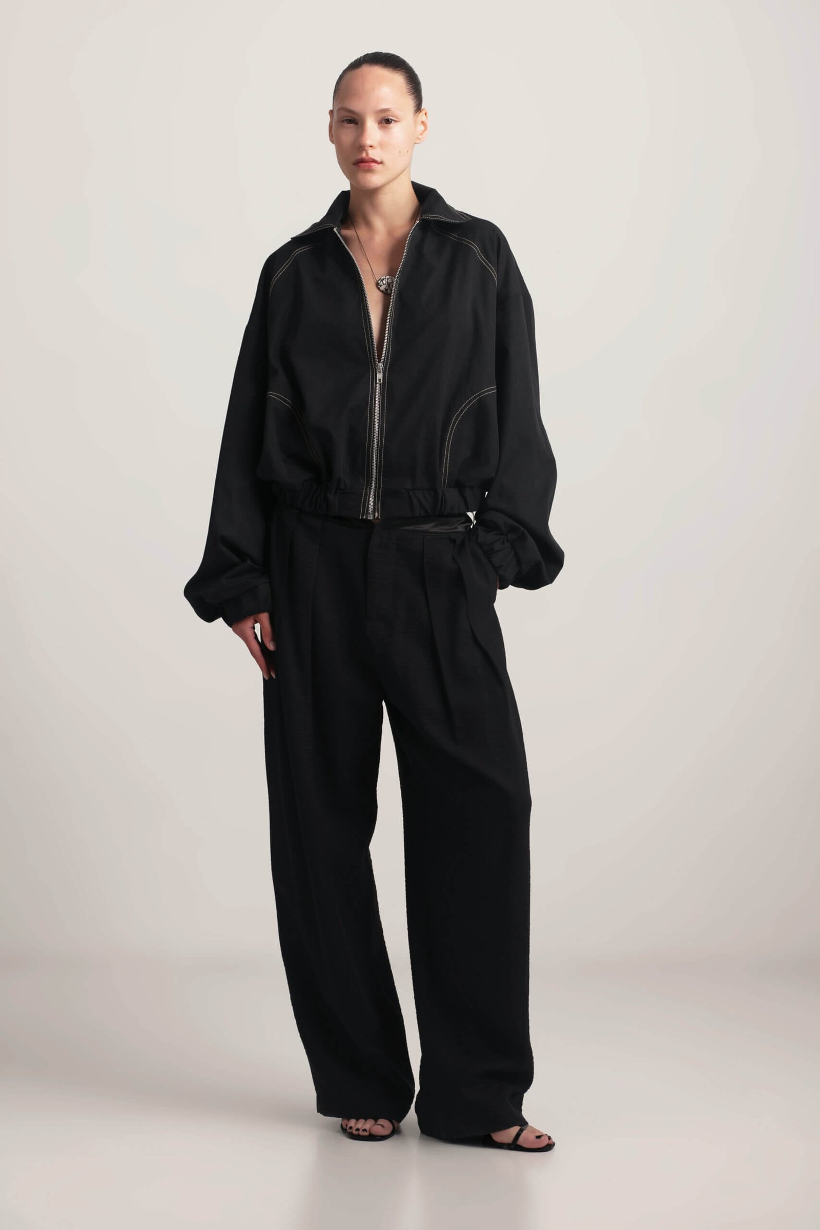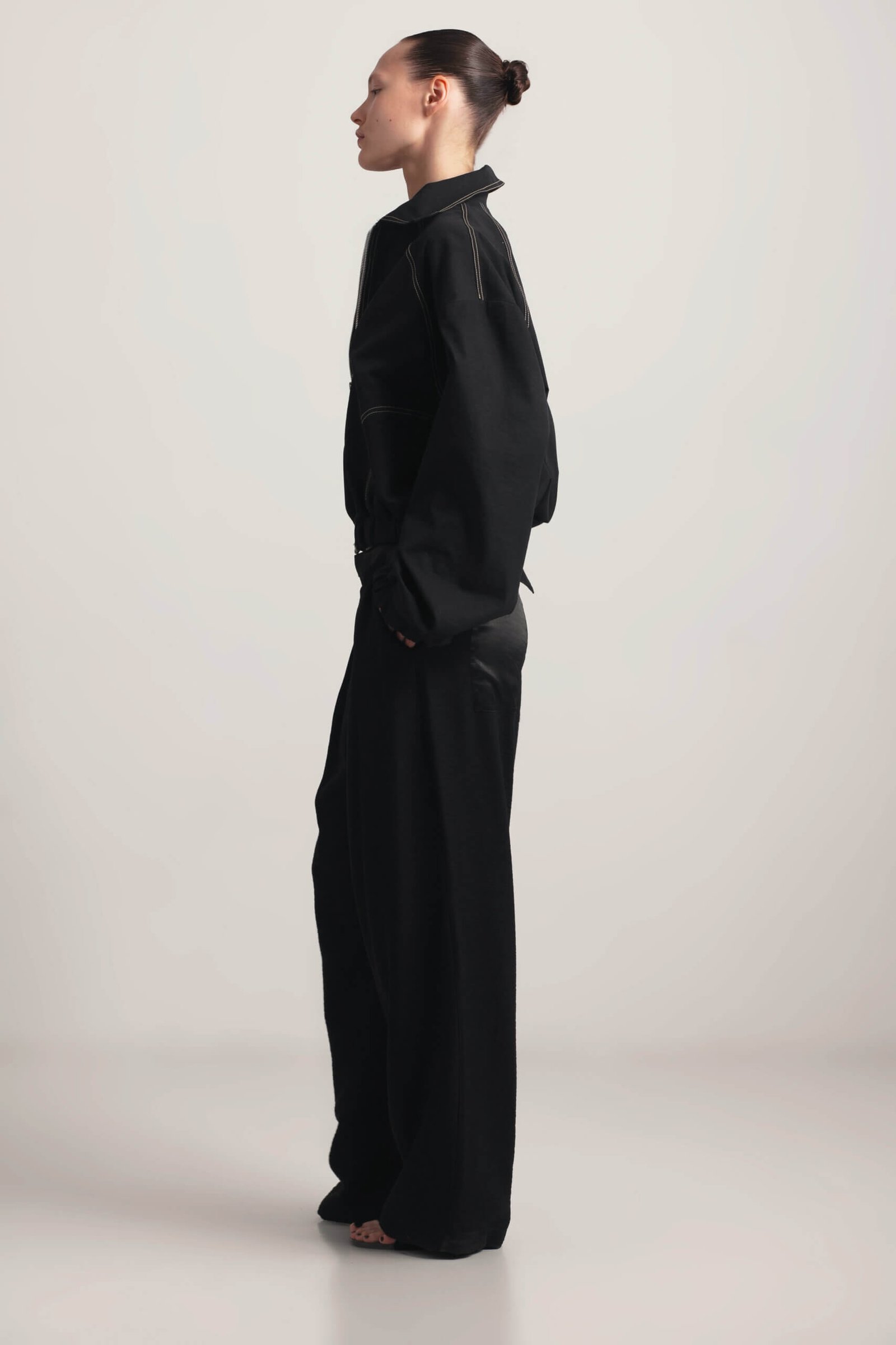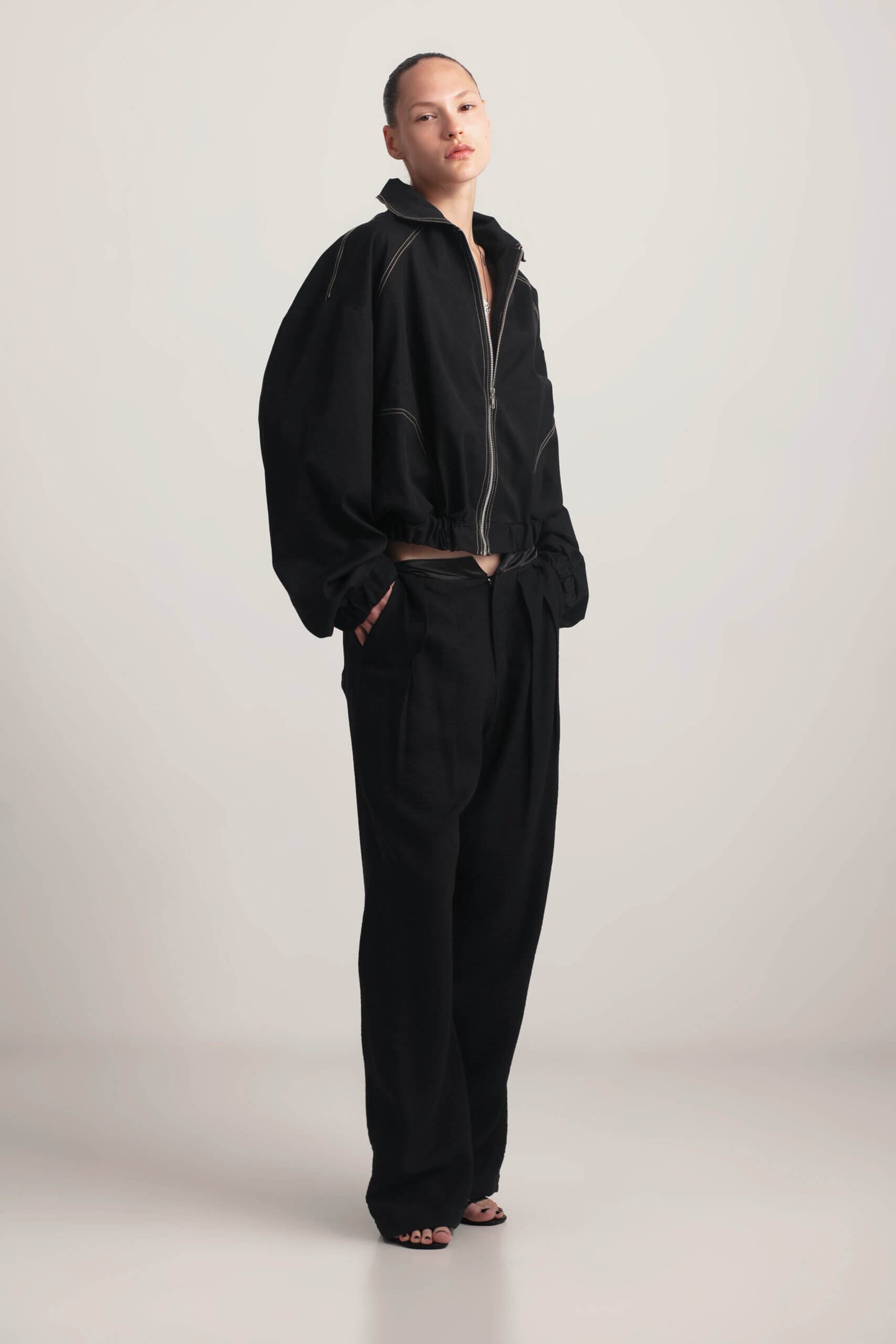 Lightweight short bomber jacket for spring. This short bomber jacket features sand-colored stitching and practical side pockets. With a lightweight design and relaxed fit, it’s the perfect spring staple and will become A versatile and stylish wardrobe essential.