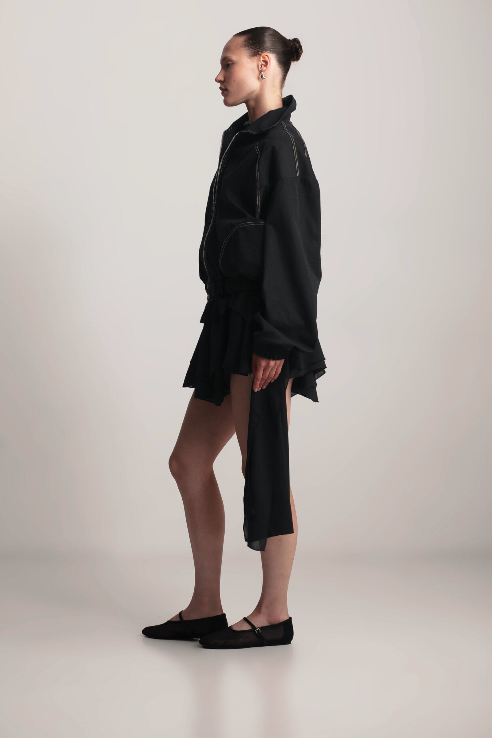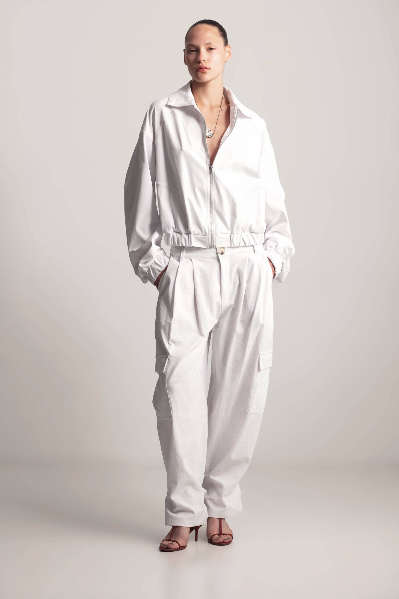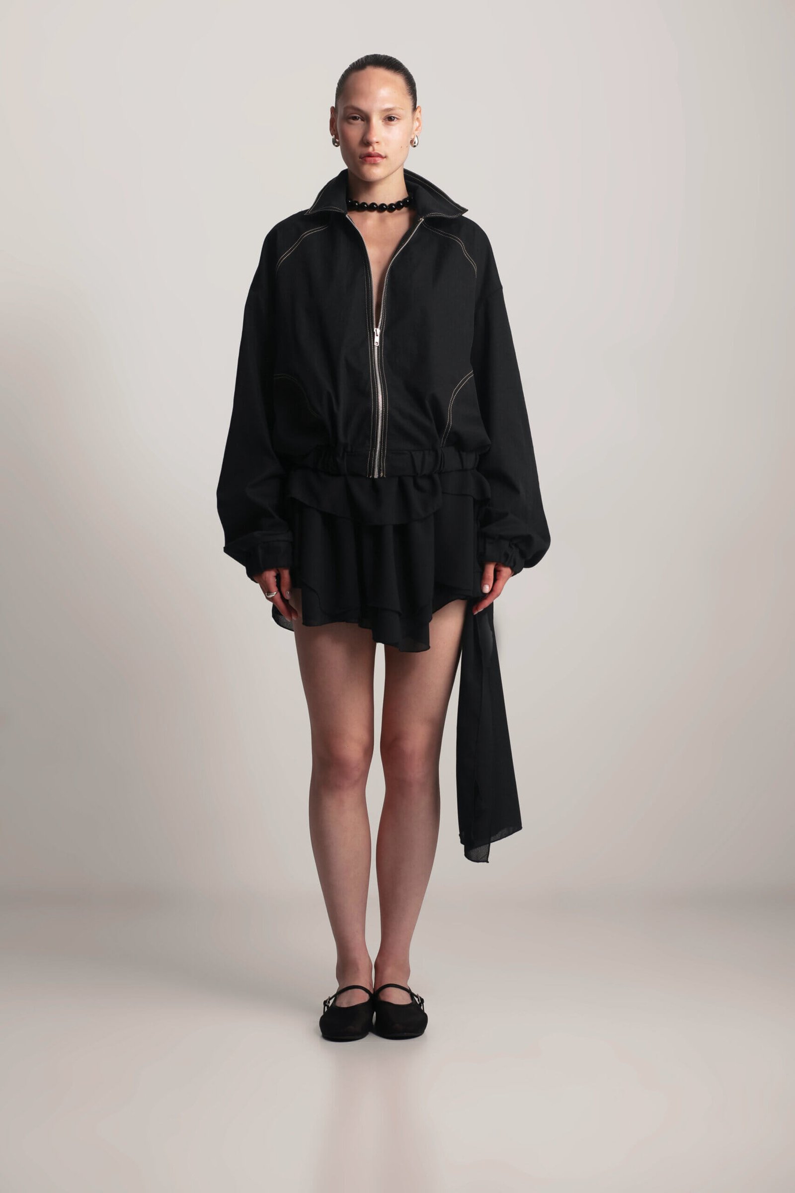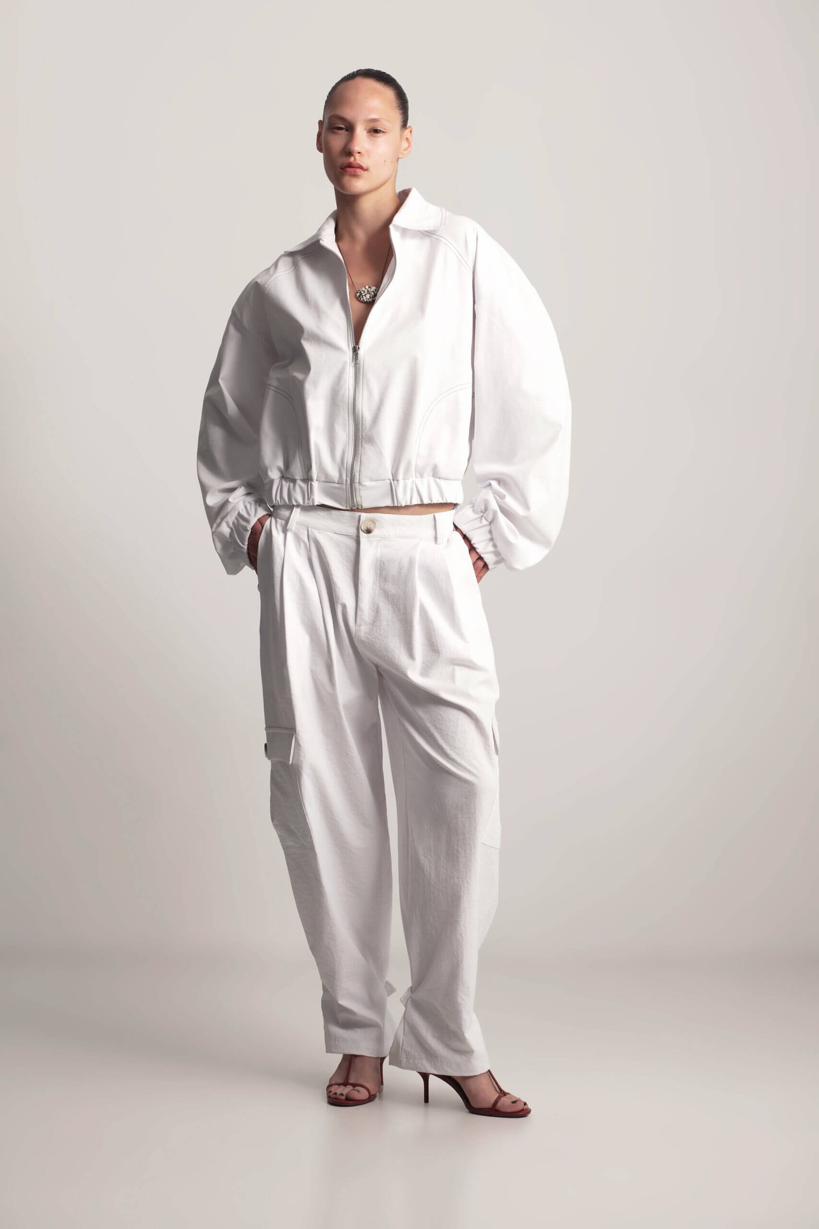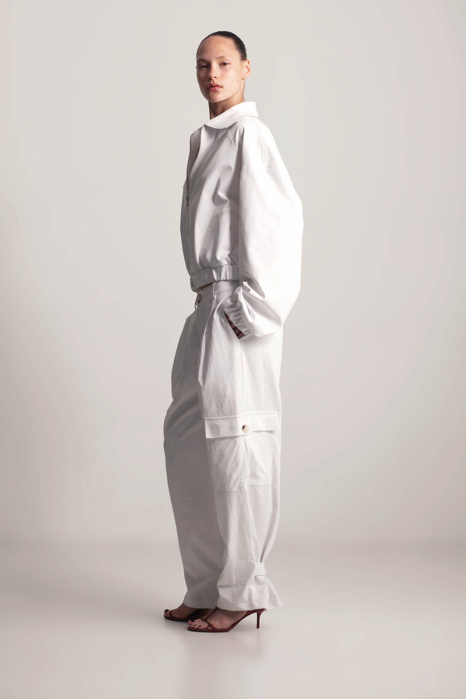 Lightweight short bomber jacket for spring. This short bomber jacket features sand-colored stitching and practical side pockets. With a lightweight design and relaxed fit, it’s the perfect spring staple and will become A versatile and stylish wardrobe essential.